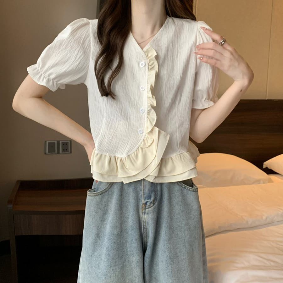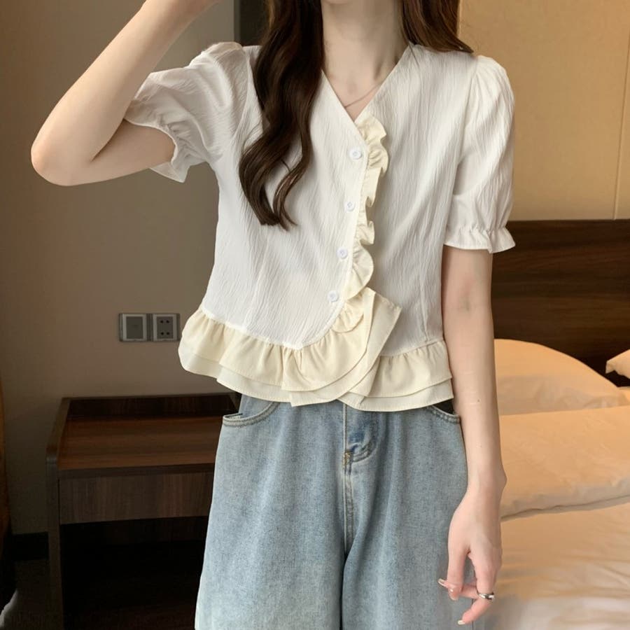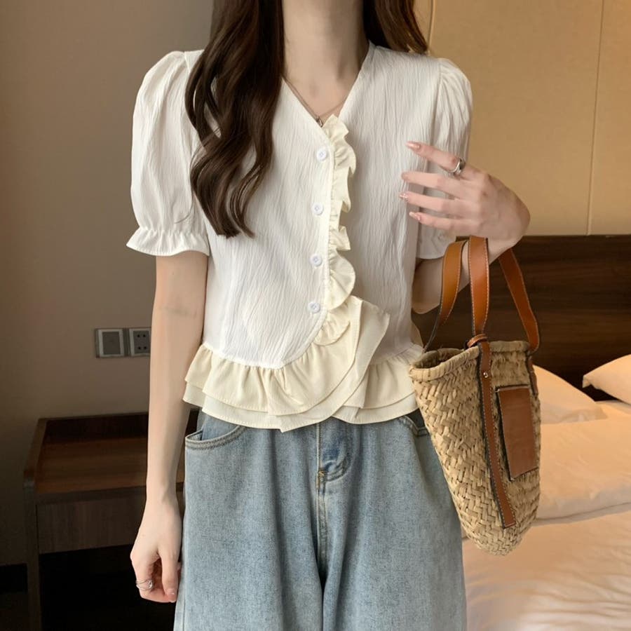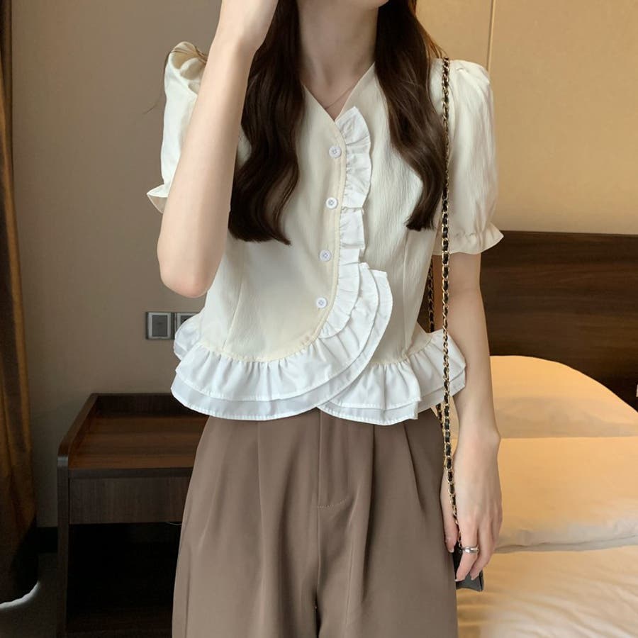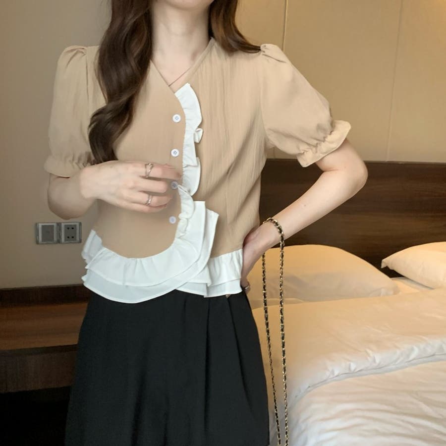 【赤字覚悟!処分セール】トップスブラウスパフスリーブⅤネックフリルオシャレ