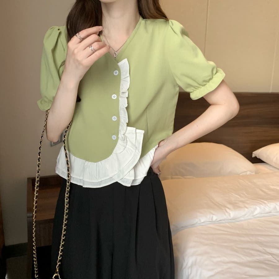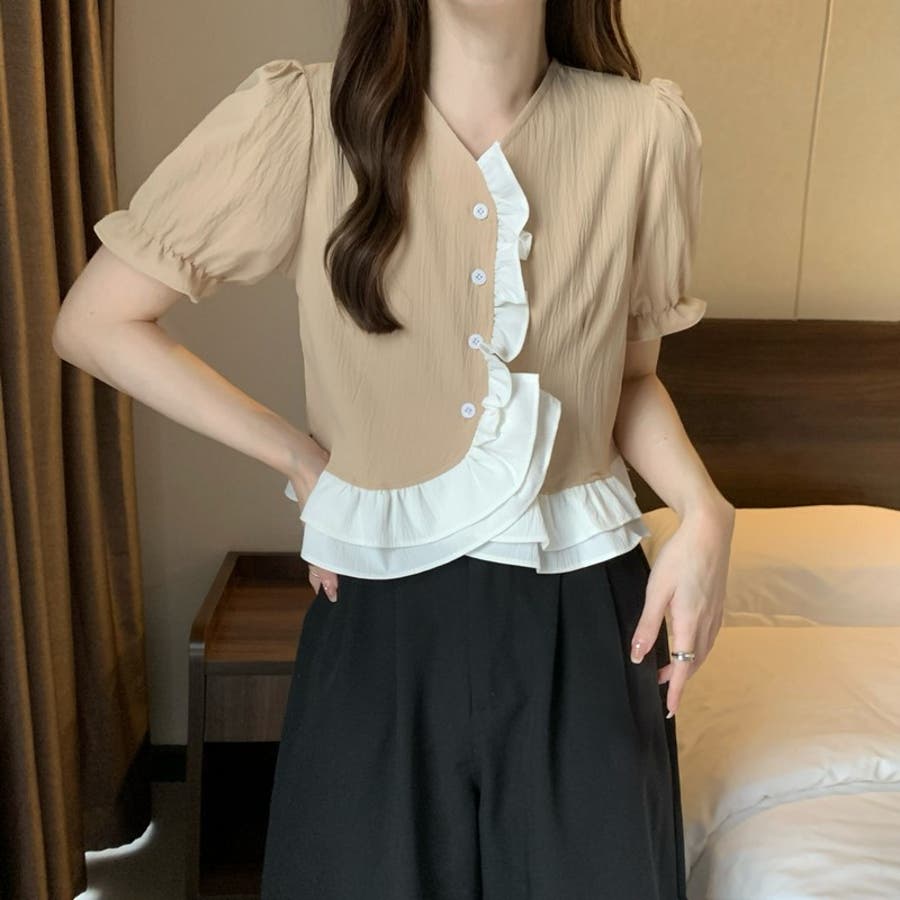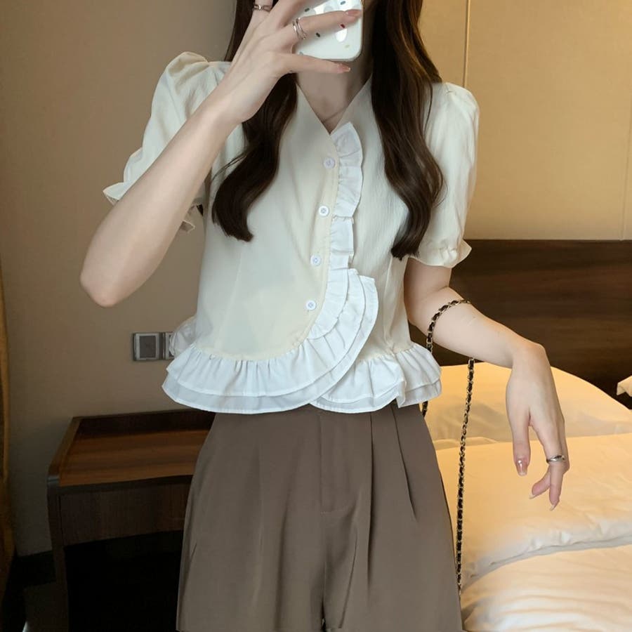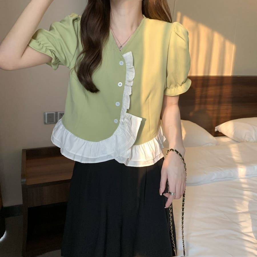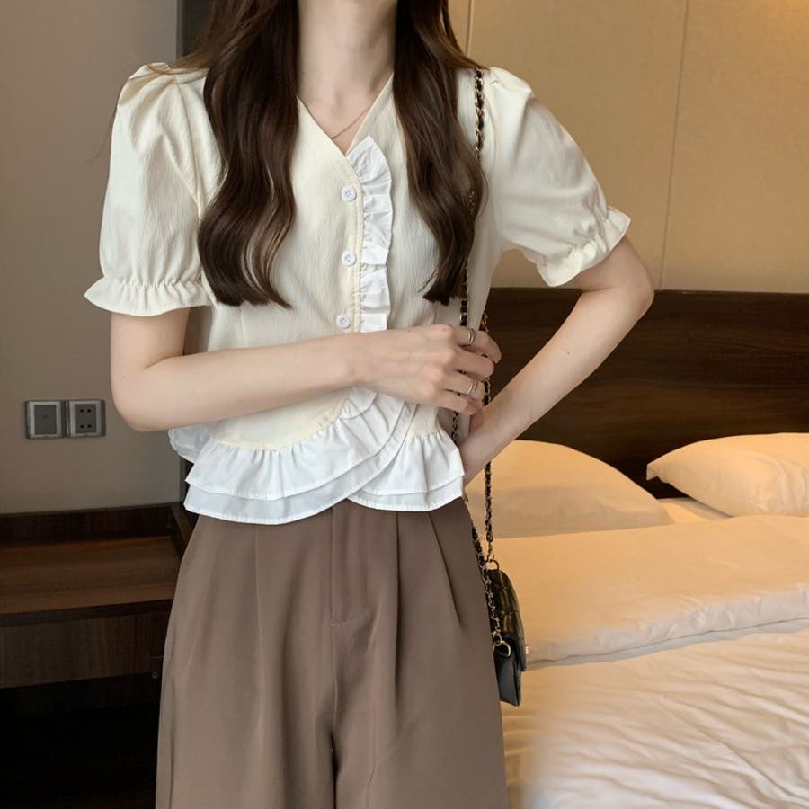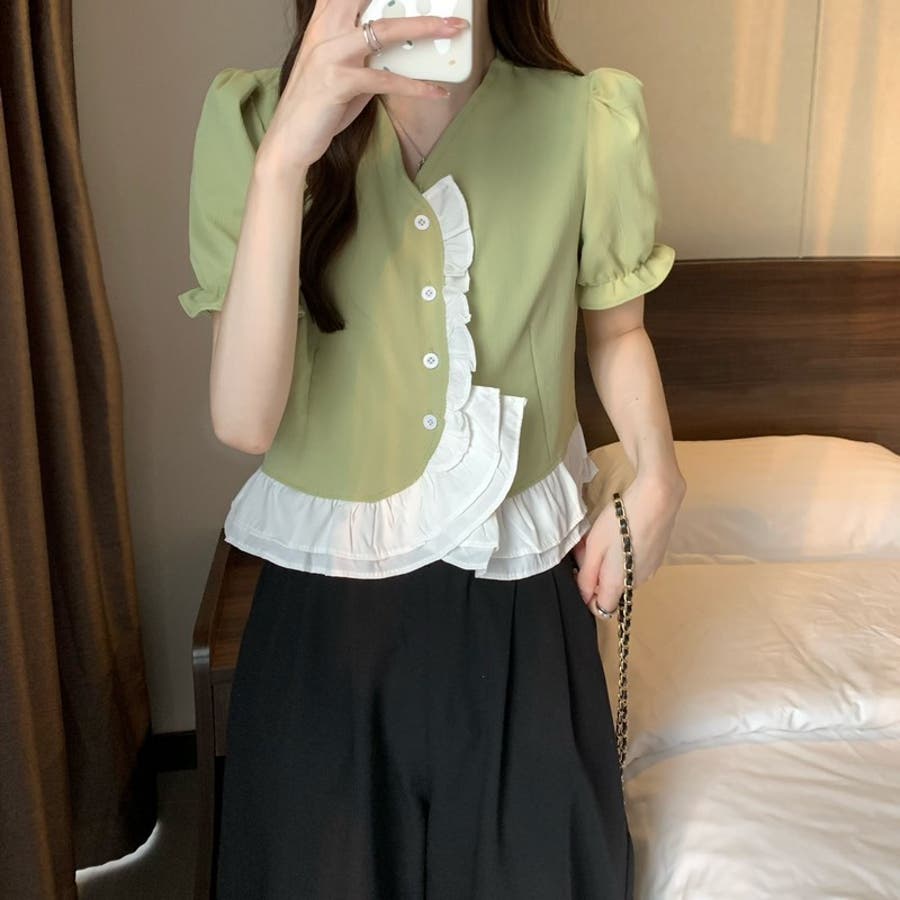 【赤字覚悟!処分セール】トップスブラウスパフスリーブⅤネックフリルオシャレ