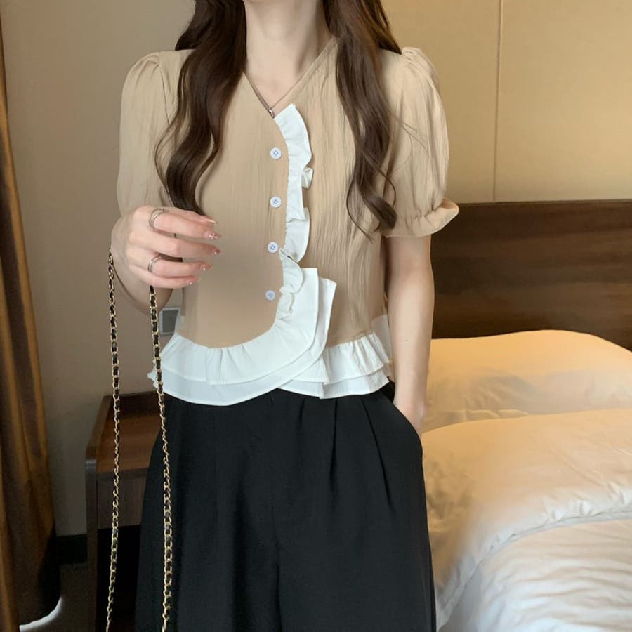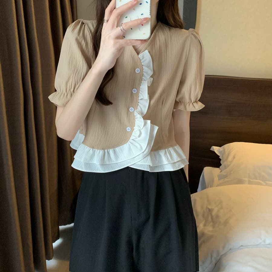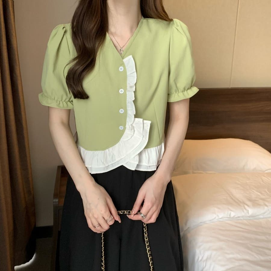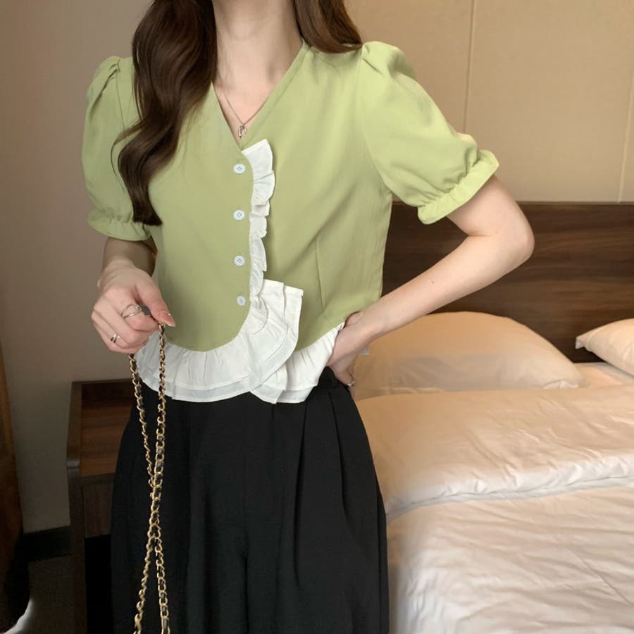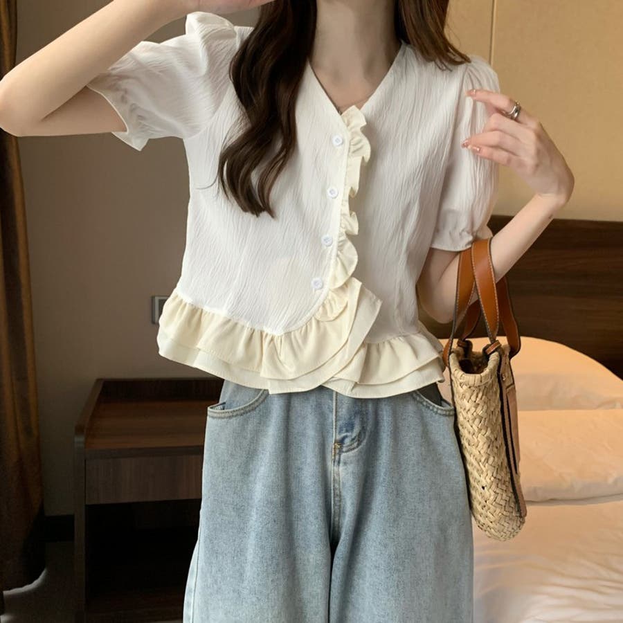 【赤字覚悟!処分セール】トップスブラウスパフスリーブⅤネックフリルオシャレ