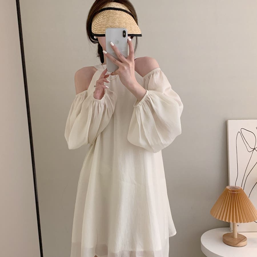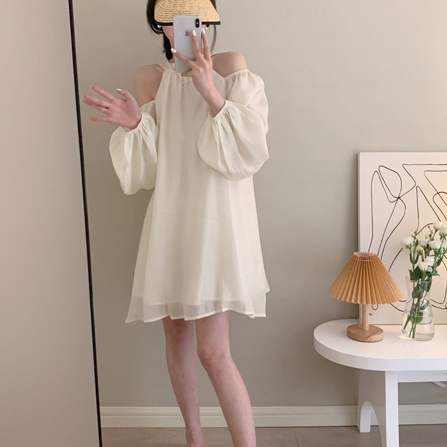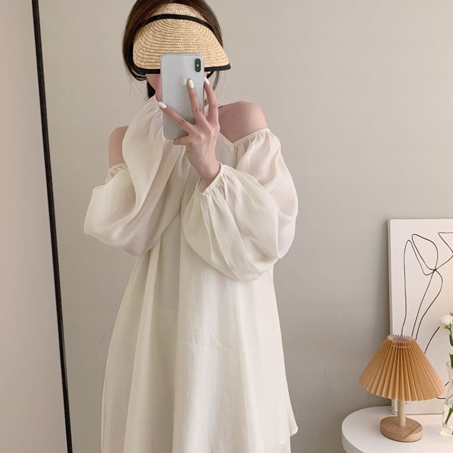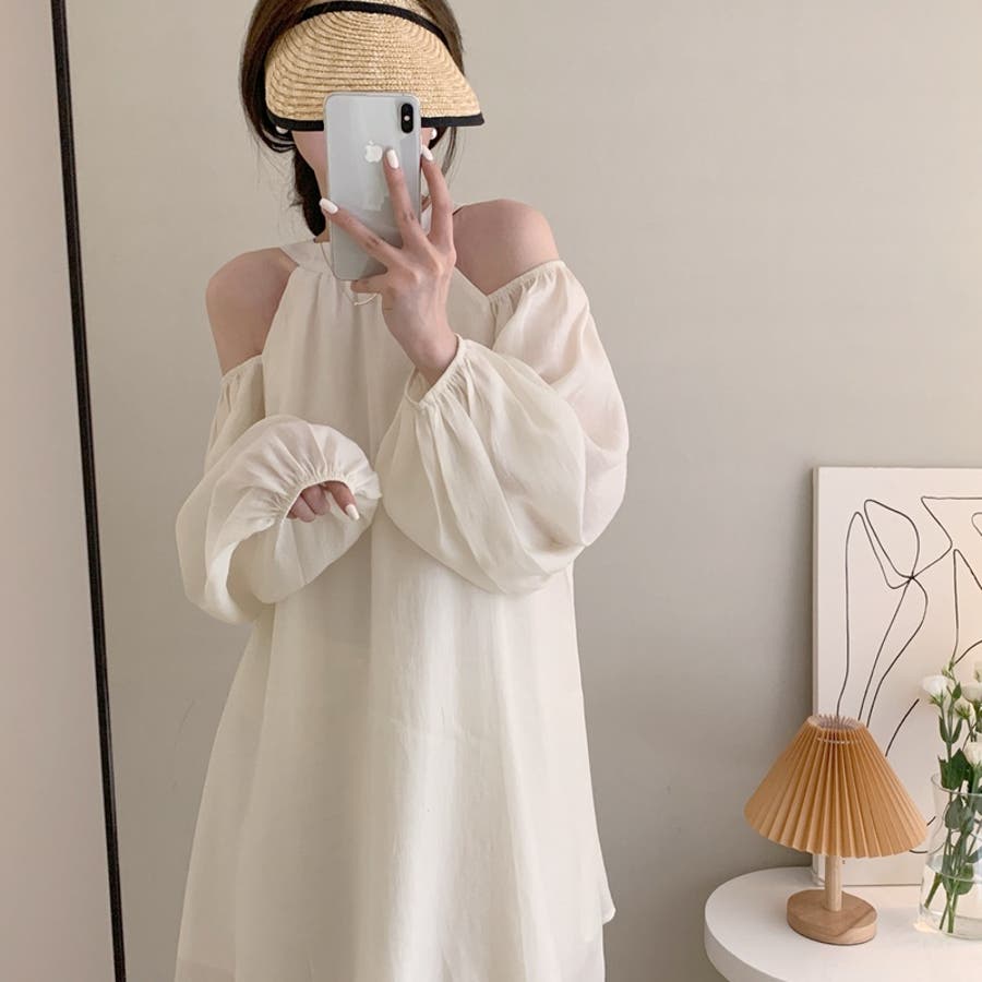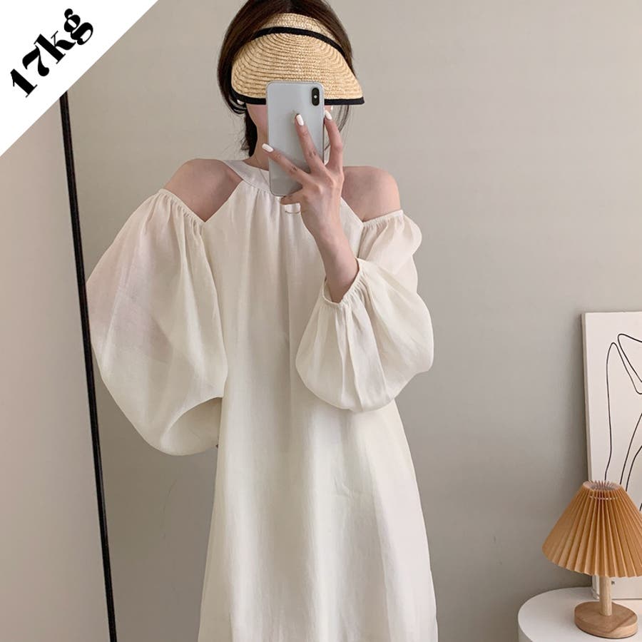 【赤字覚悟!処分セール】春夏ワンピースひざ丈長袖肩落とし体型カバー着?せ可愛いき…