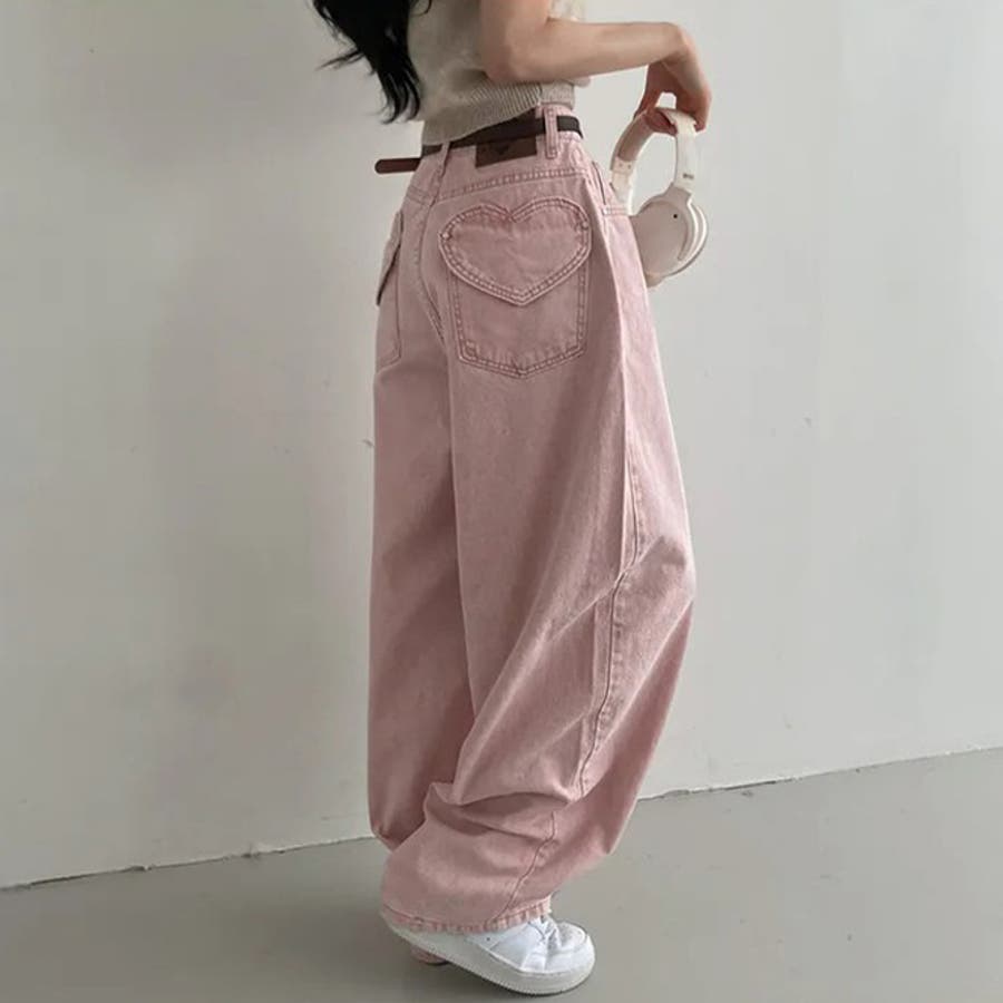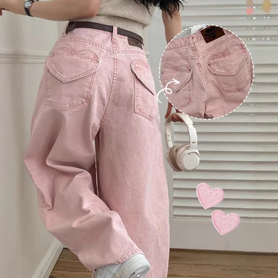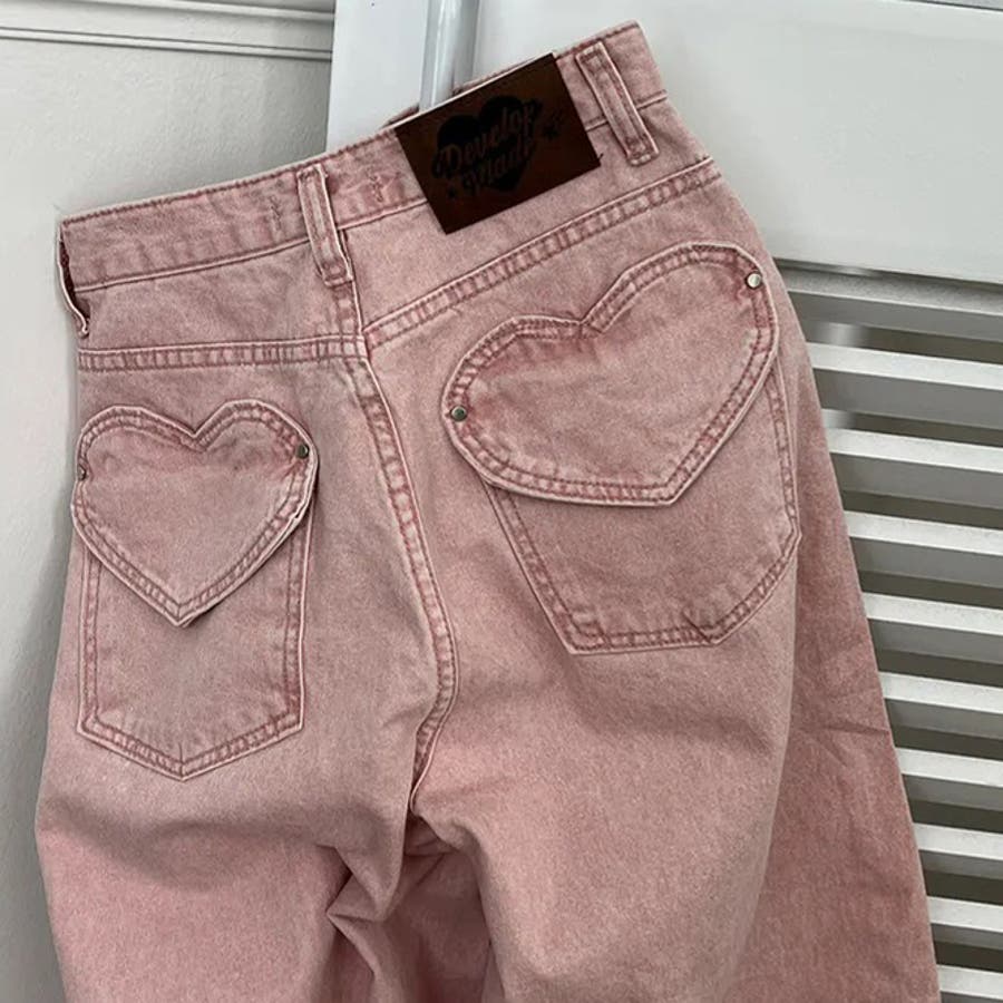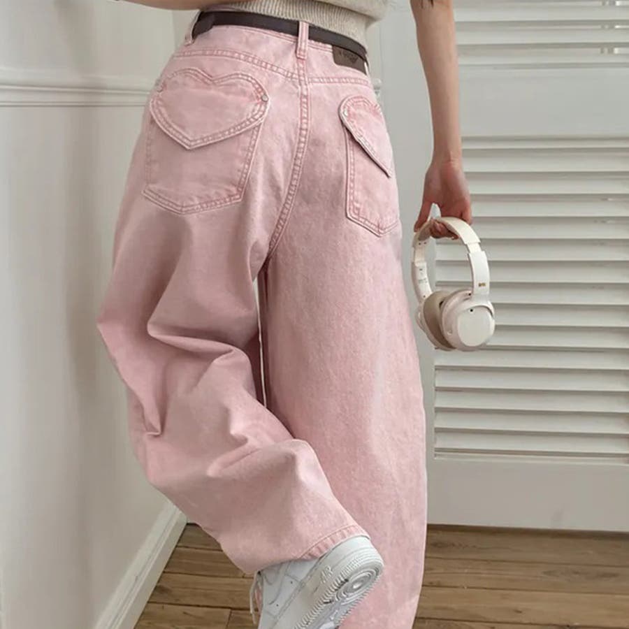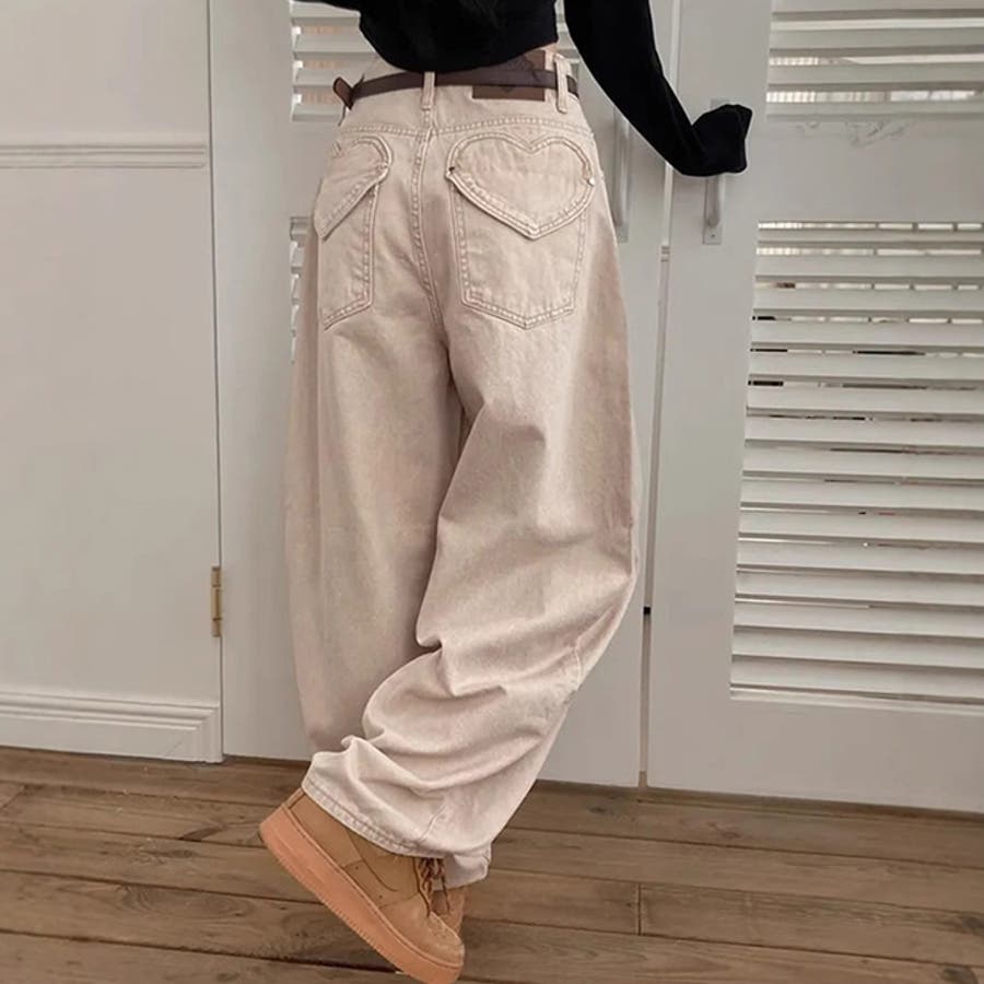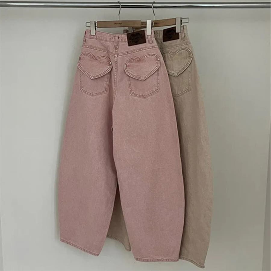 甘辛系ガールズ☆ハイウエスト ハート ポケット ワイドデニムパンツ