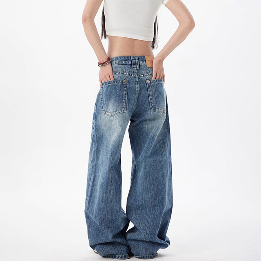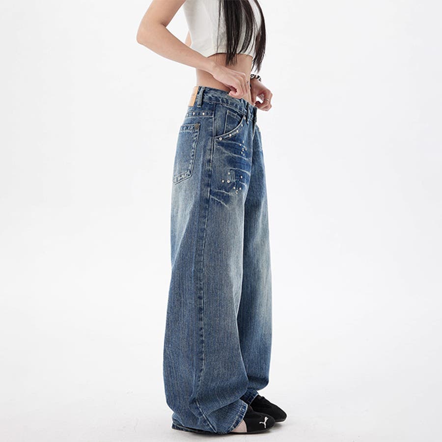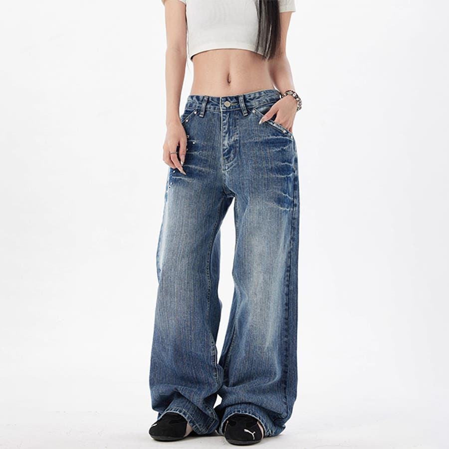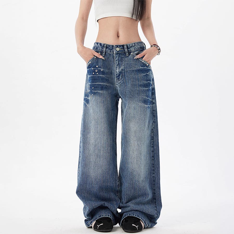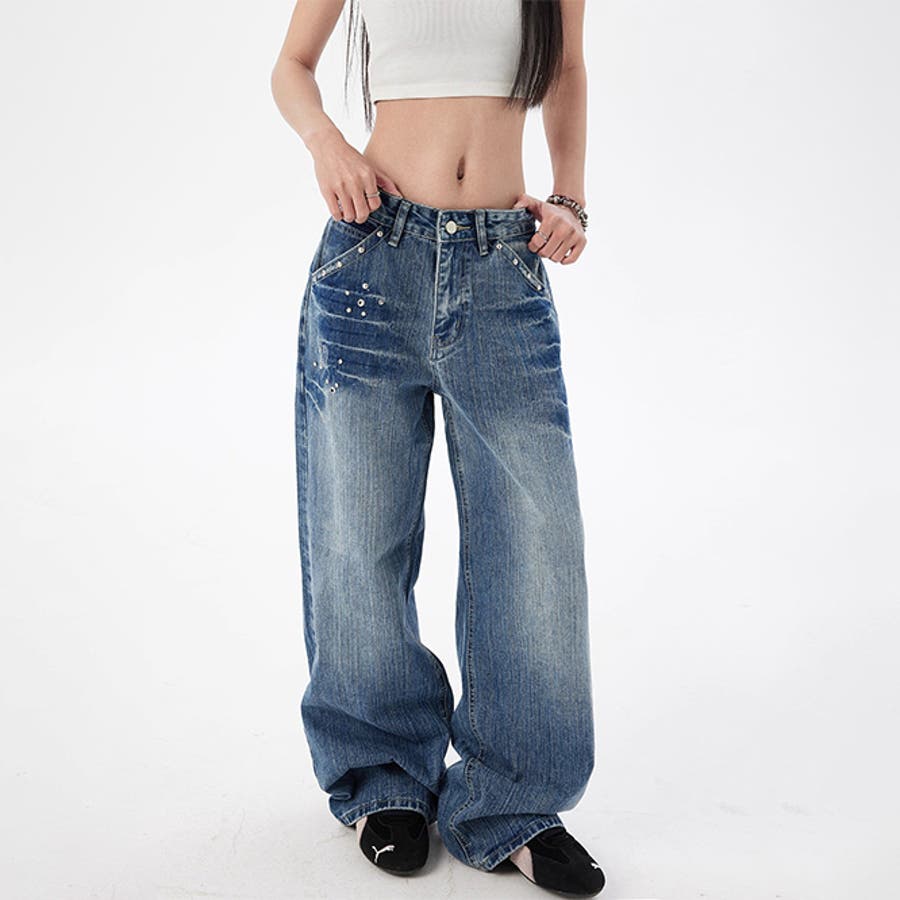 ユニセックス☆スタッズ デニムパンツ ヴィンテージ ウォッシュ
