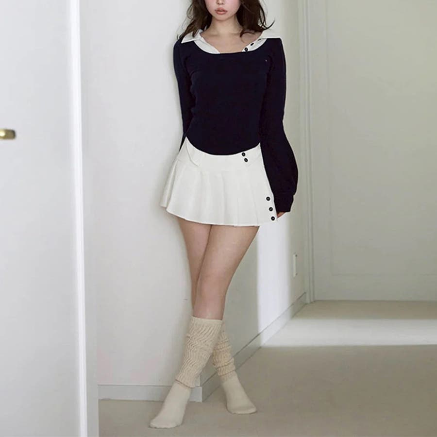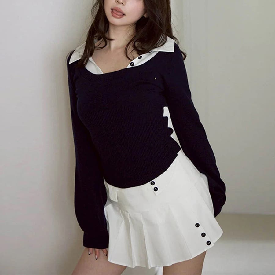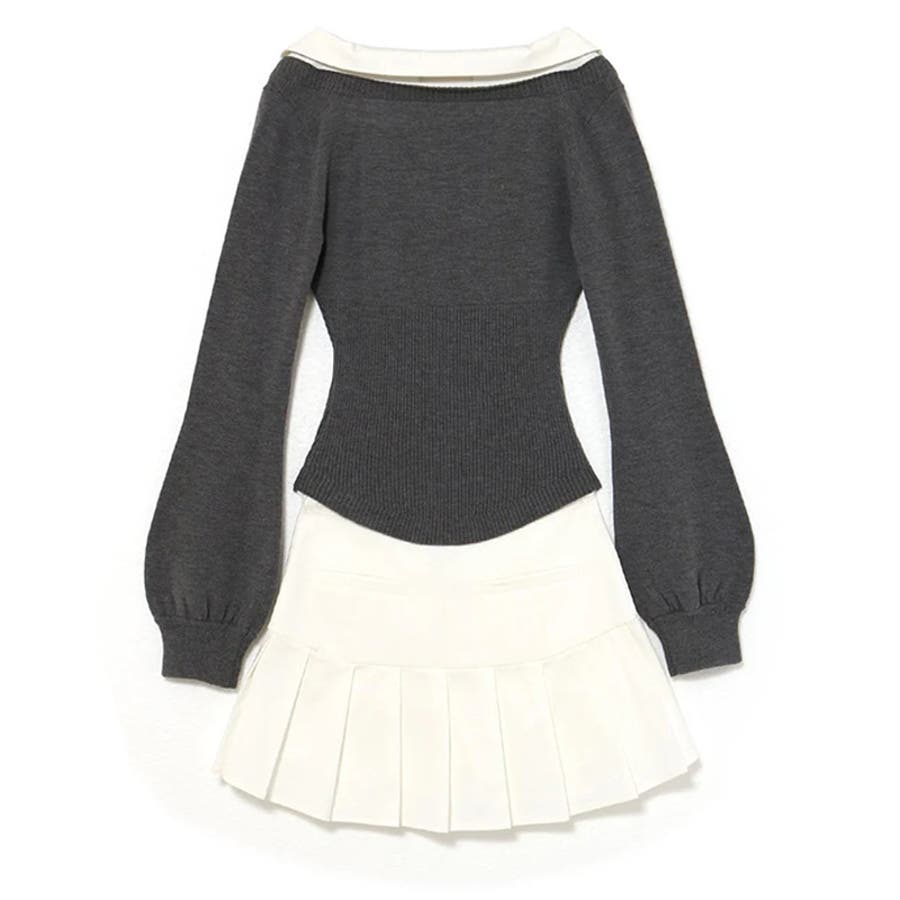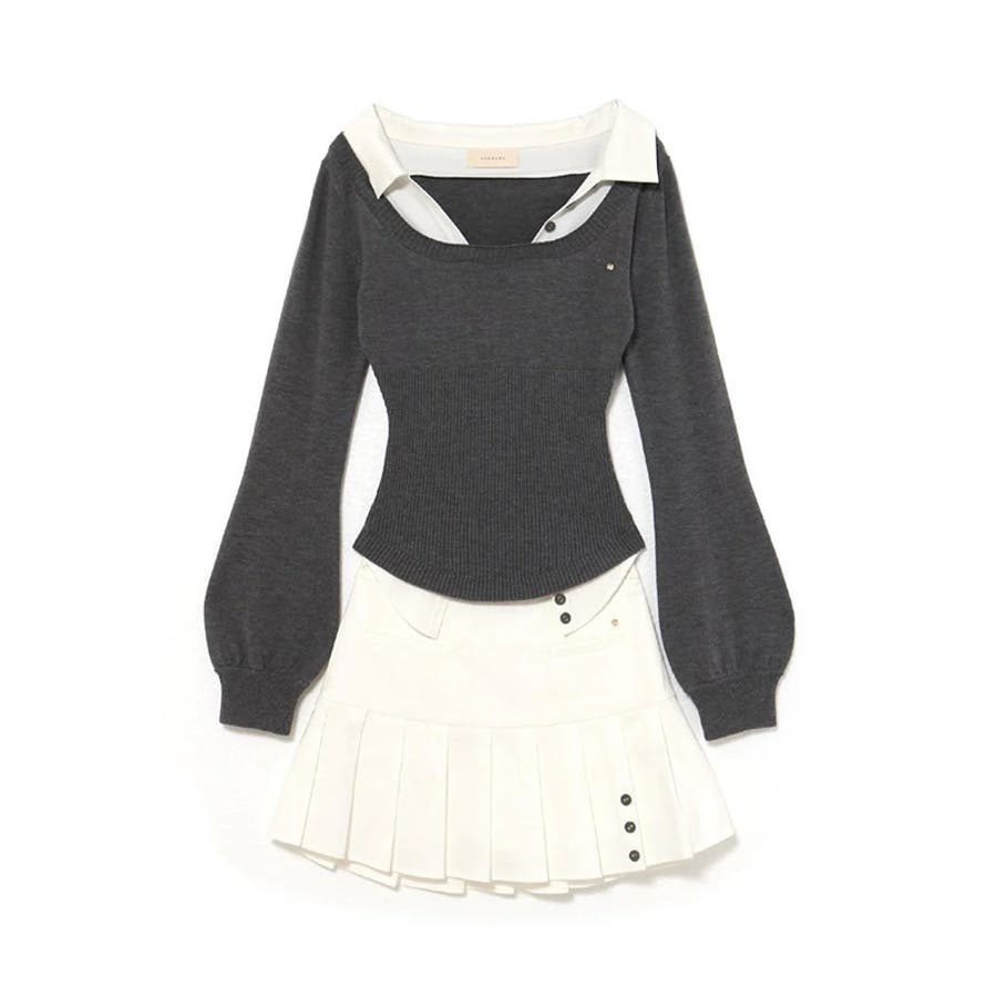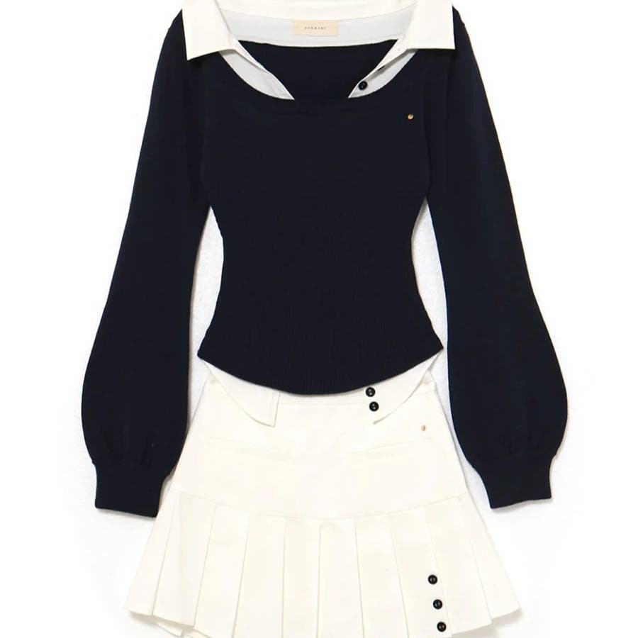 2025秋☆バイカラー襟付き トップス + プリーツスカート 2点セット