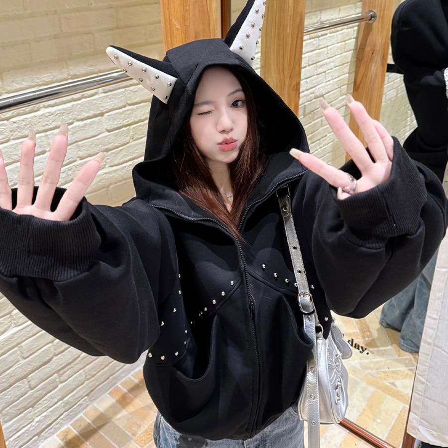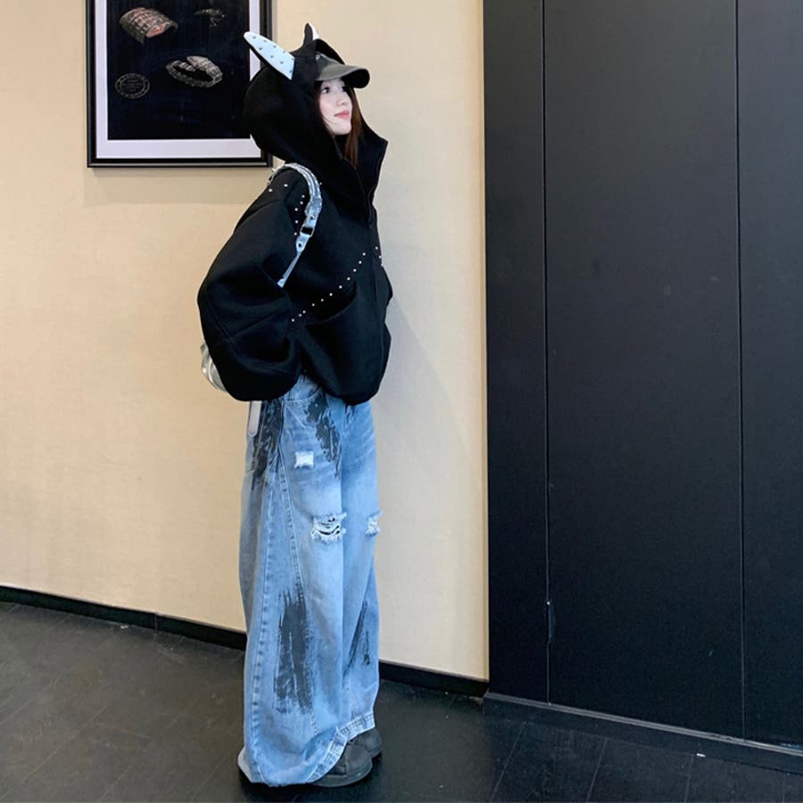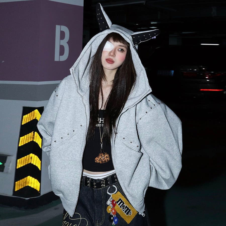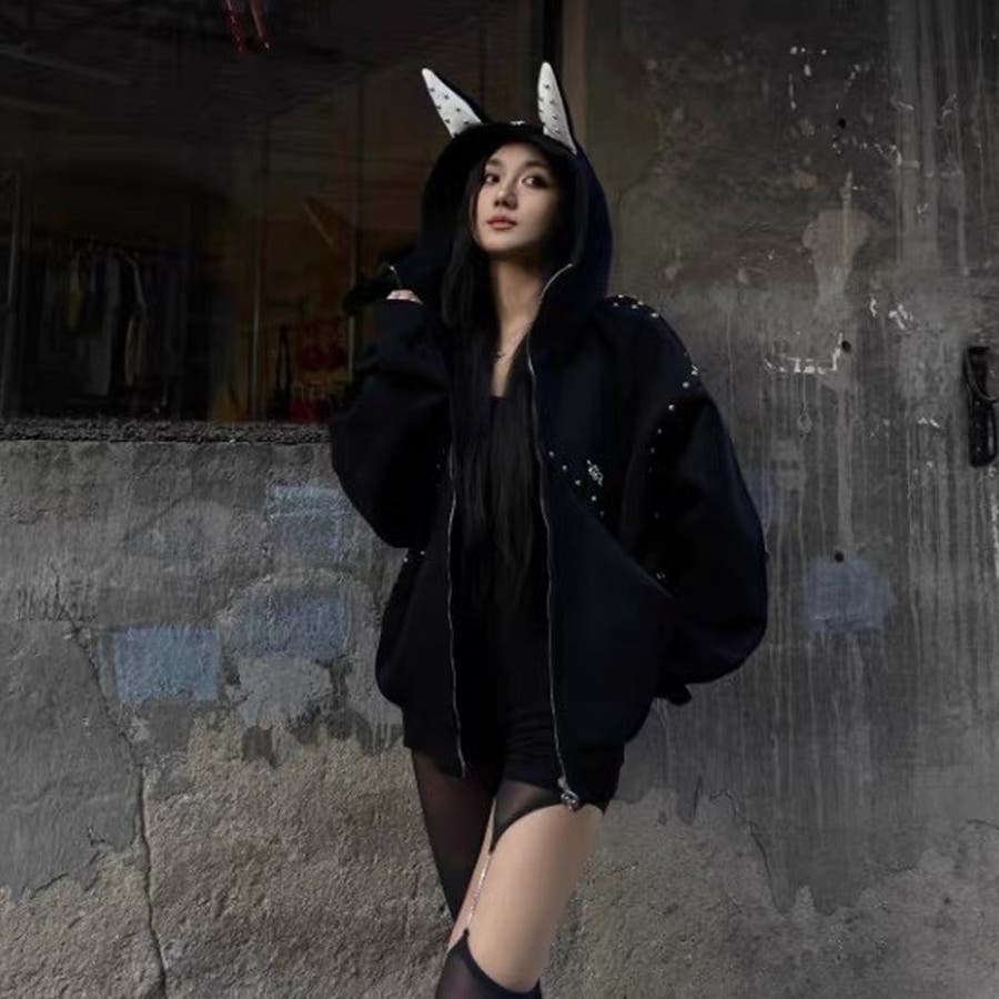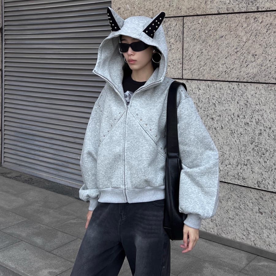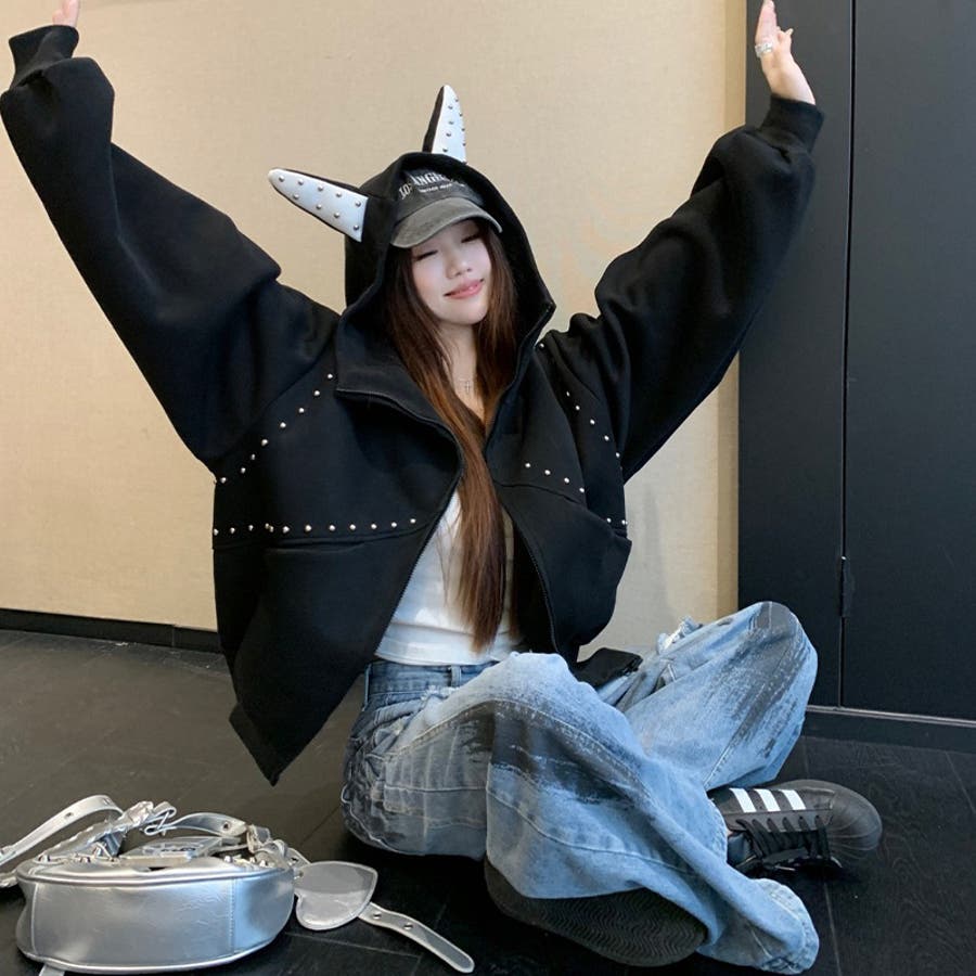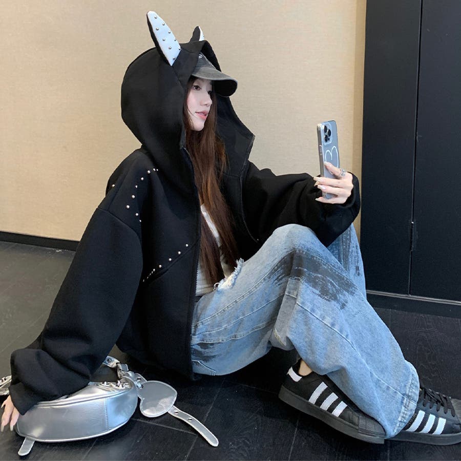 2025秋☆甘辛系ガールズ☆パッチワーク スタッズドーベルマンイヤーフーディー