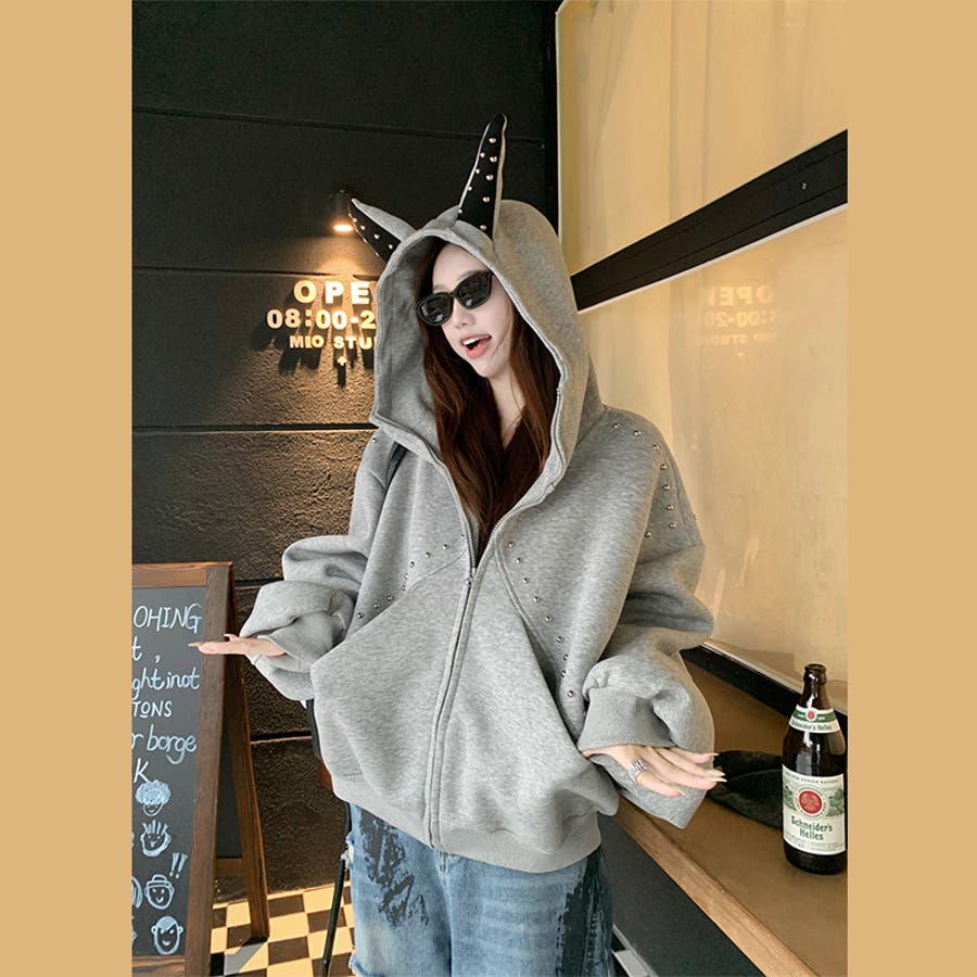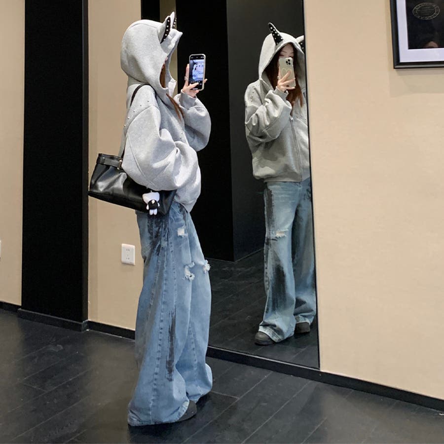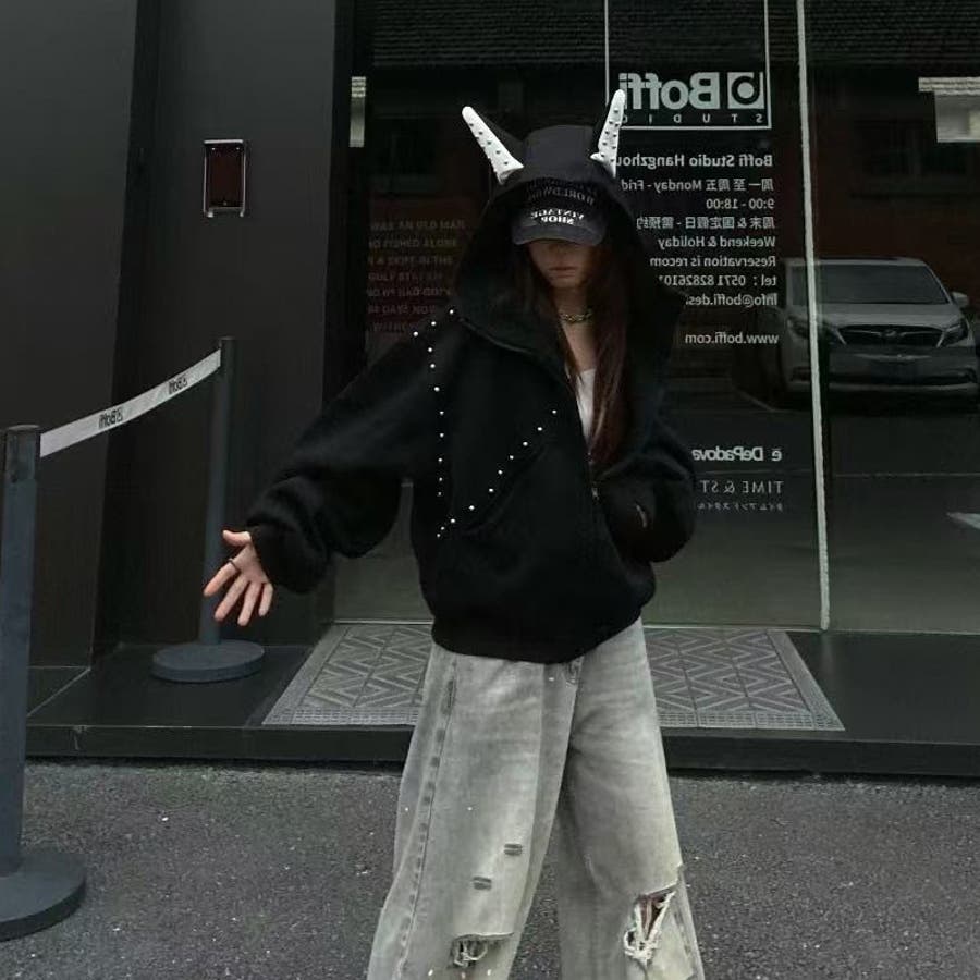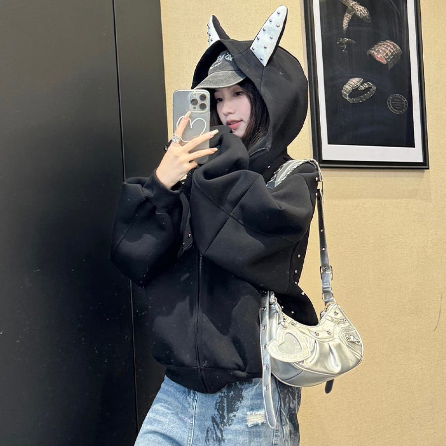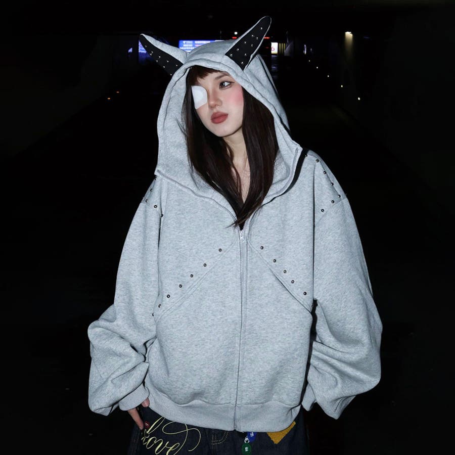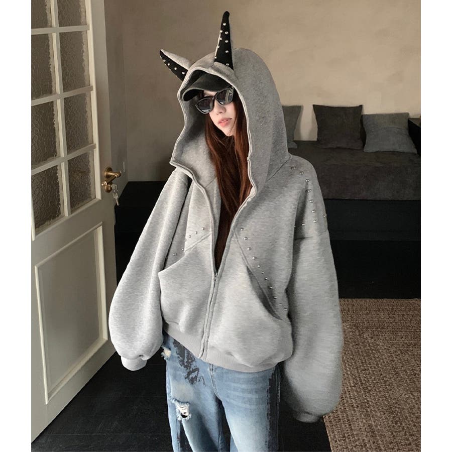 2025秋☆甘辛系ガールズ☆パッチワーク スタッズドーベルマンイヤーフーディー