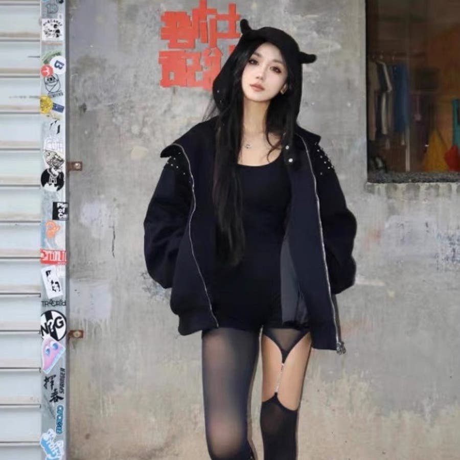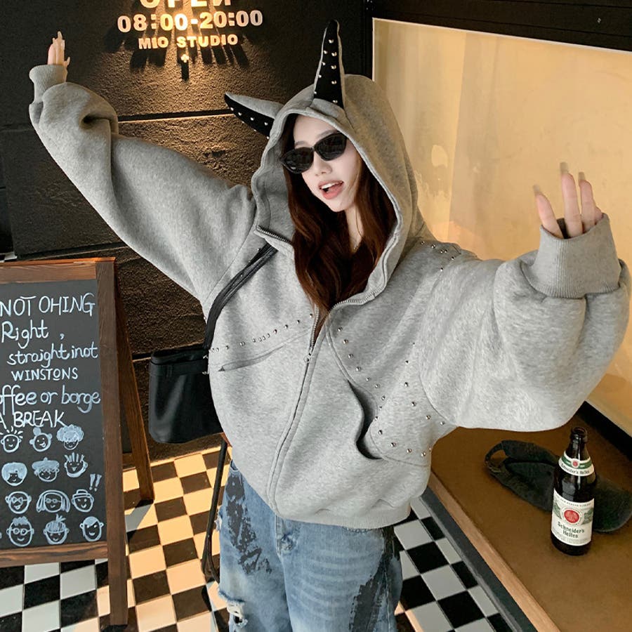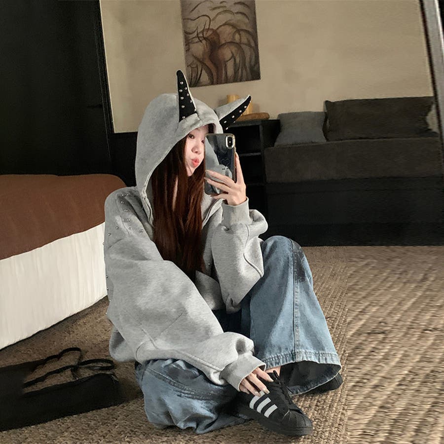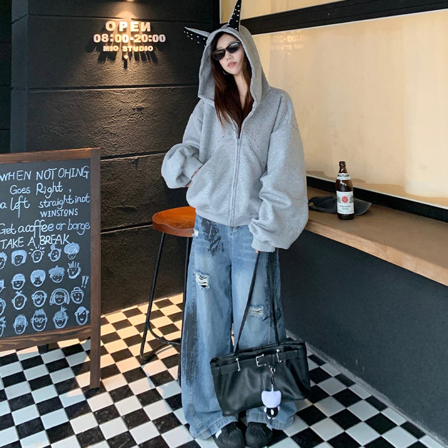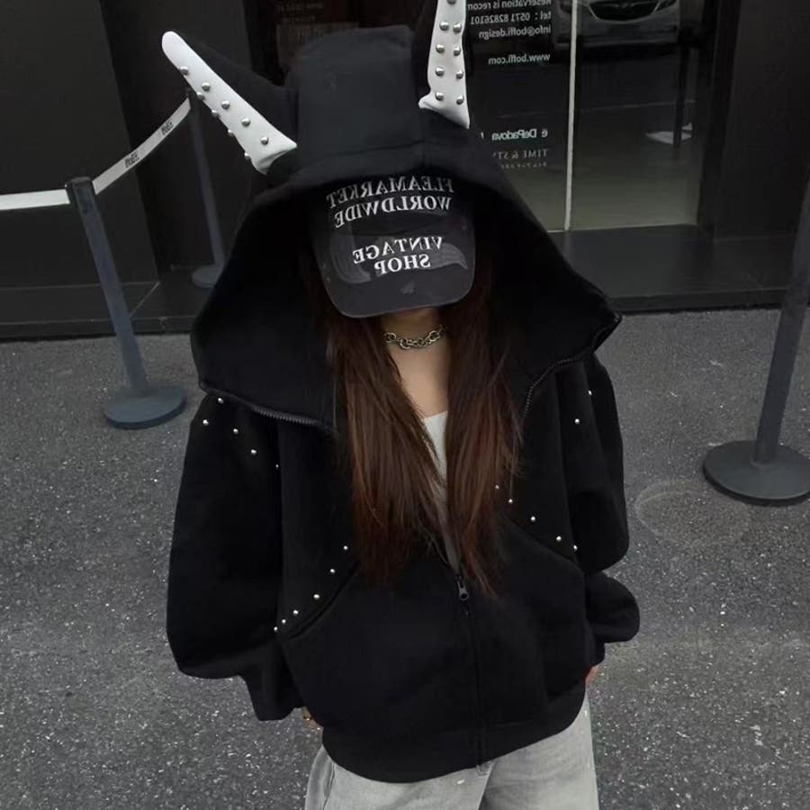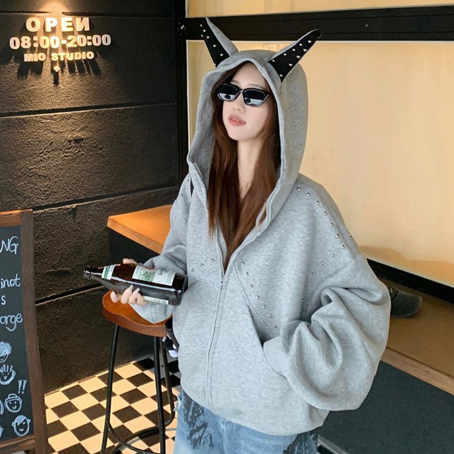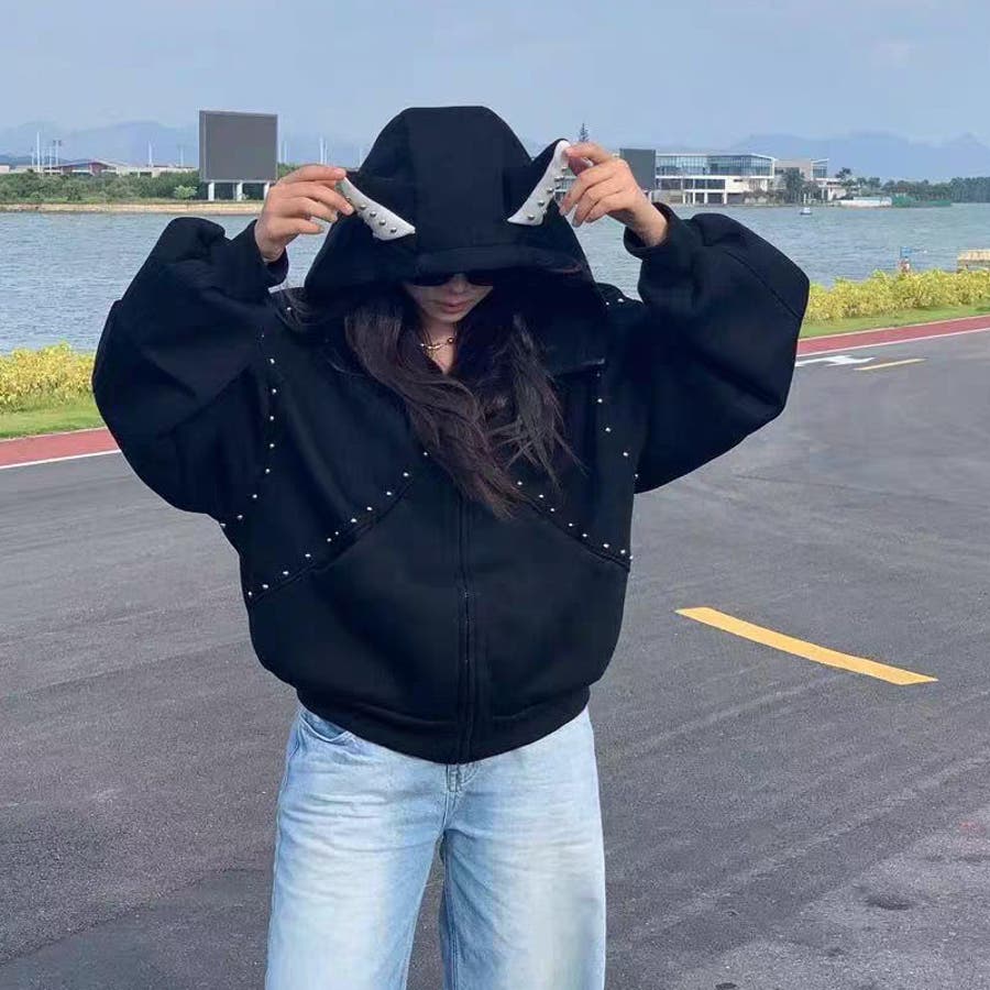 2025秋☆甘辛系ガールズ☆パッチワーク スタッズドーベルマンイヤーフーディー