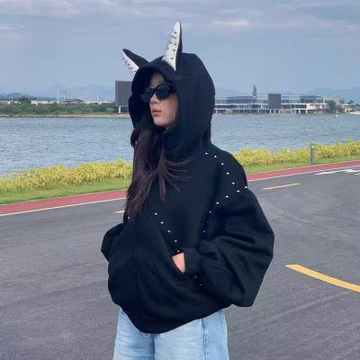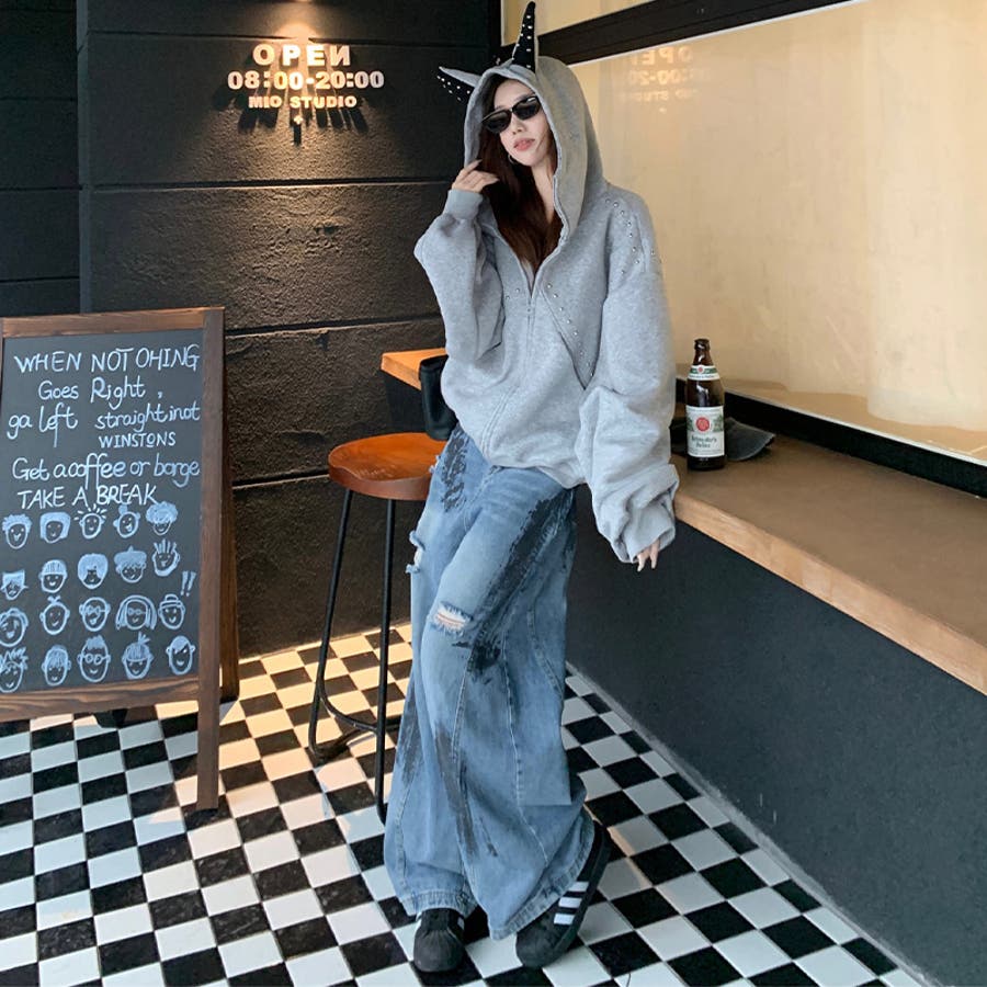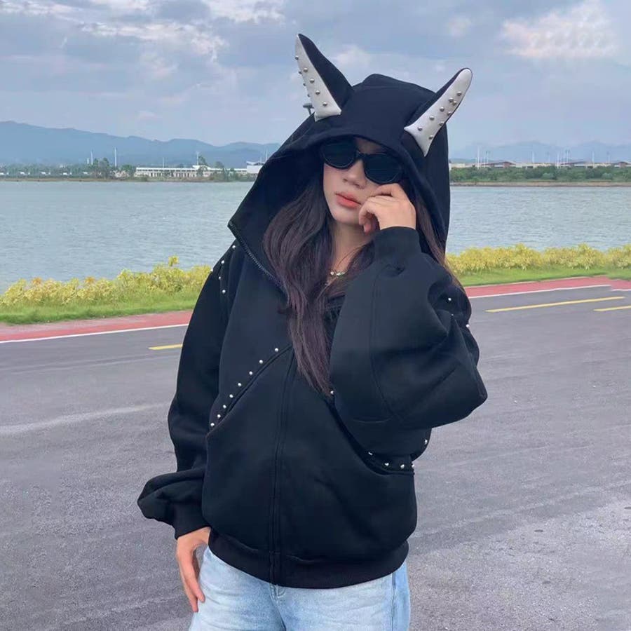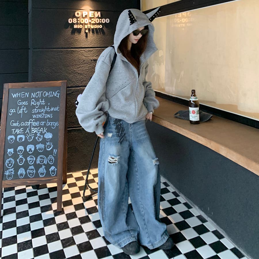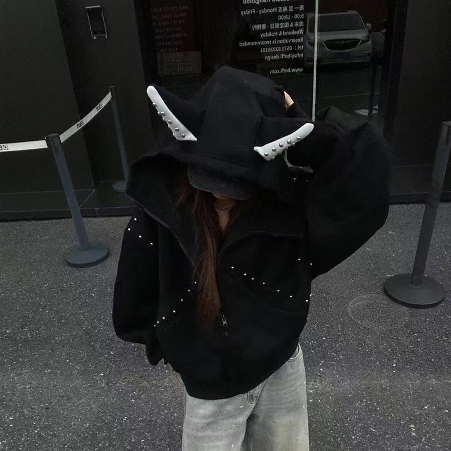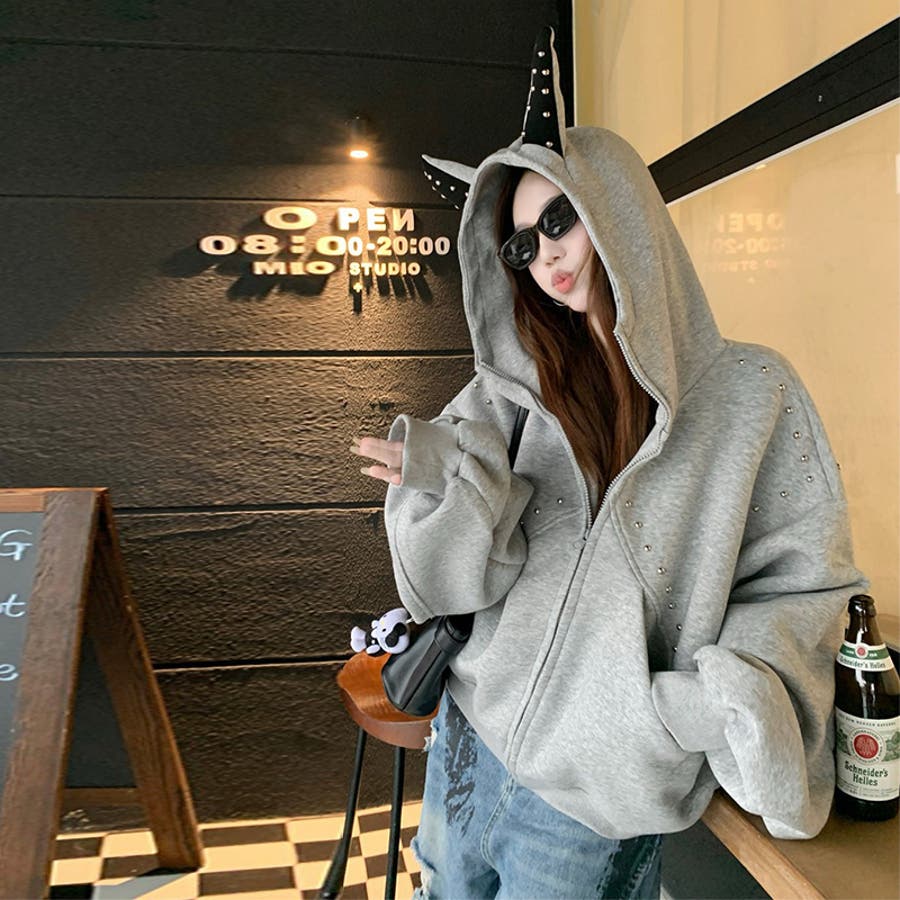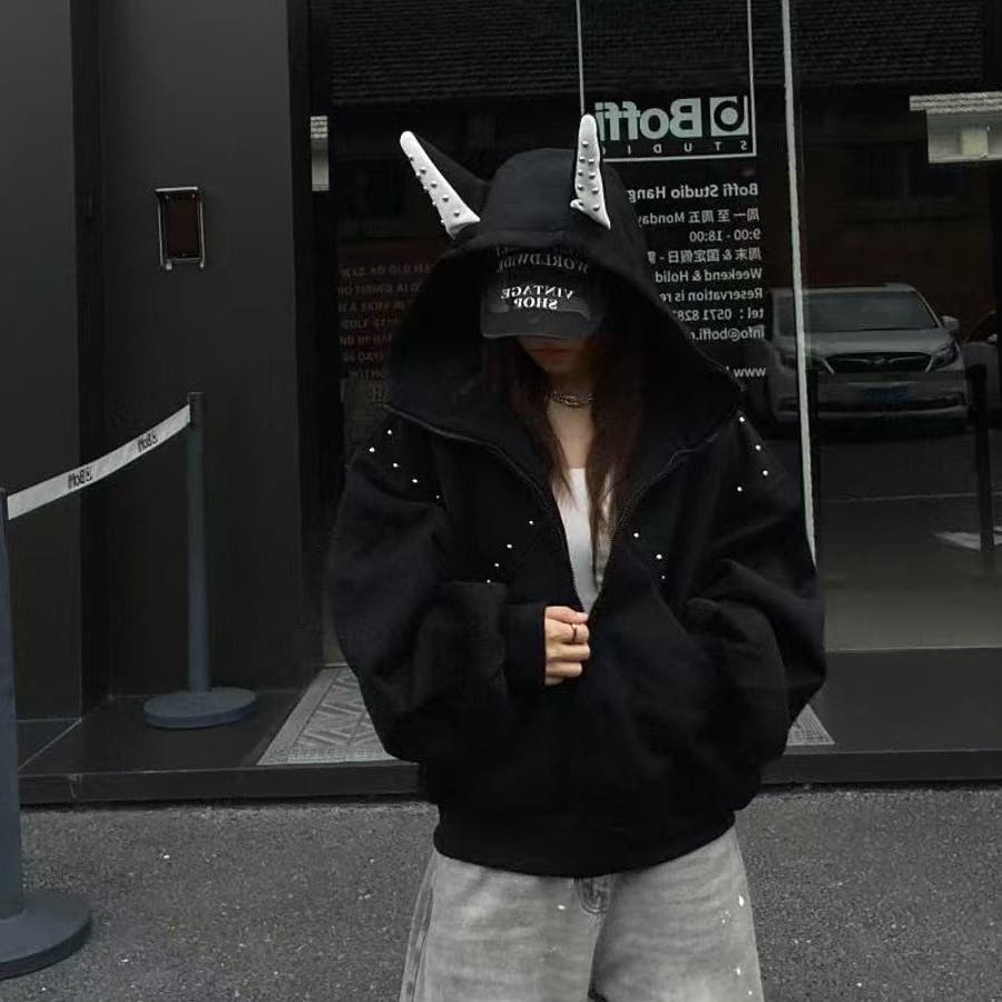 2025秋☆甘辛系ガールズ☆パッチワーク スタッズドーベルマンイヤーフーディー