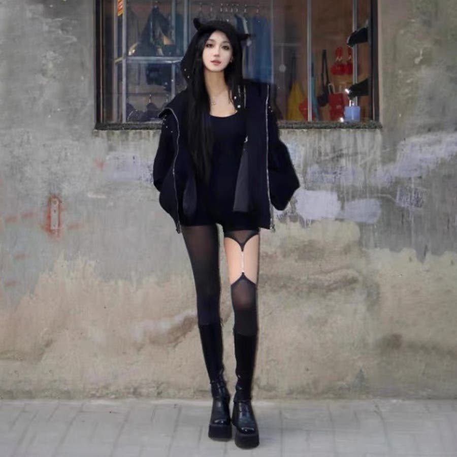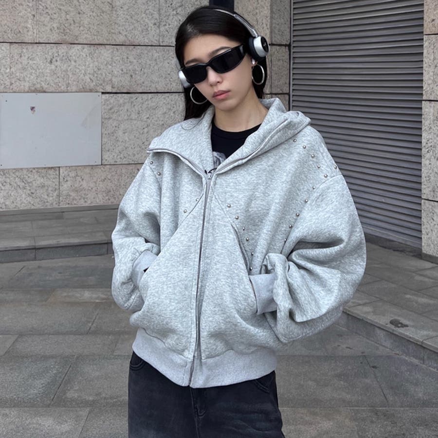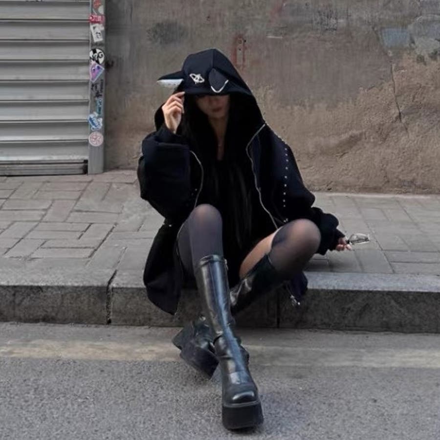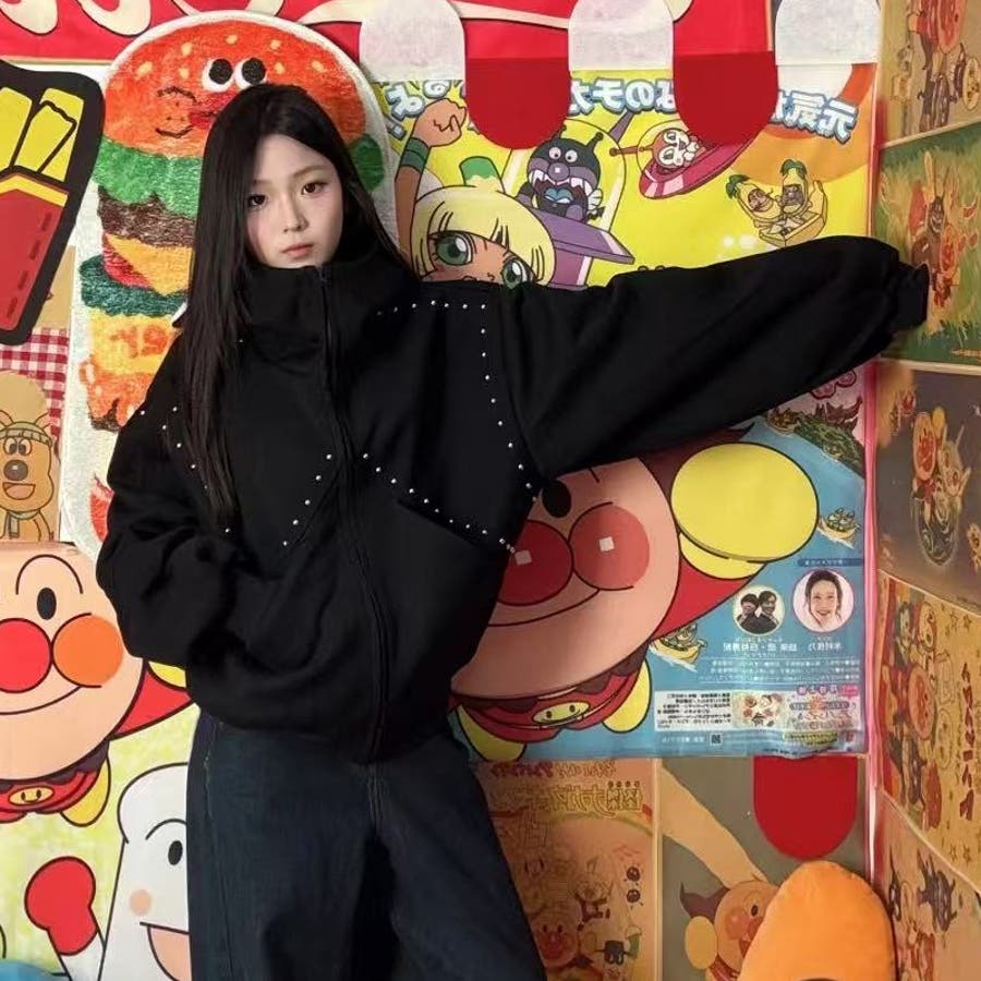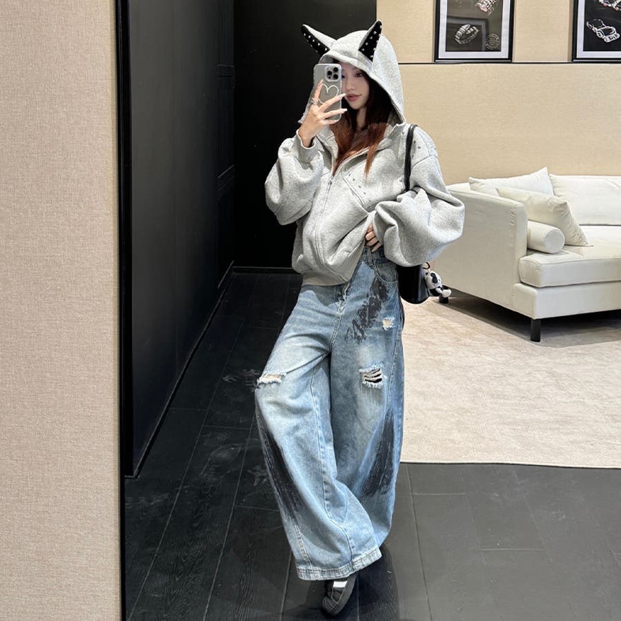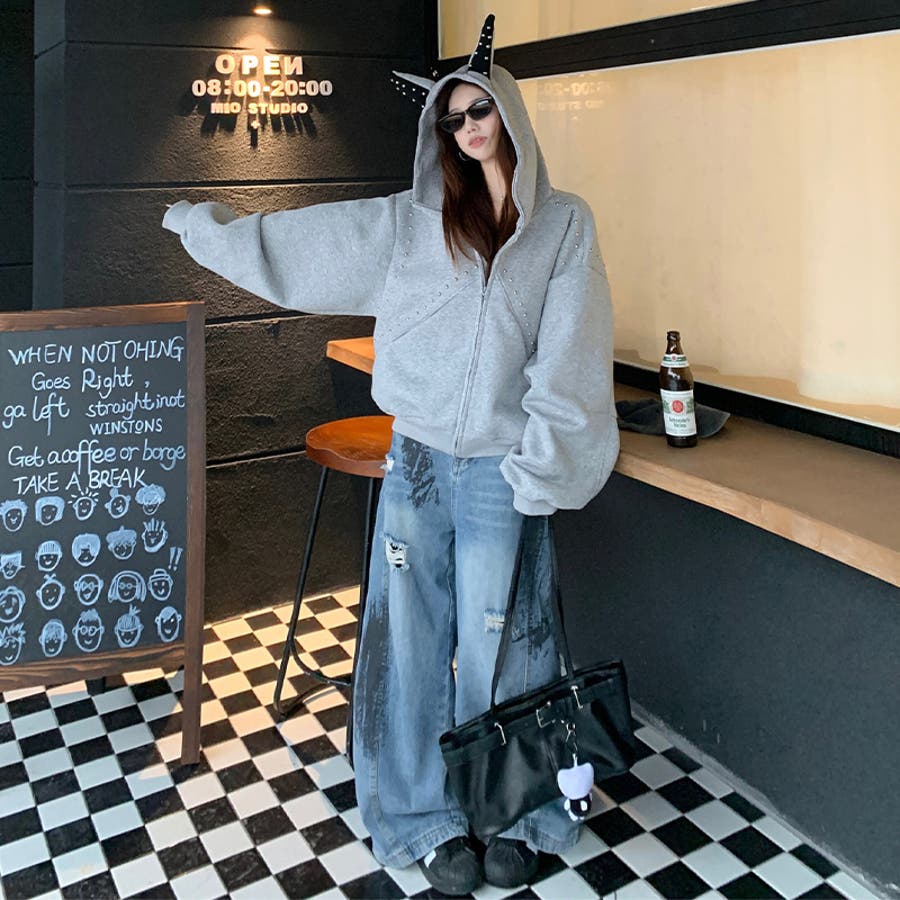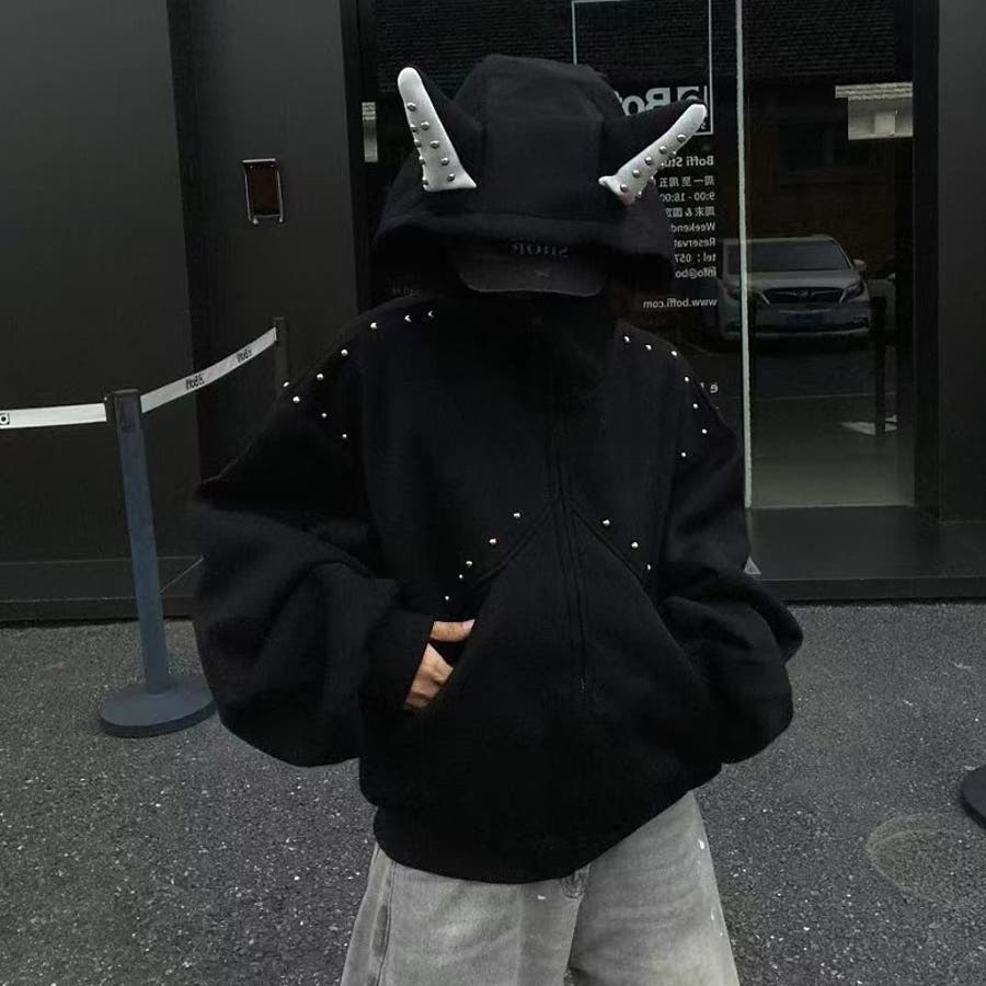 2025秋☆甘辛系ガールズ☆パッチワーク スタッズドーベルマンイヤーフーディー