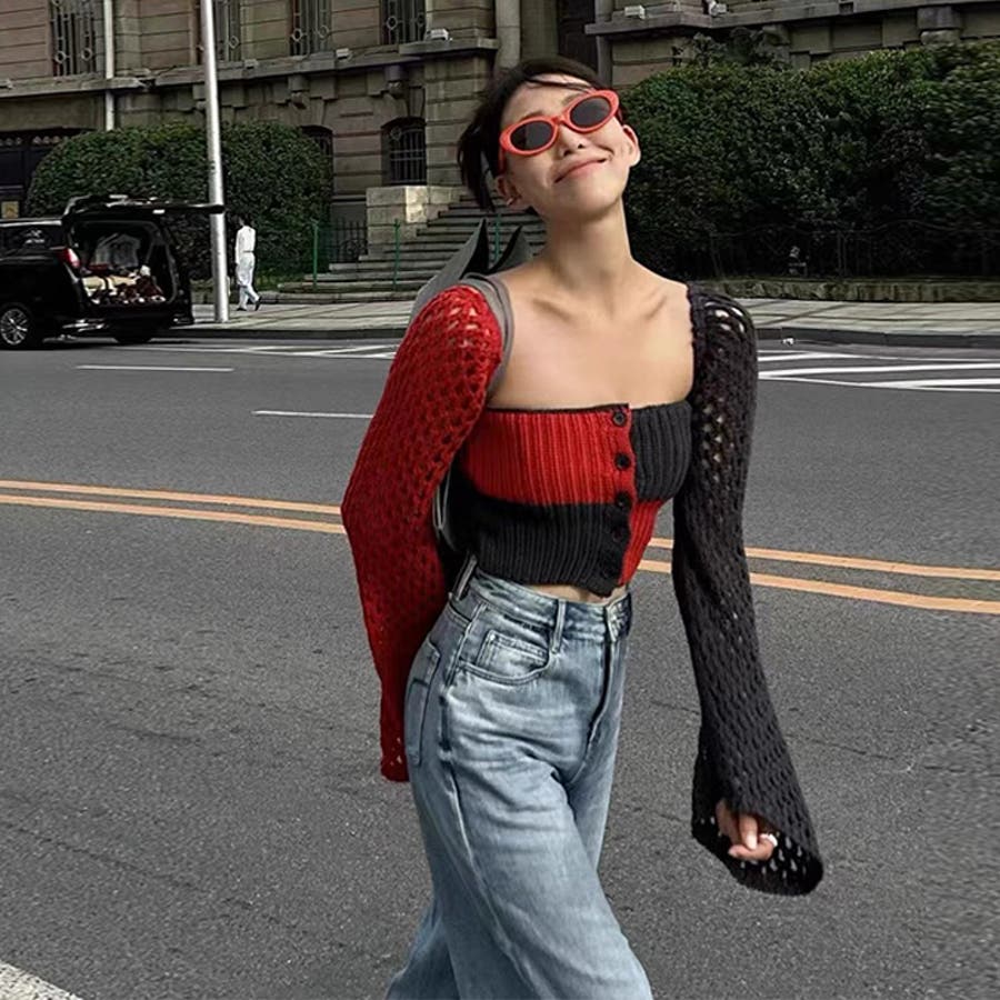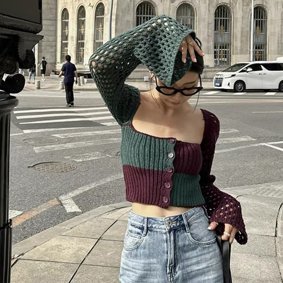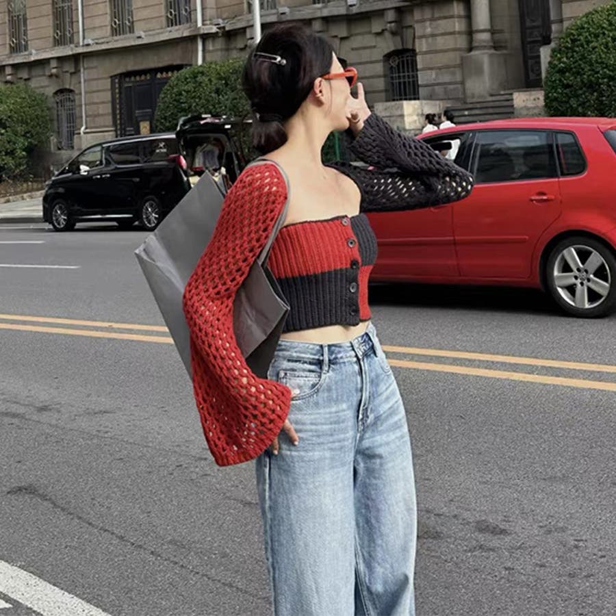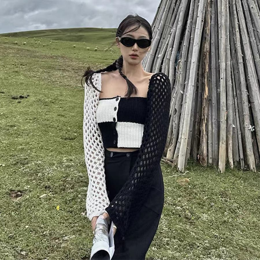 2025秋☆甘辛系ガールズ☆ノースリーブ薄手ニット メッシュ風カーディガン