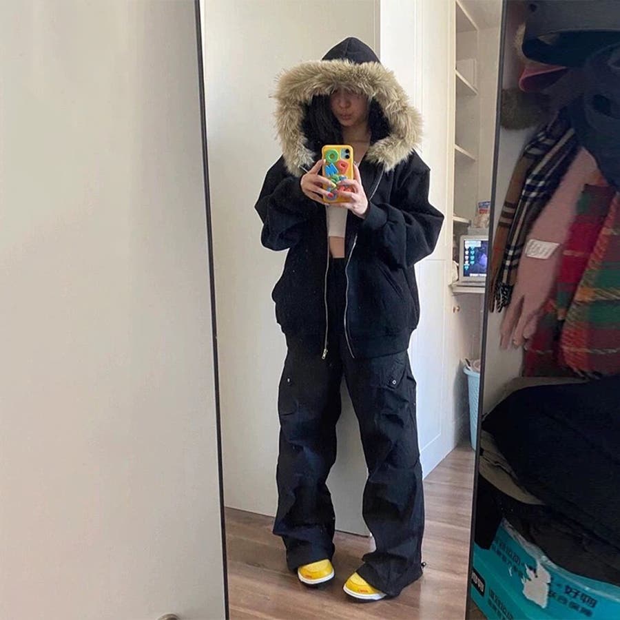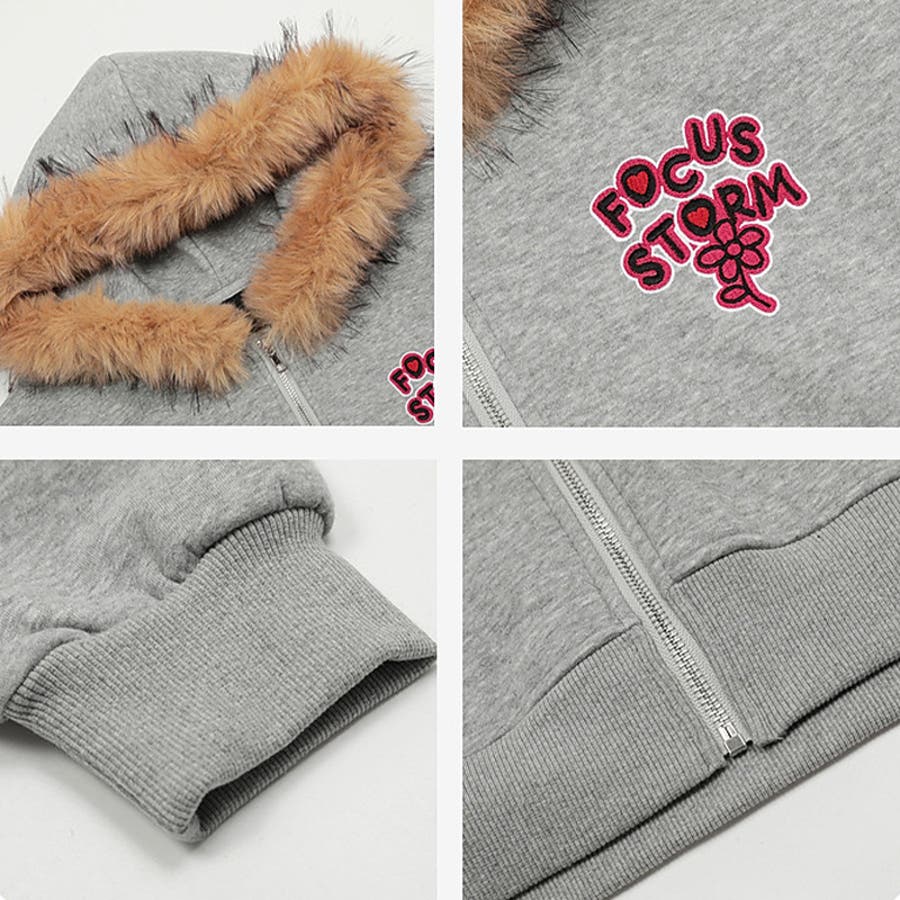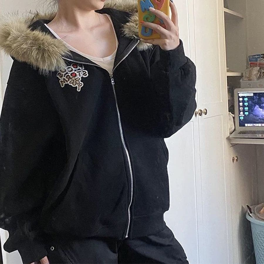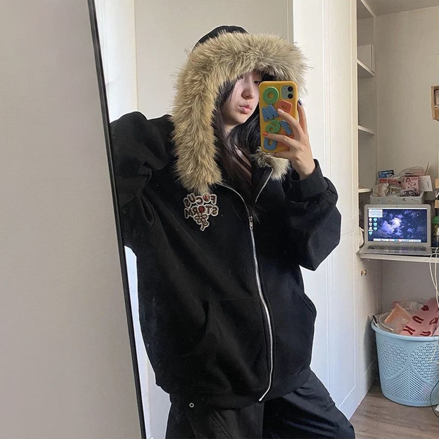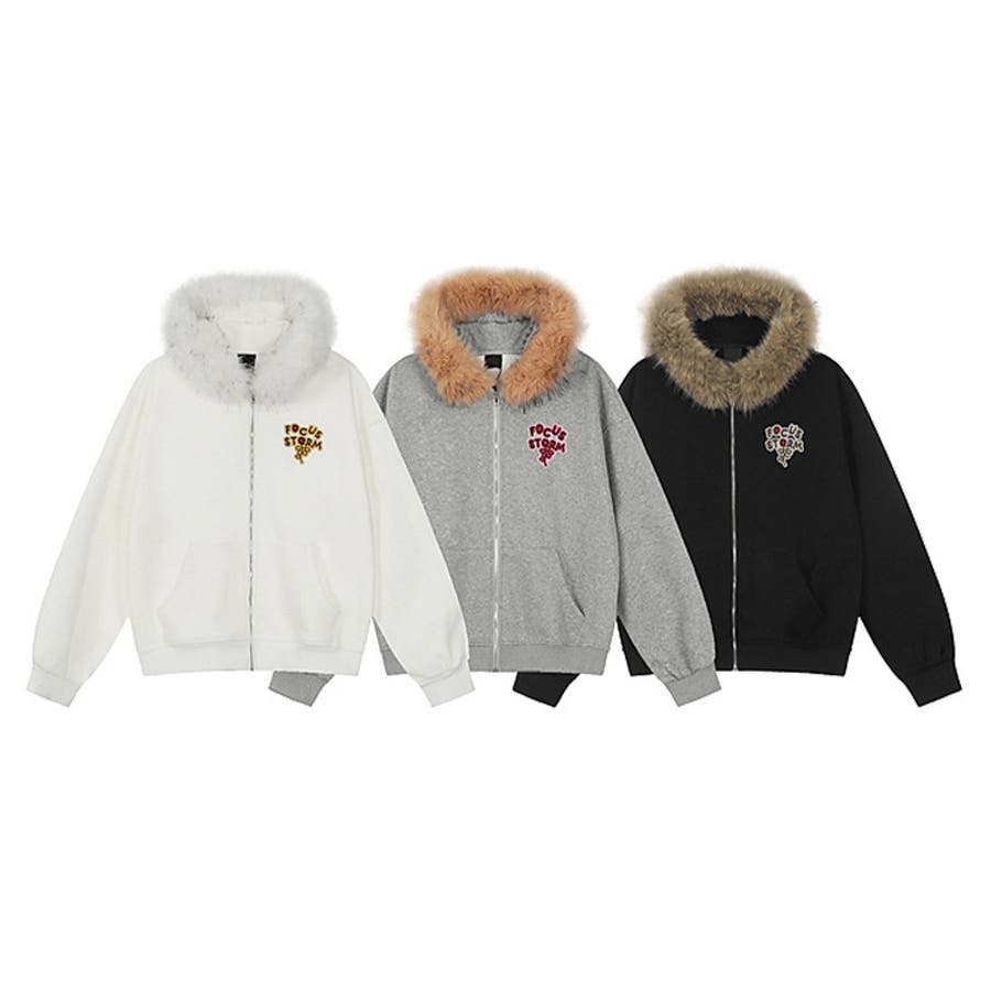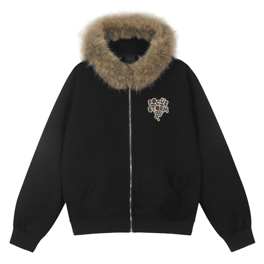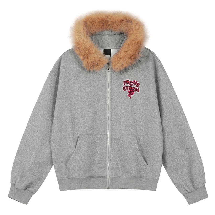 2025秋☆ユニセックス☆パーカー 刺繍入りボア襟 ジップアップアウター
