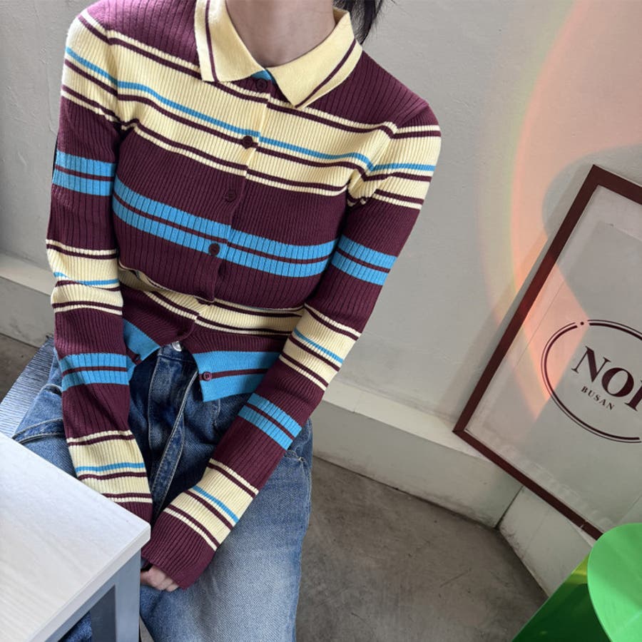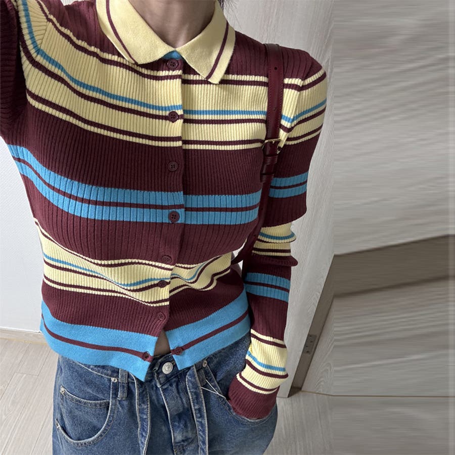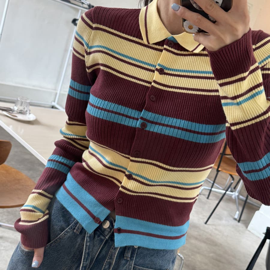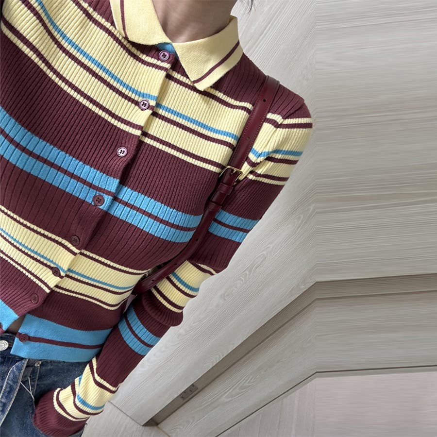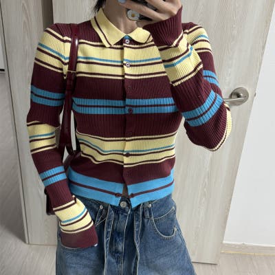 甘辛系ガールズ☆魅力的で大人可愛い配色ストライプ襟付きショートニットジャケット