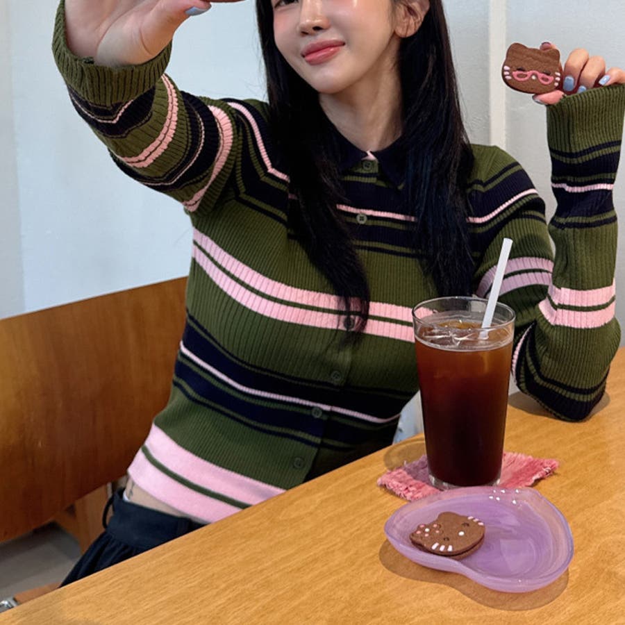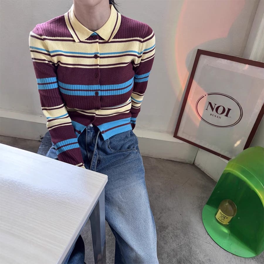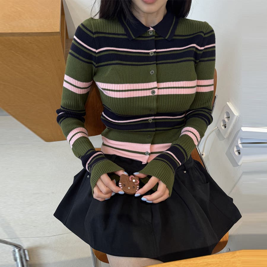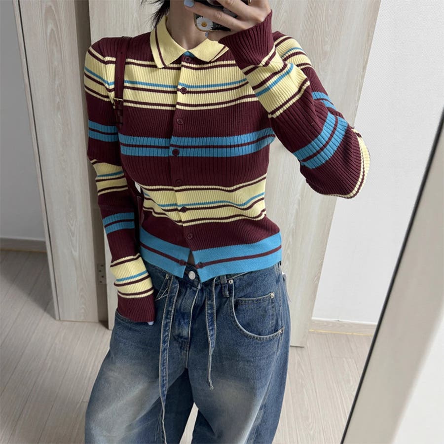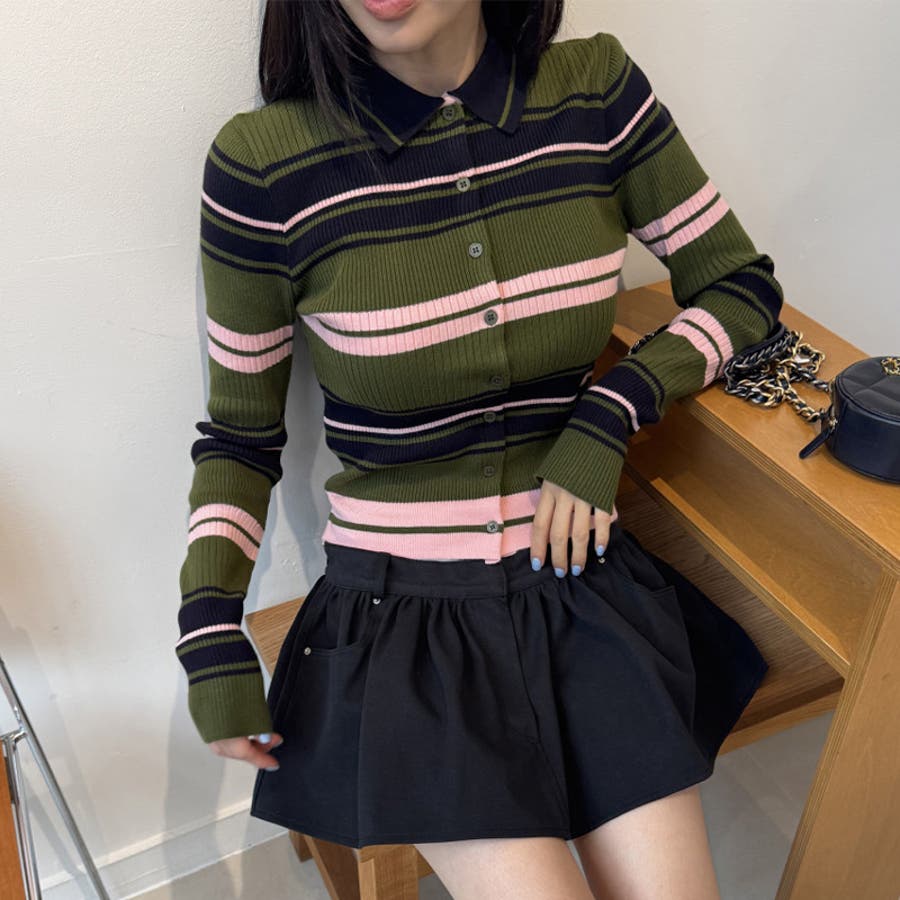甘辛系ガールズ☆魅力的で大人可愛い配色ストライプ襟付きショートニットジャケット