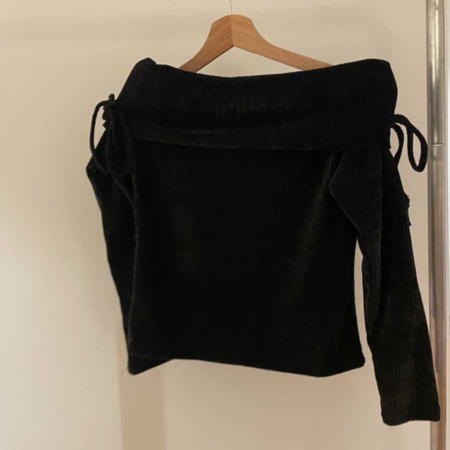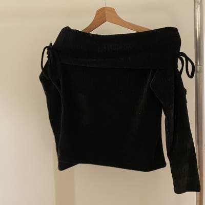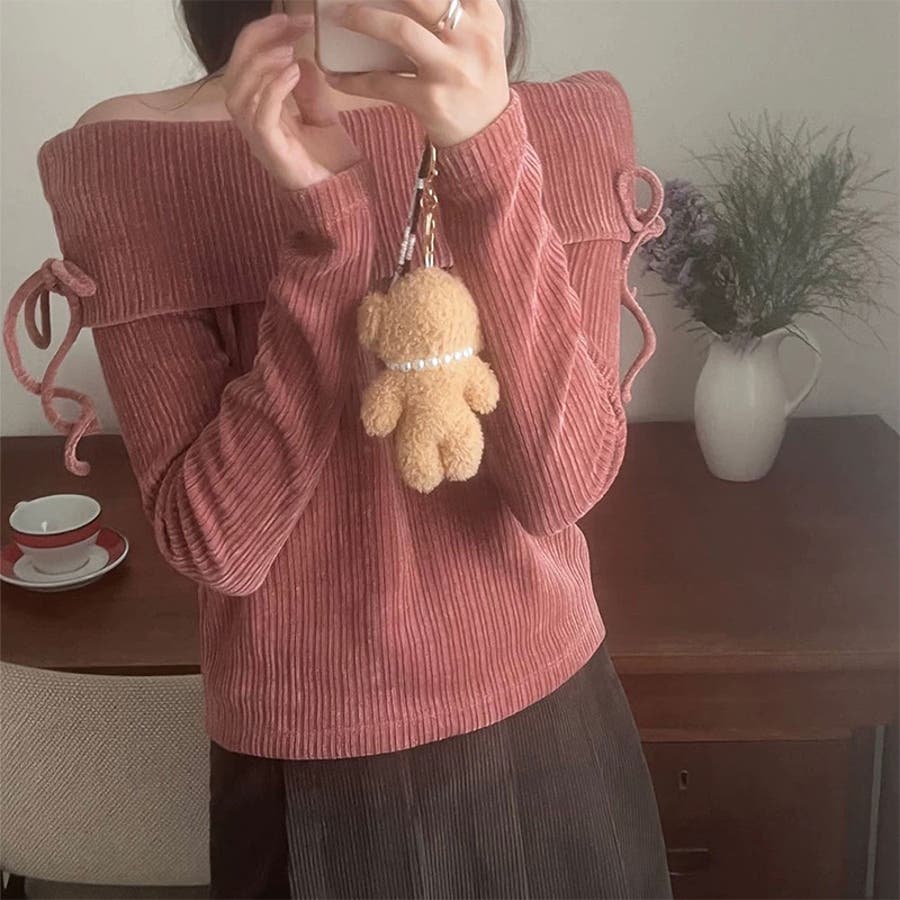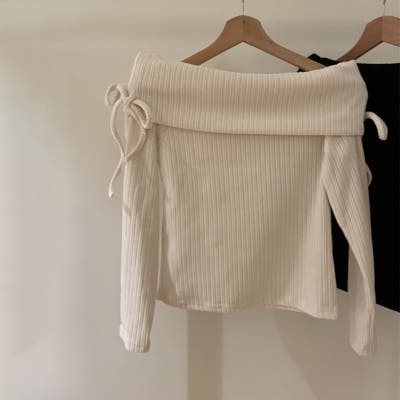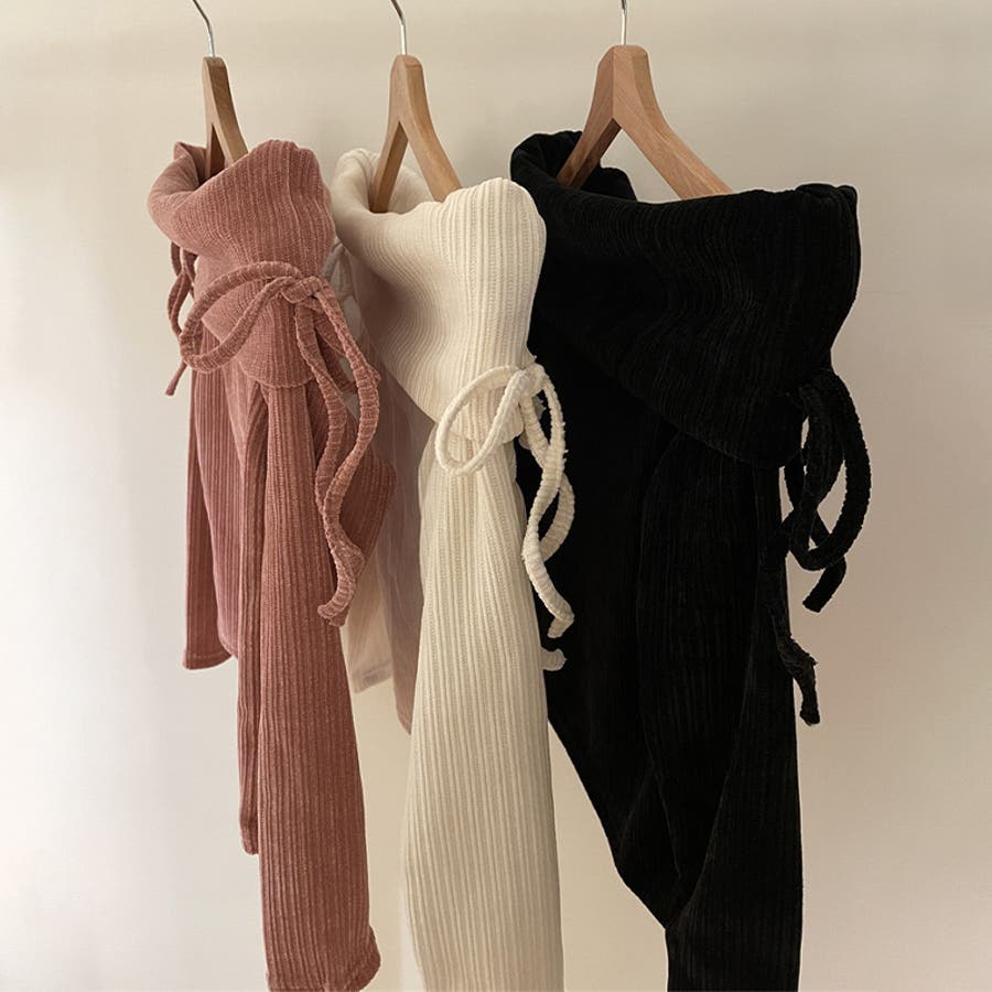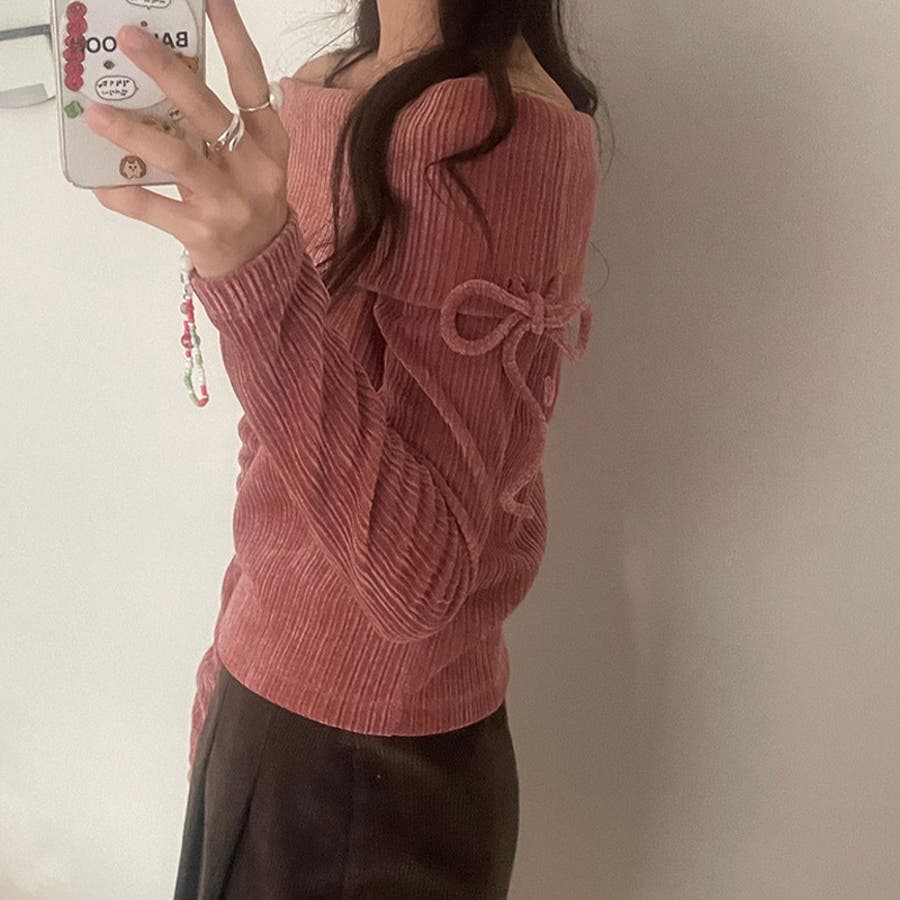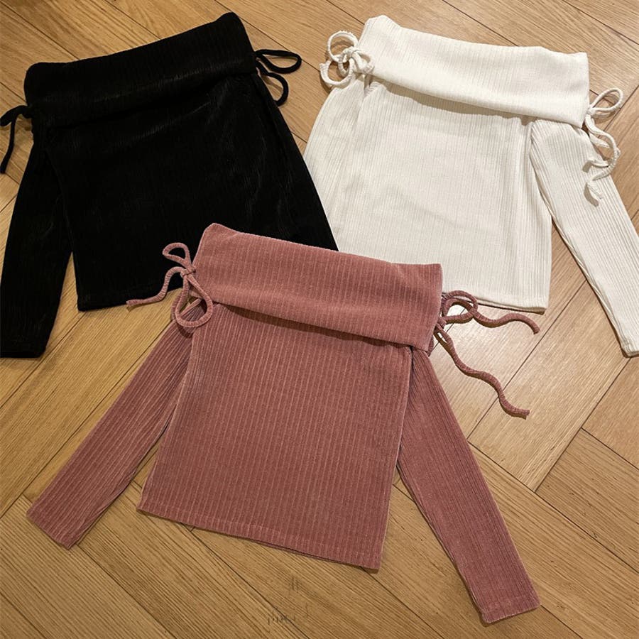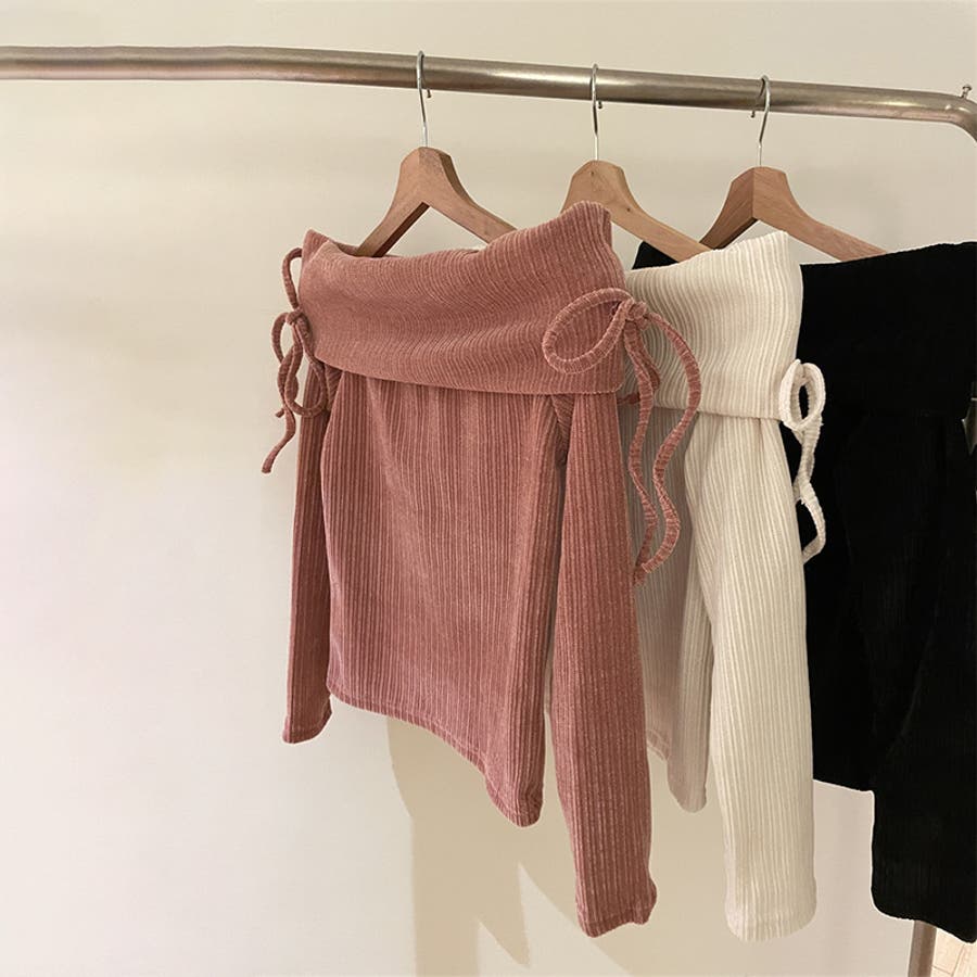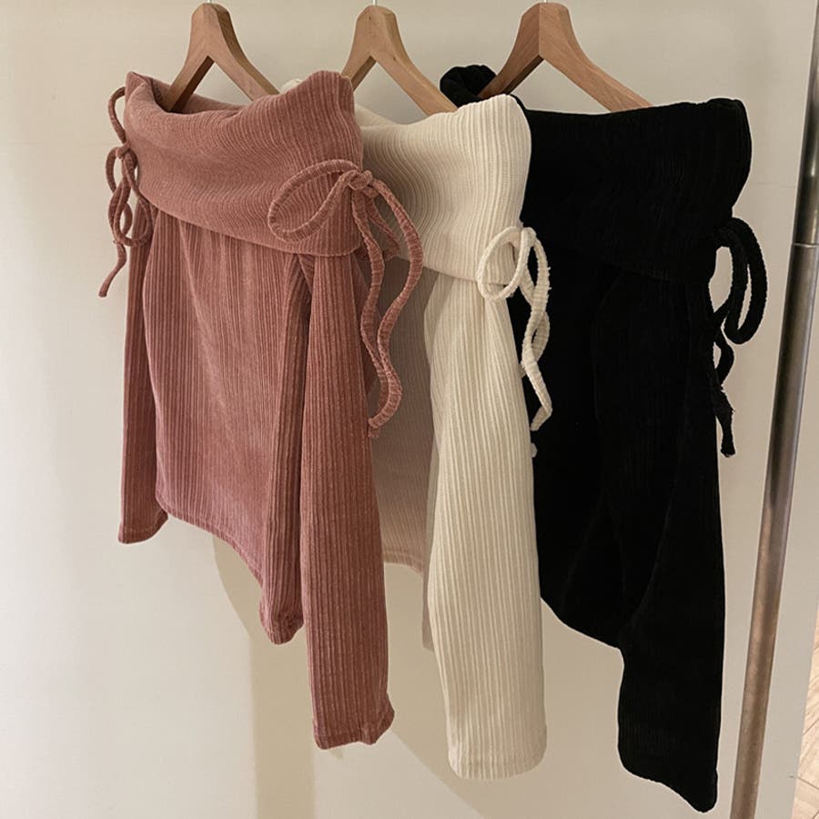 甘辛系ガールズ☆厚手リブコーデュロイ調 オフショルダーリボン付きトップス