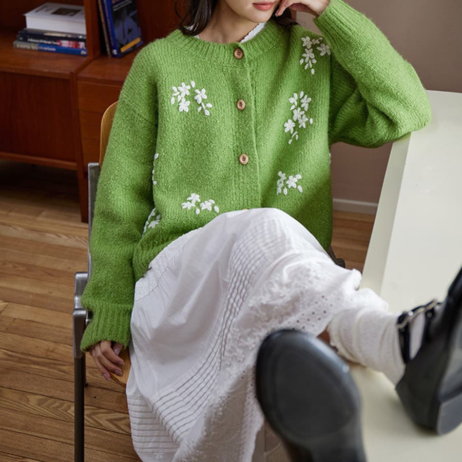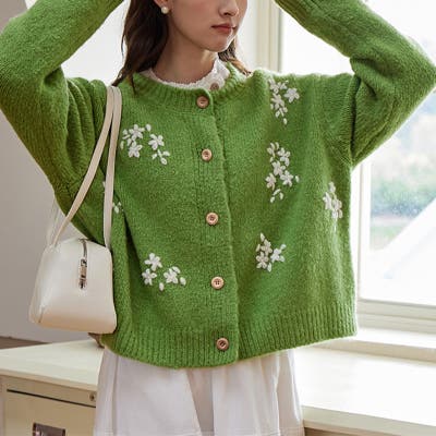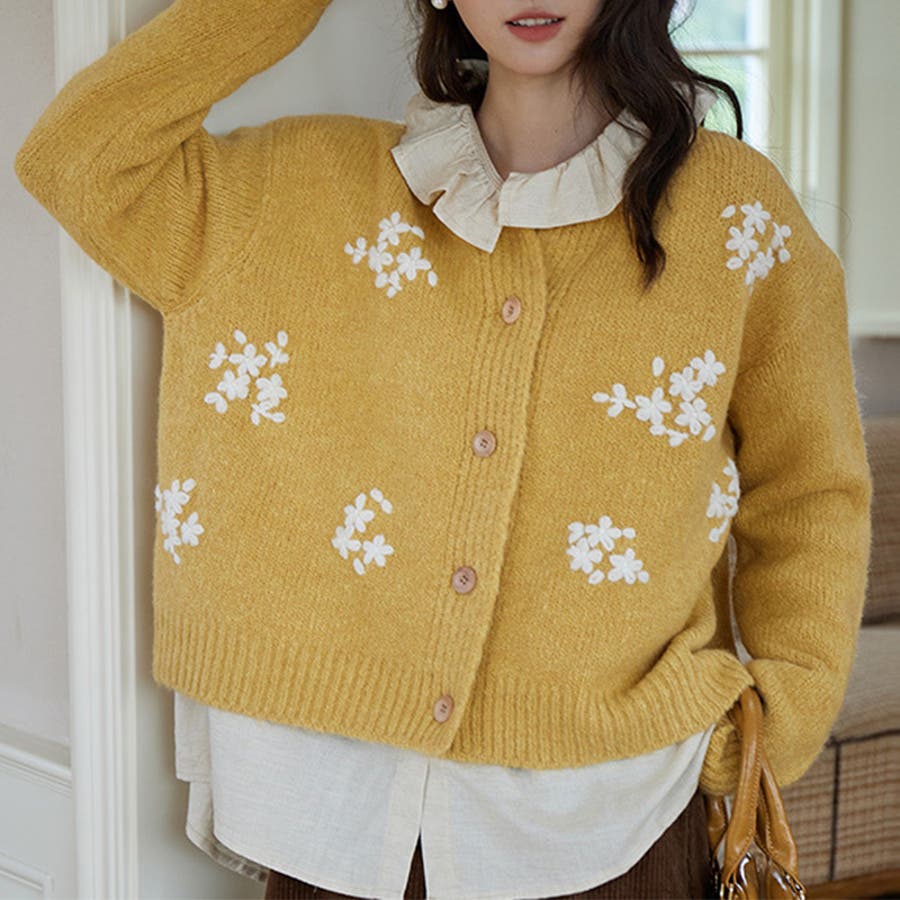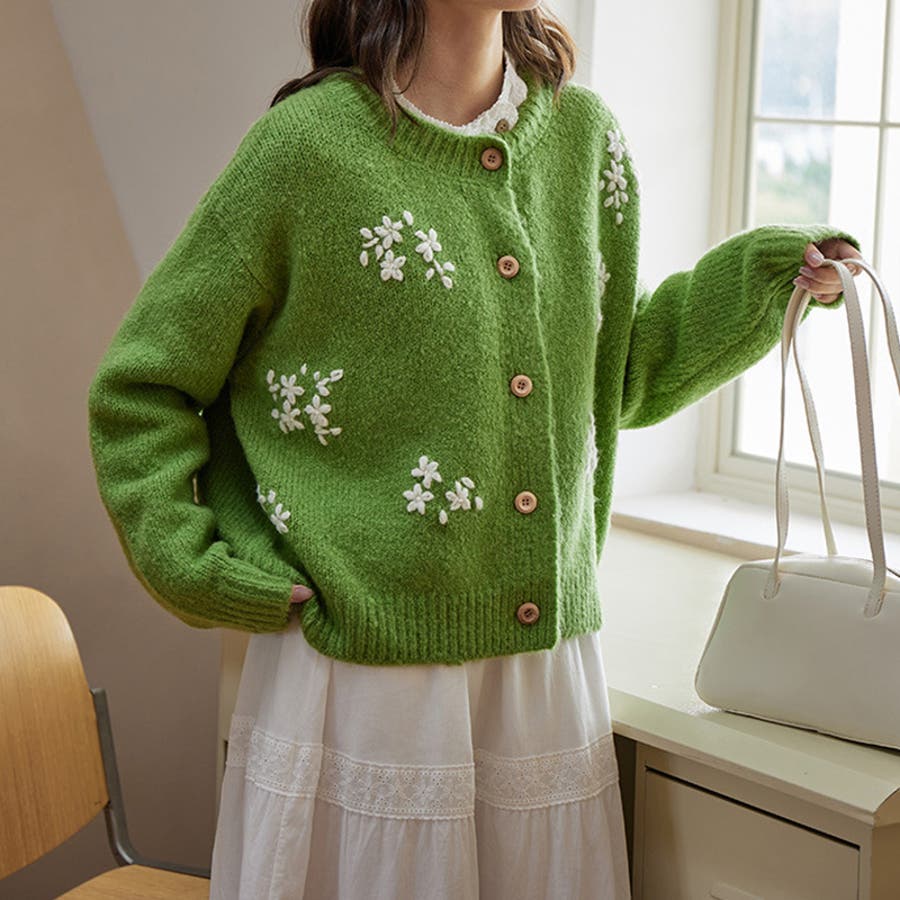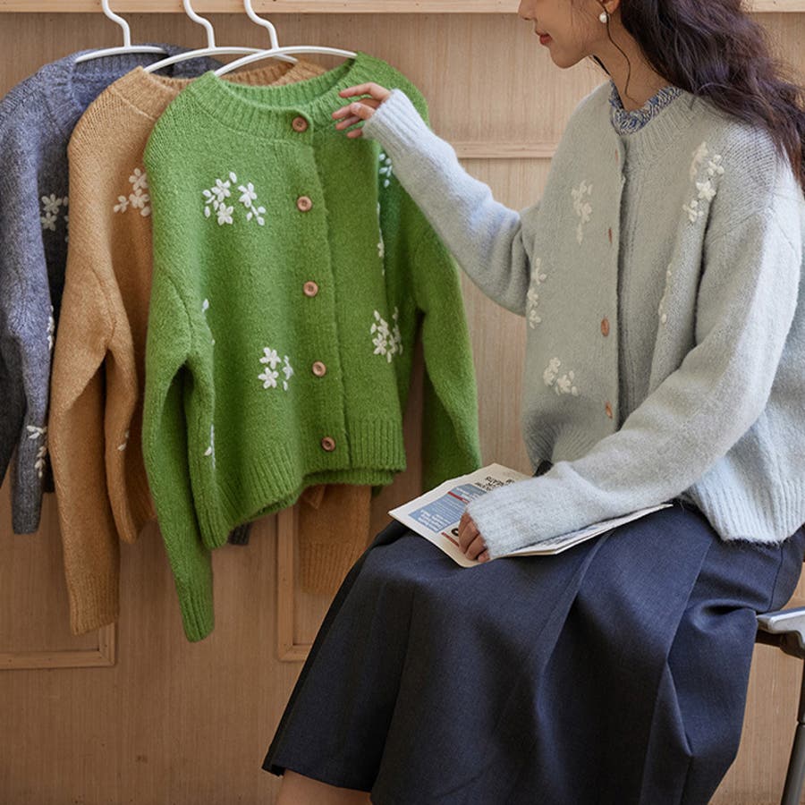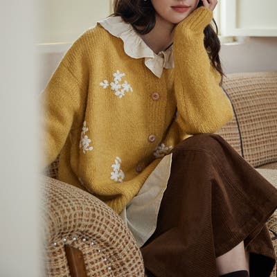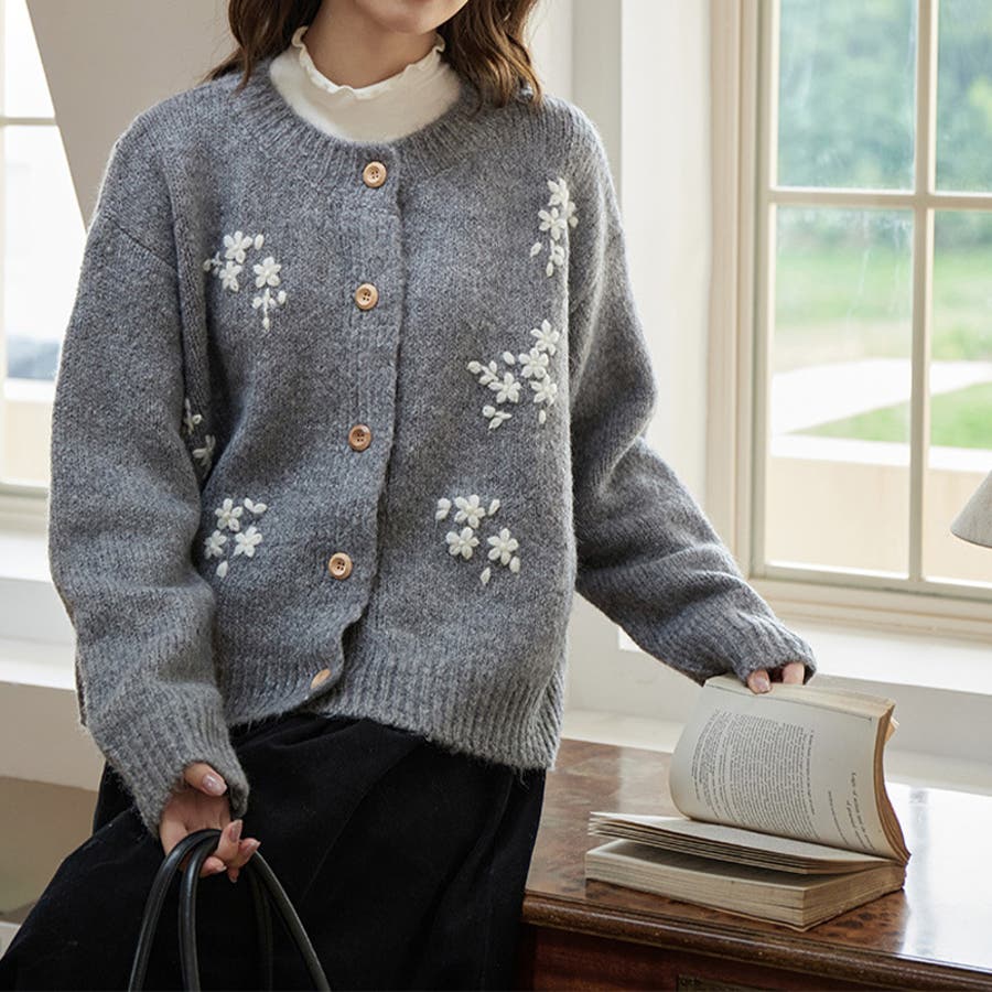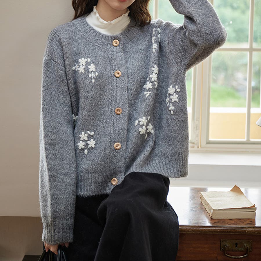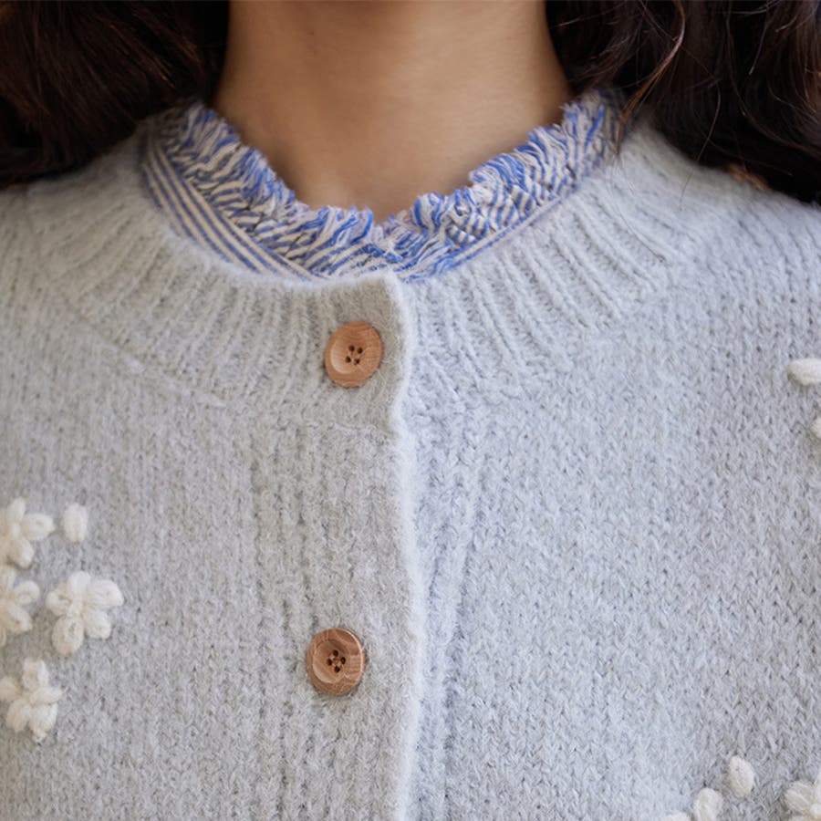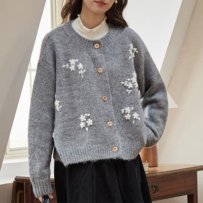 甘辛系ガールズ☆細見え重刺繍クルーネックウールニットカーディガン