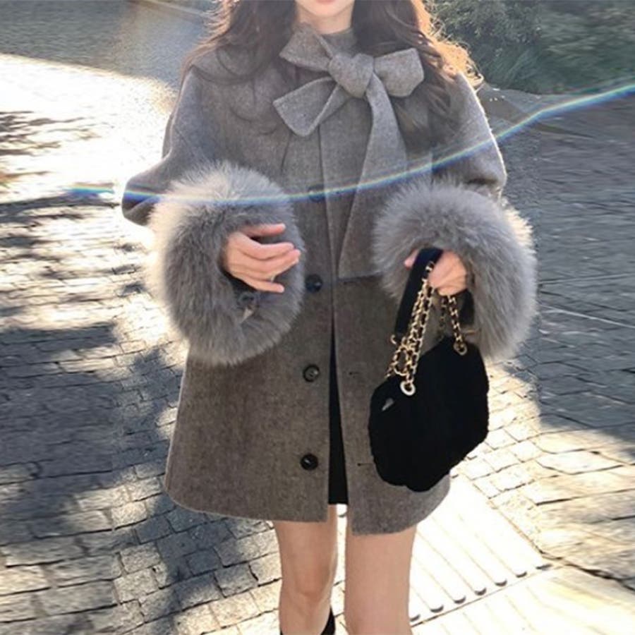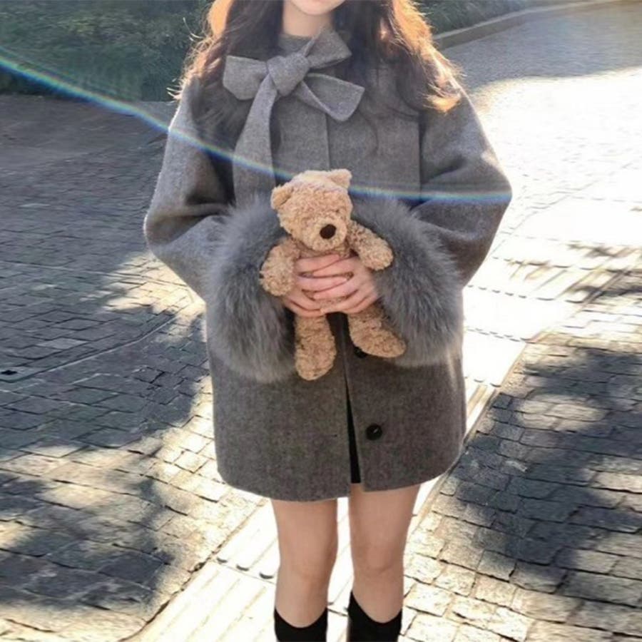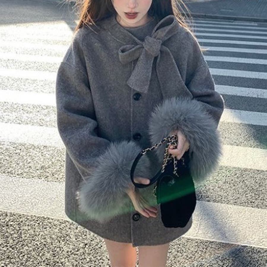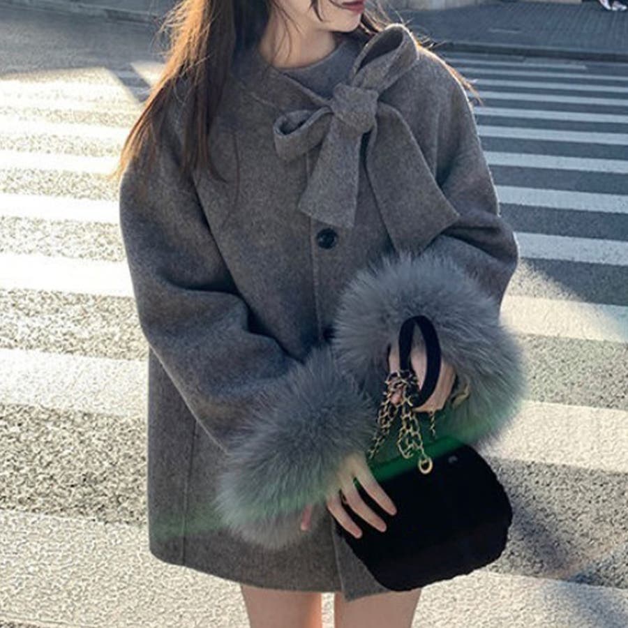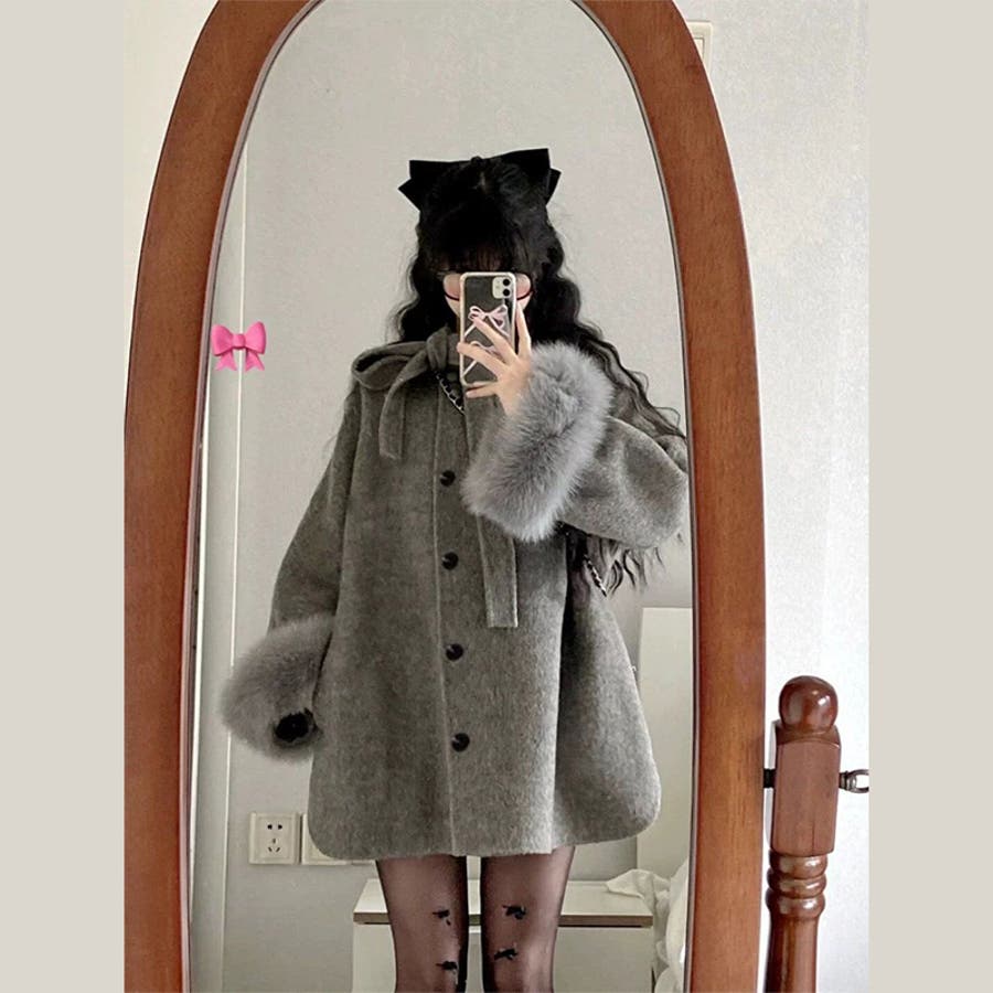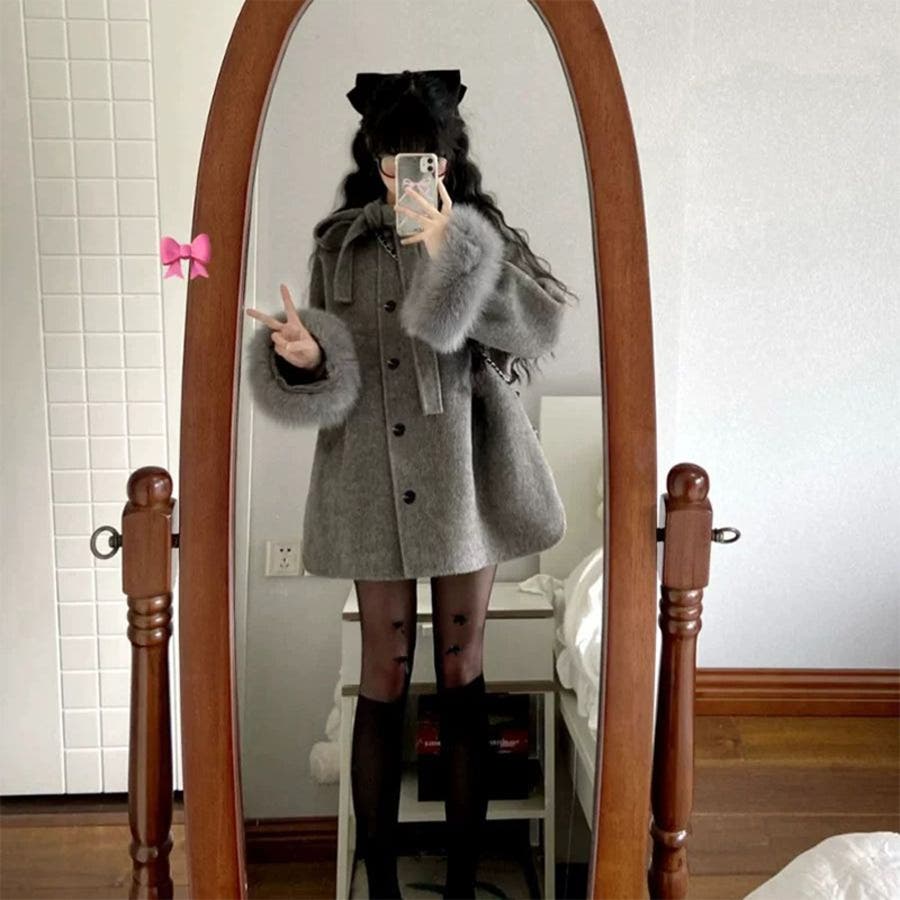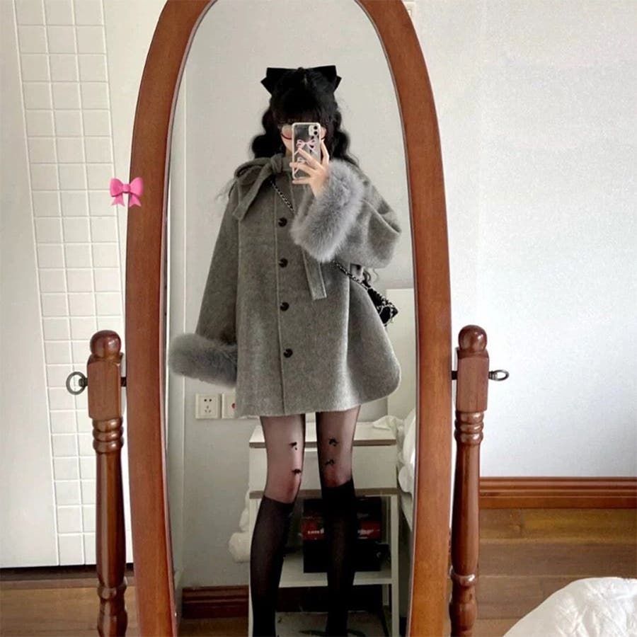 ゆるカワコーデ☆グレーウールコートミドル丈蝶結びケープコート