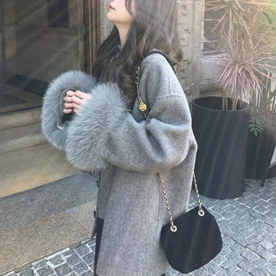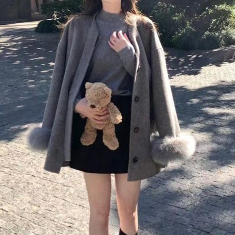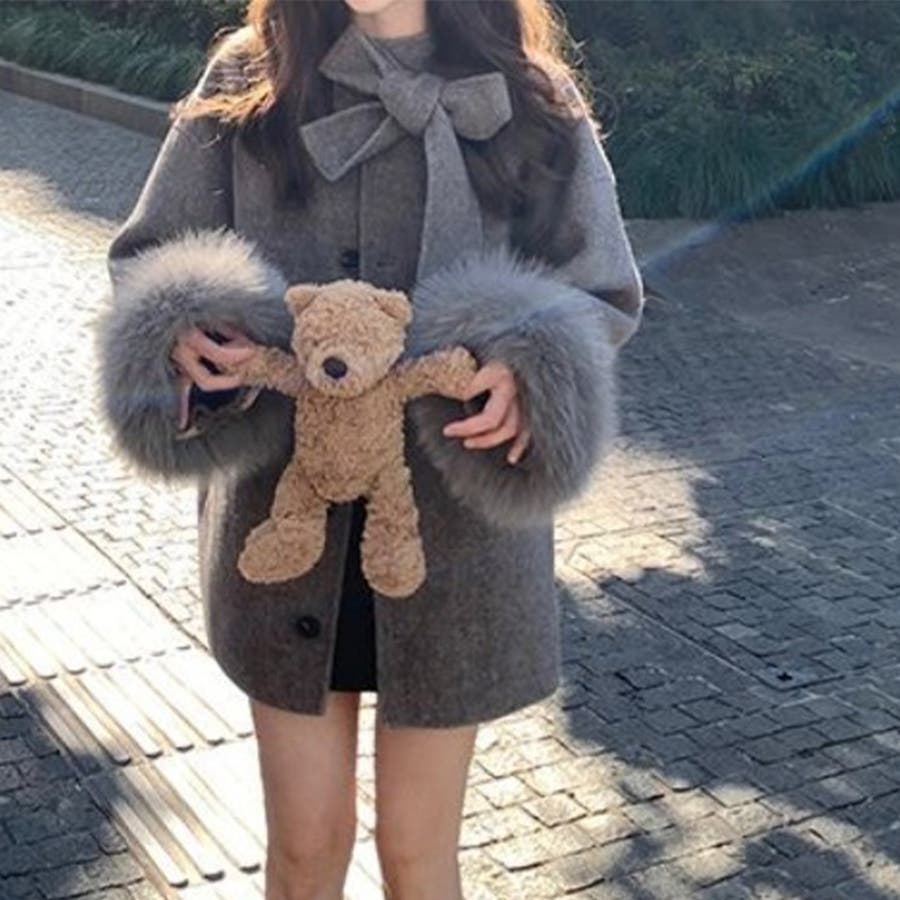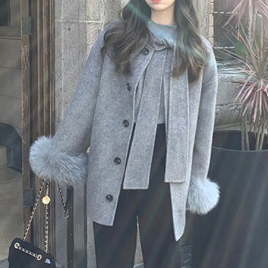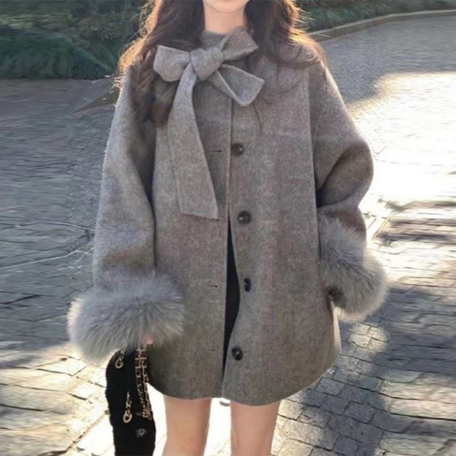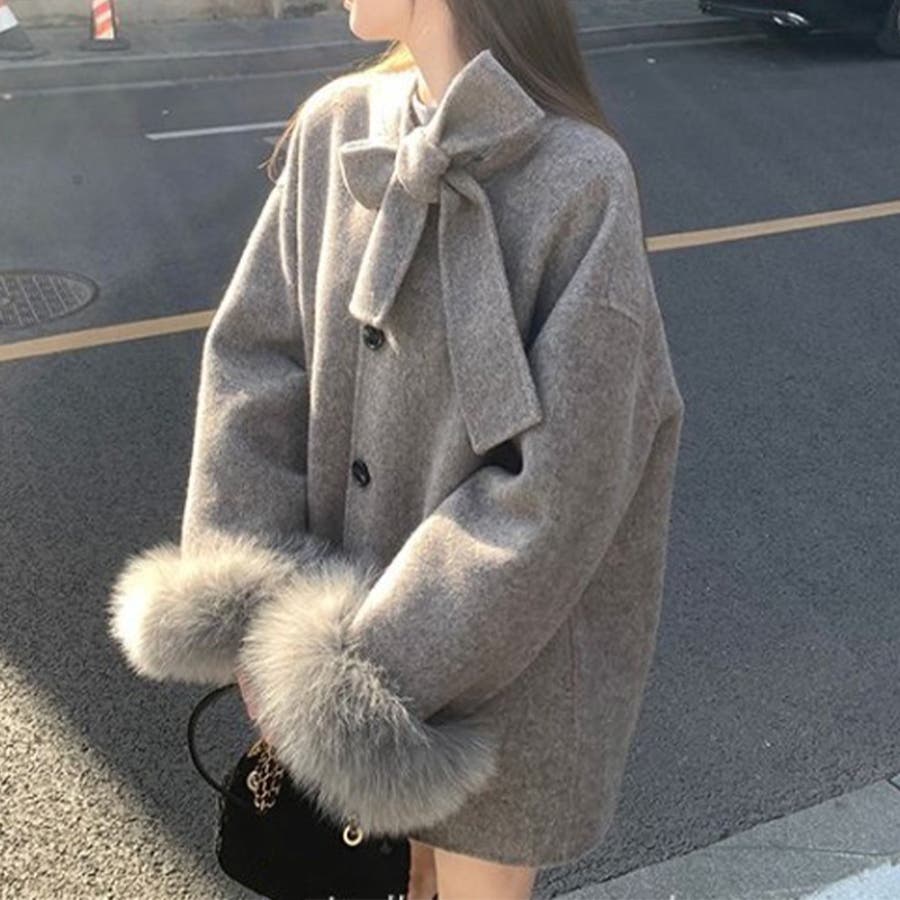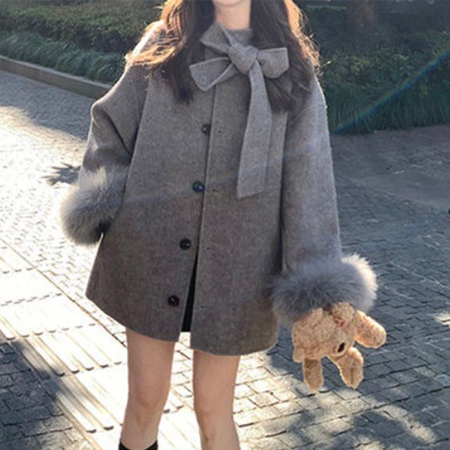 ゆるカワコーデ☆グレーウールコートミドル丈蝶結びケープコート