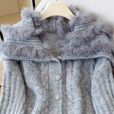 甘辛系ガールズ☆ニットカーディガンふんわり厚手ファーカラー付きアウター