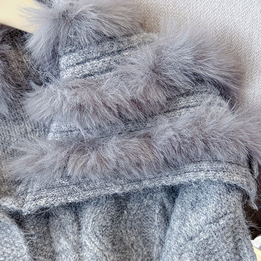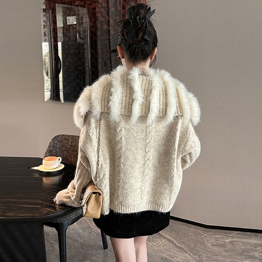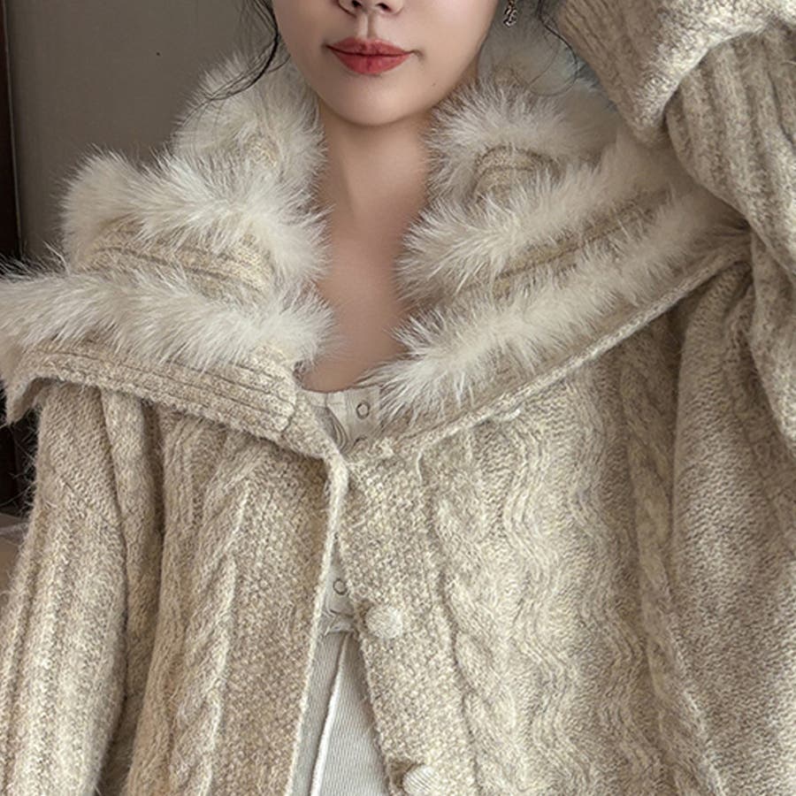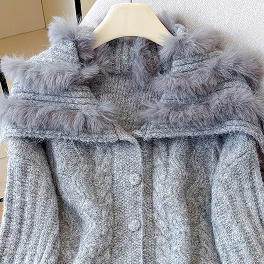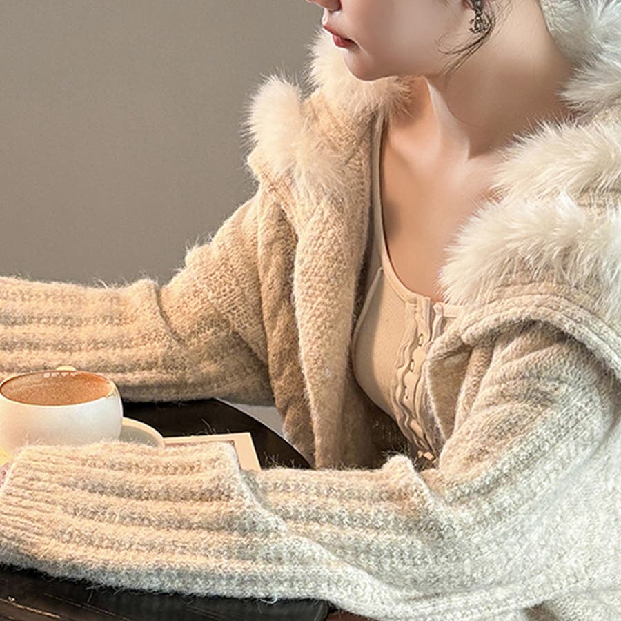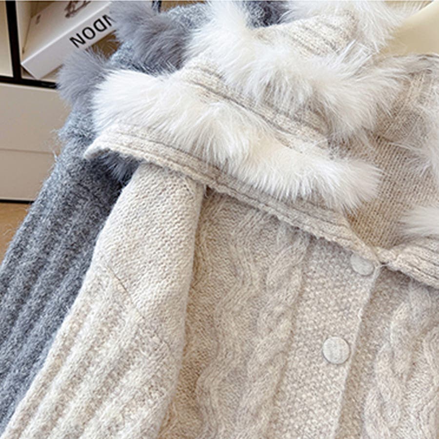 【グレー】甘辛系ガールズ☆ニットカーディガンふんわり厚手ファーカラー付きアウター