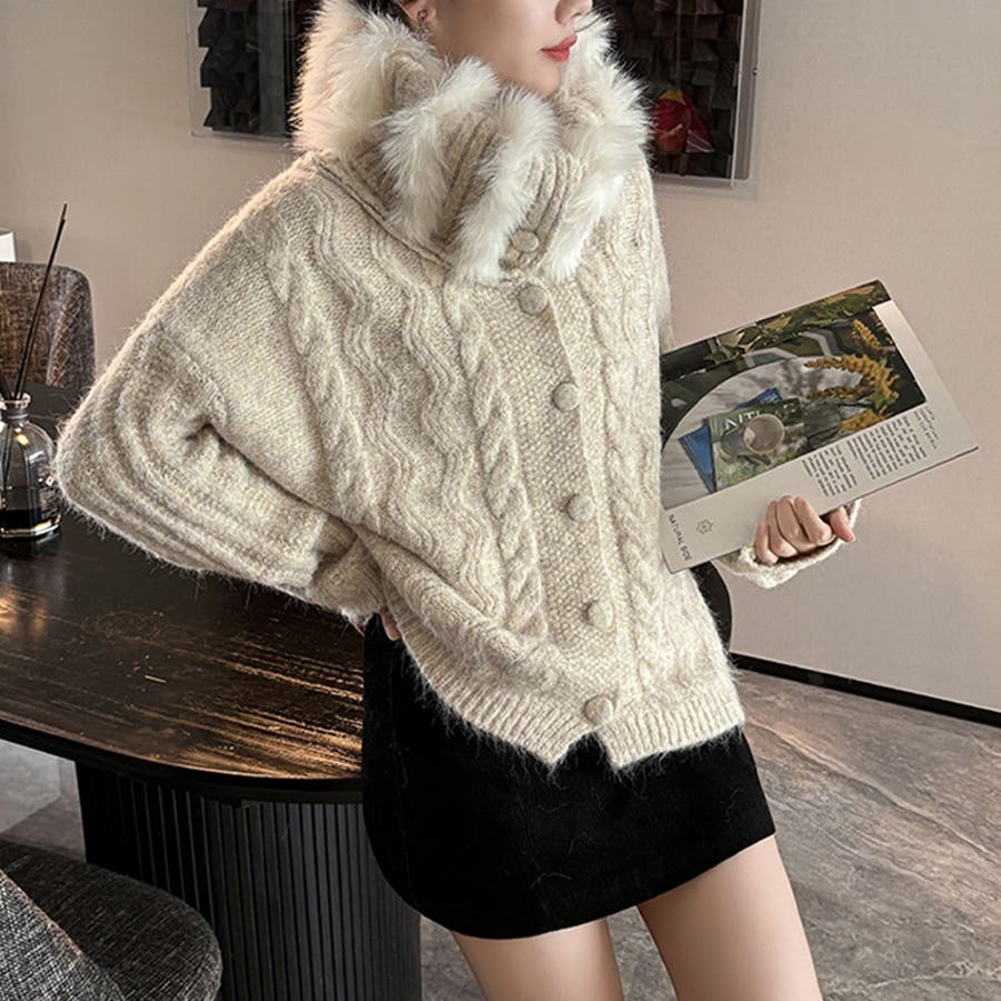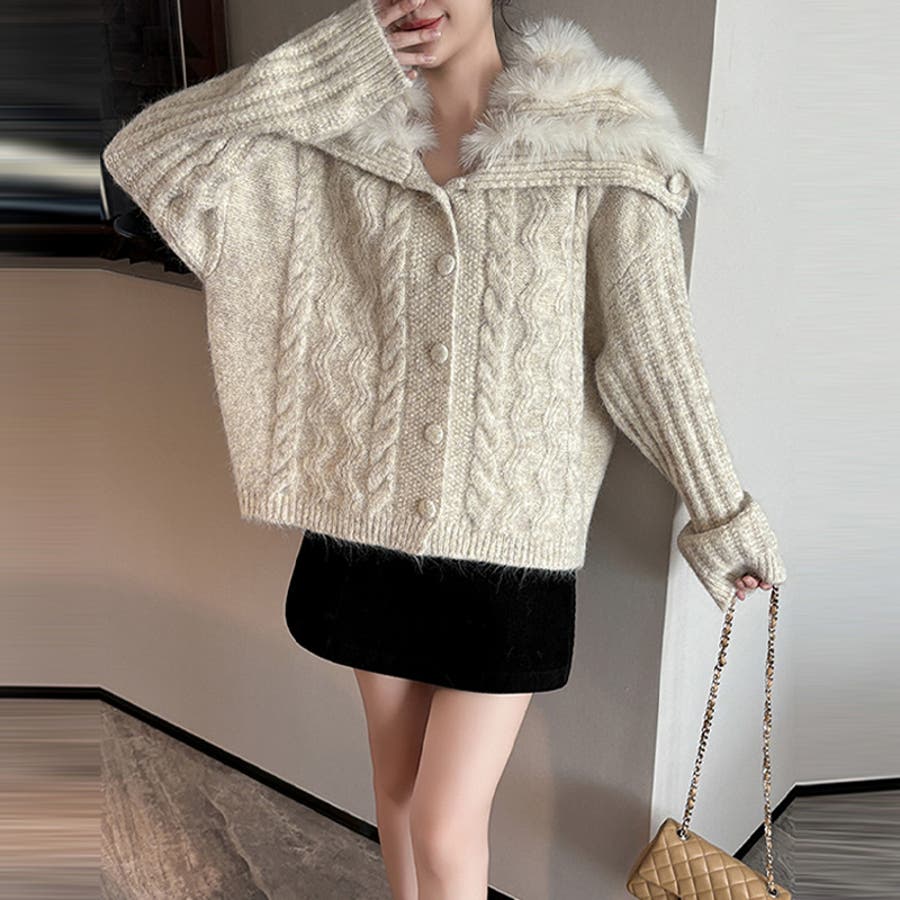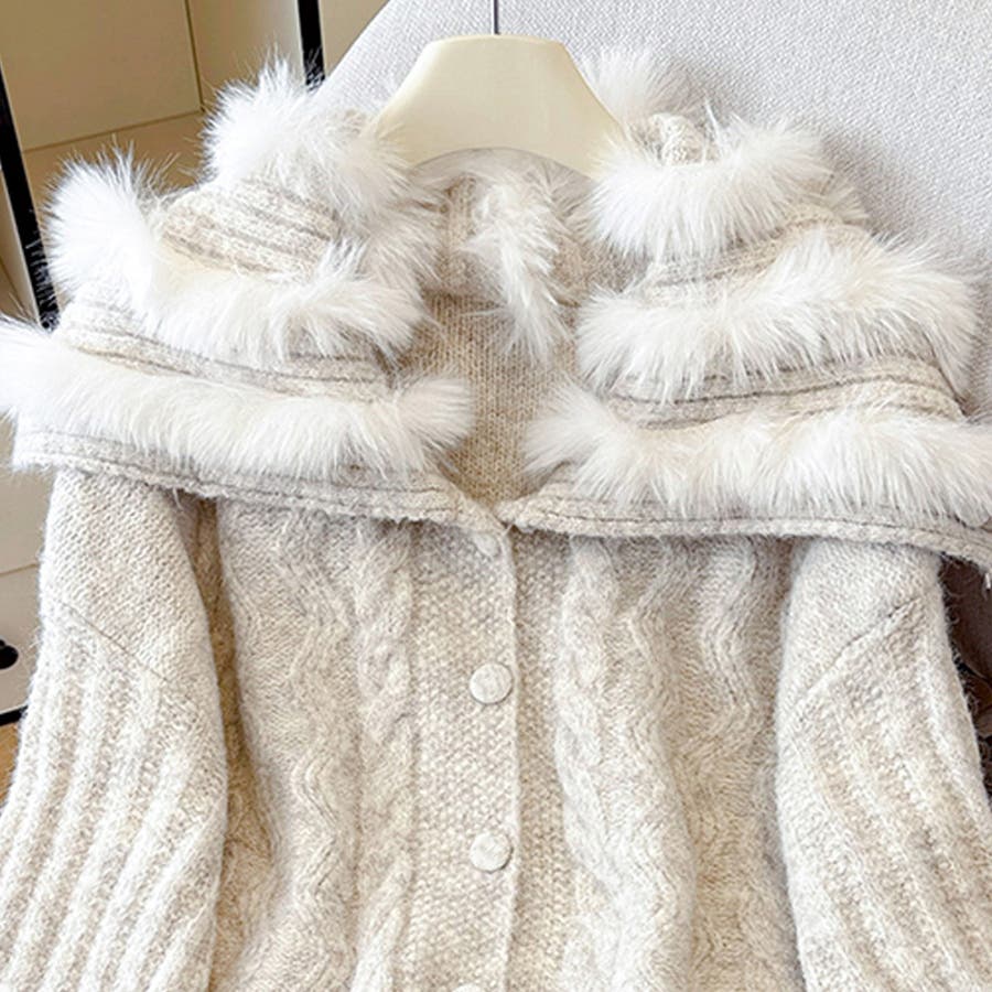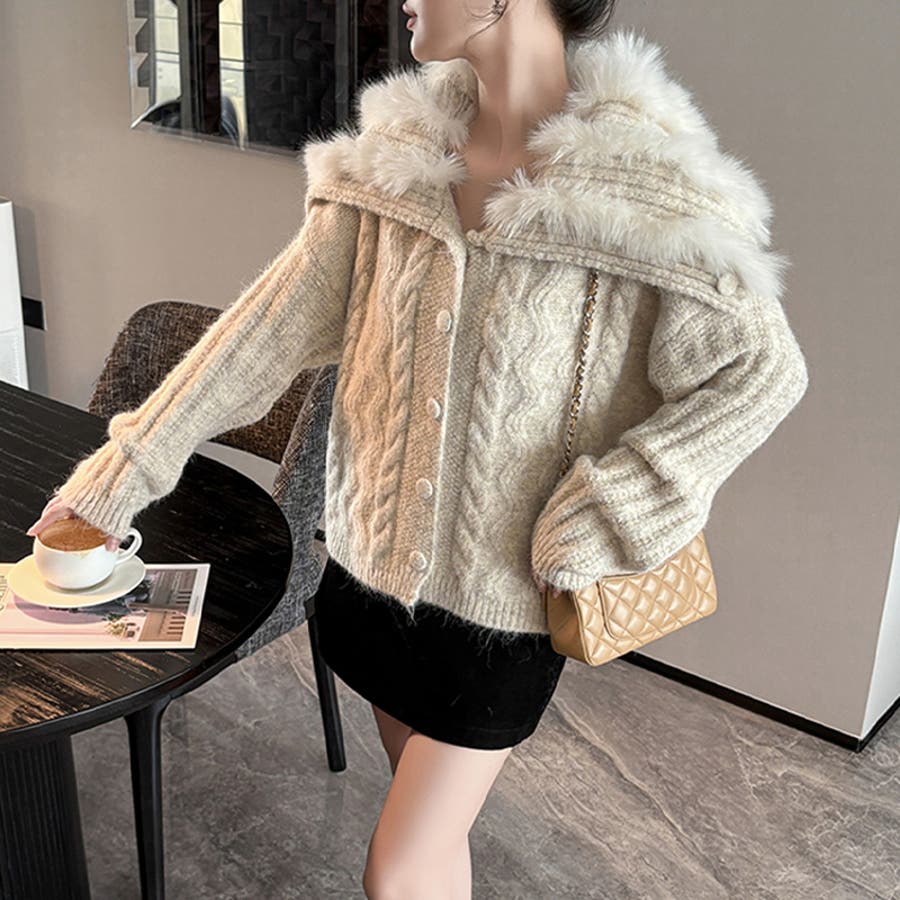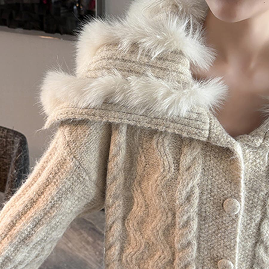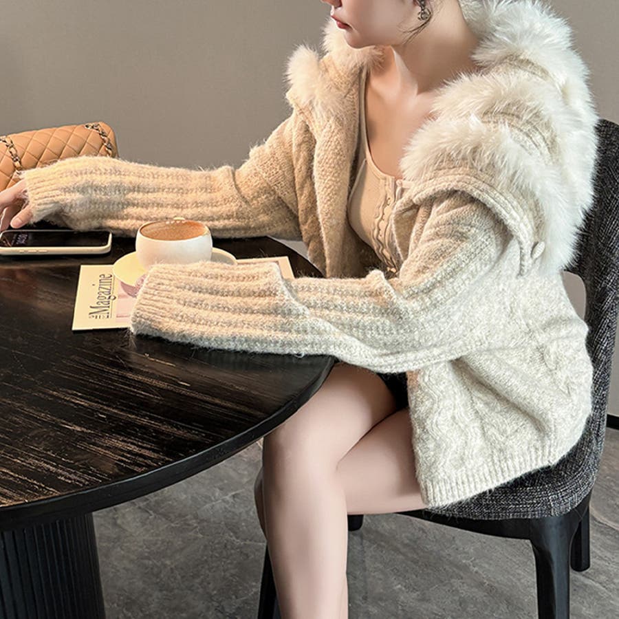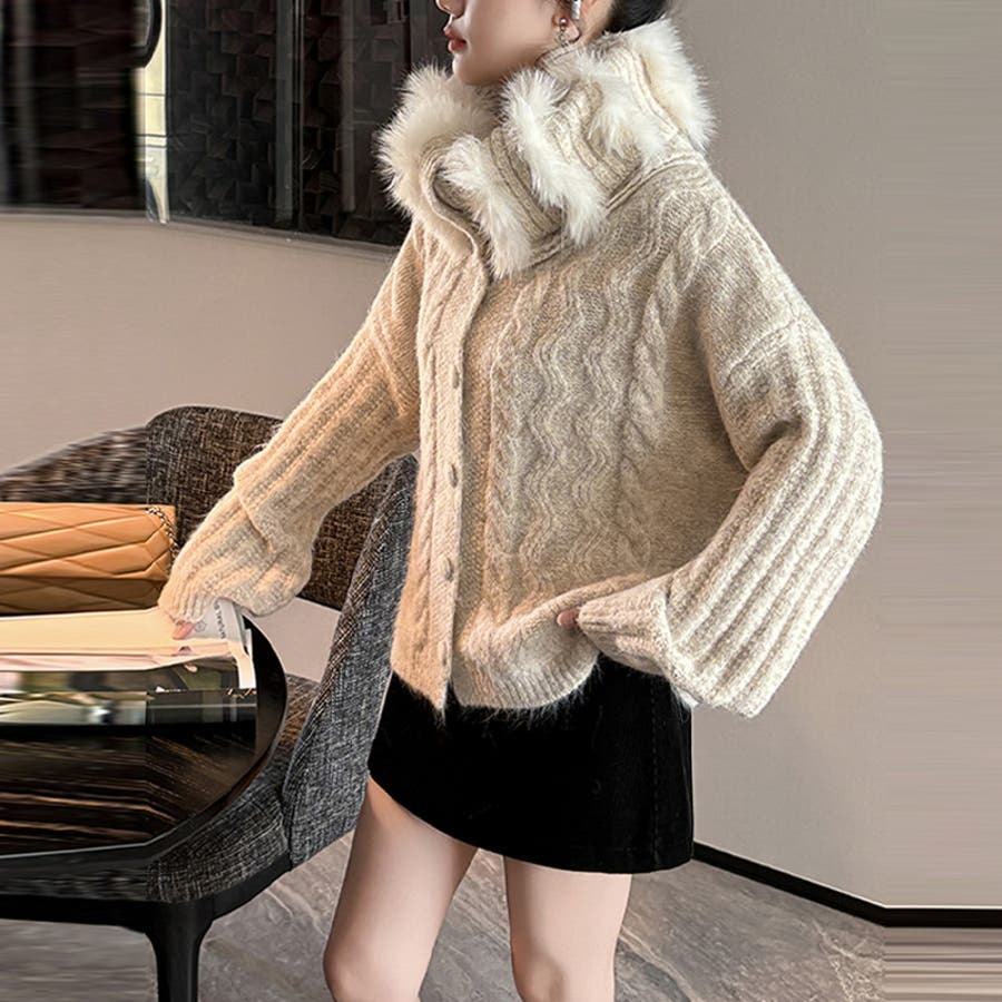 【グレー】甘辛系ガールズ☆ニットカーディガンふんわり厚手ファーカラー付きアウター