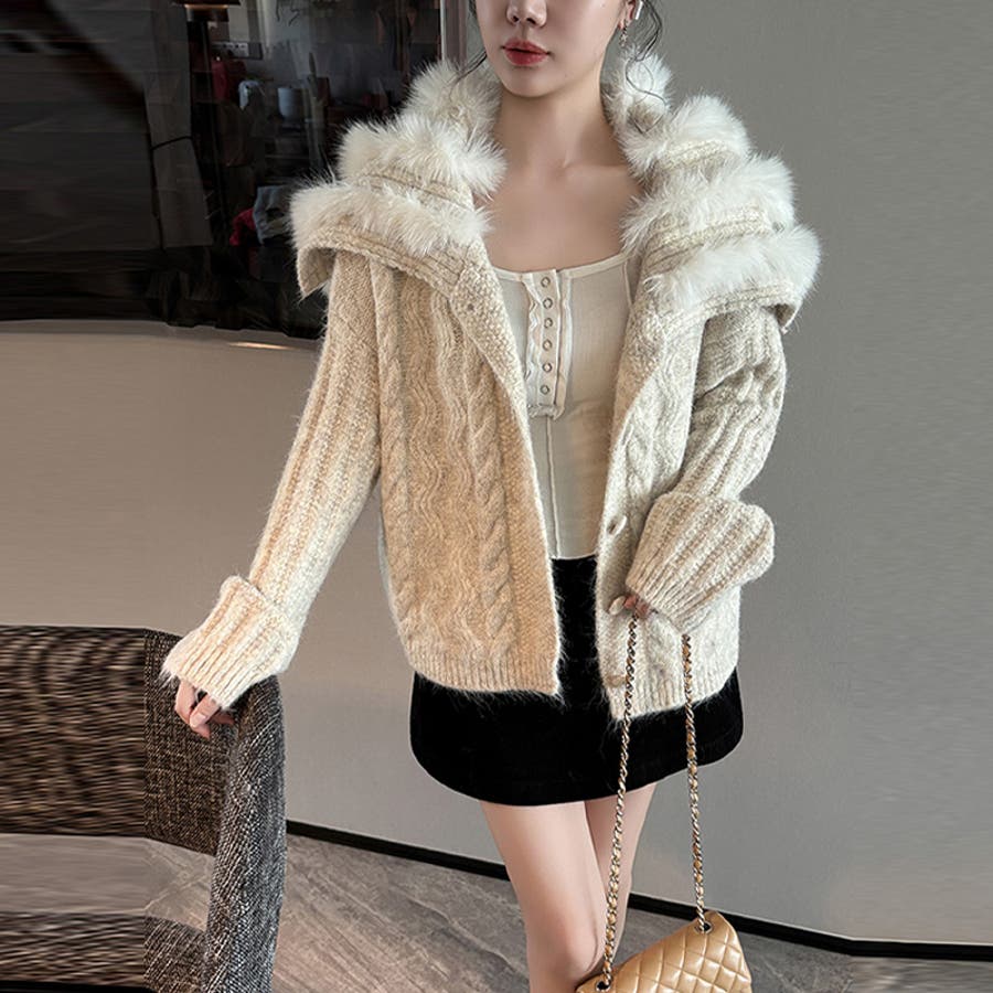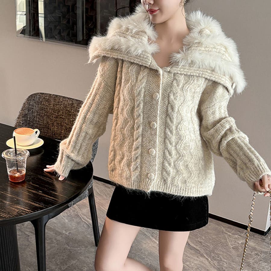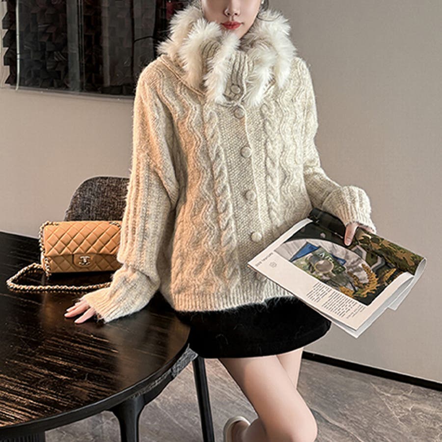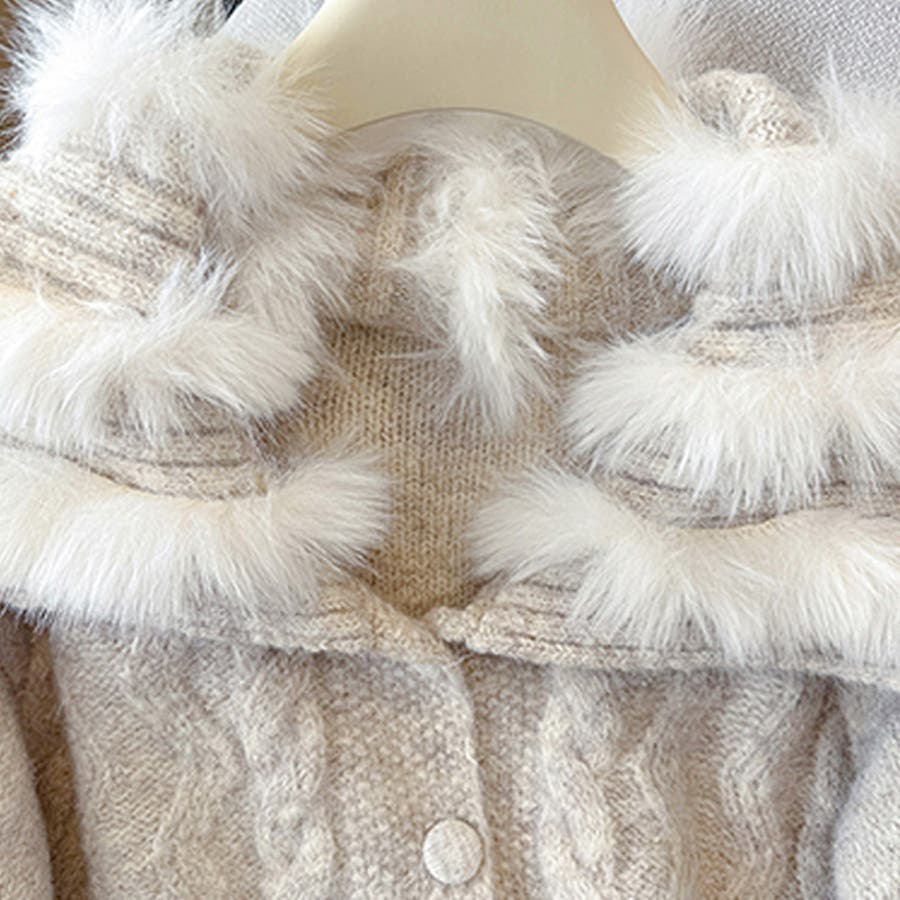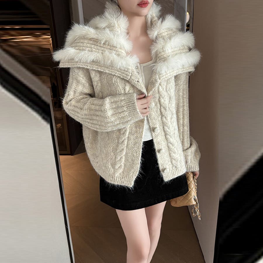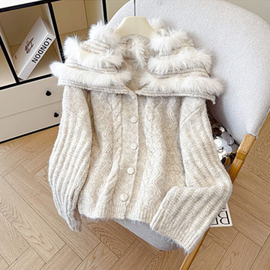 【グレー】甘辛系ガールズ☆ニットカーディガンふんわり厚手ファーカラー付きアウター