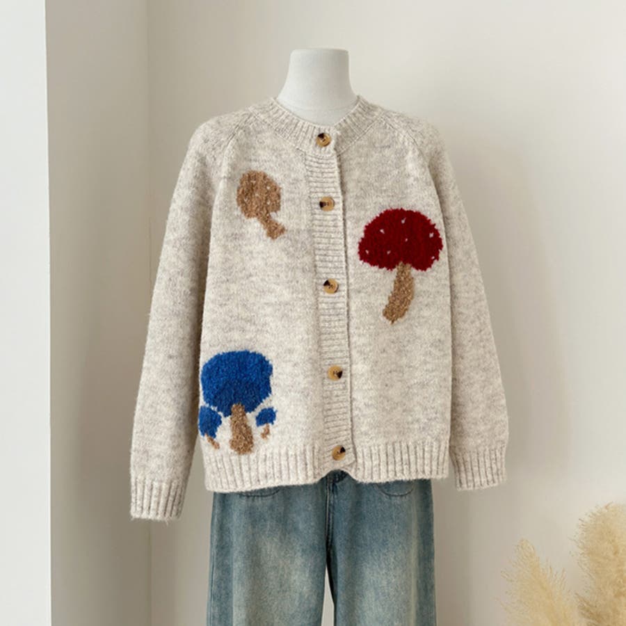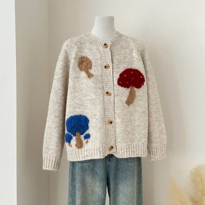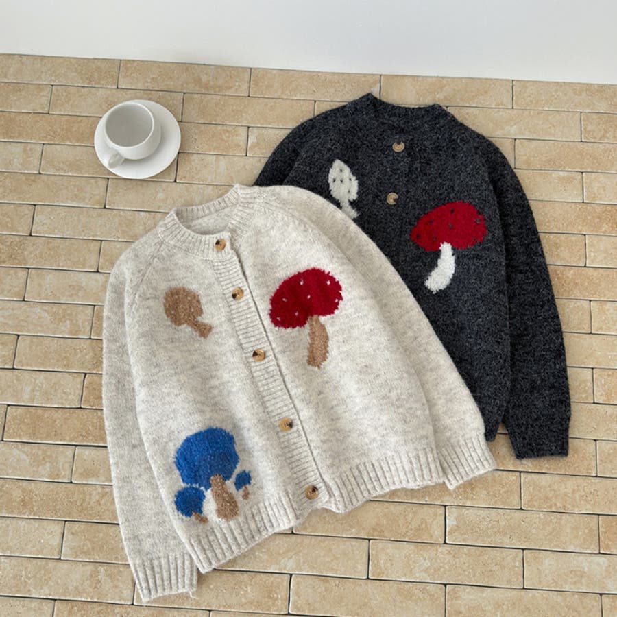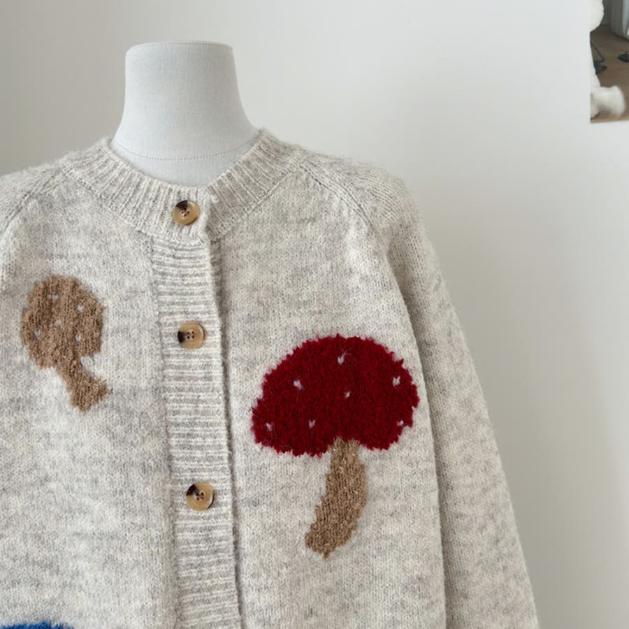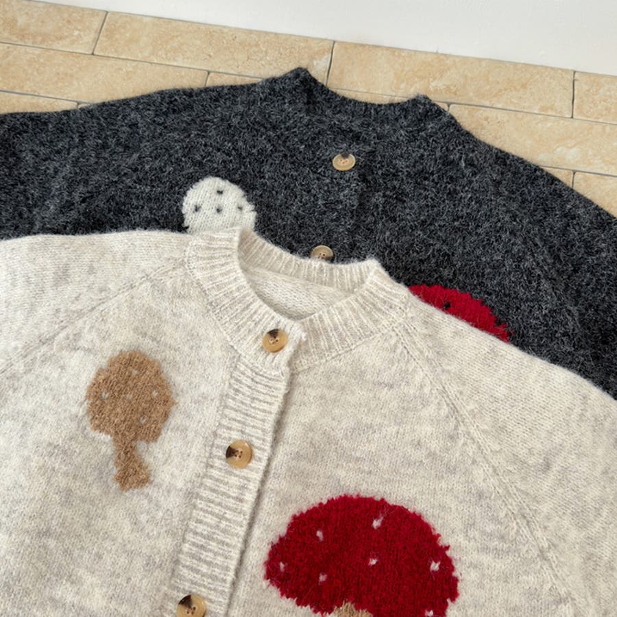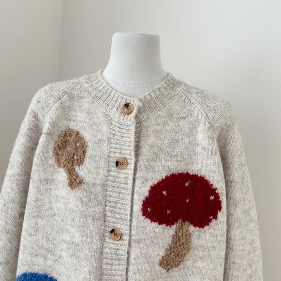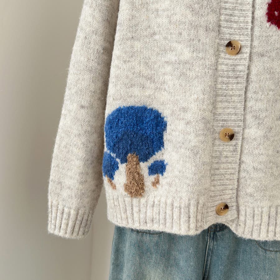 ゆるカワコーデ☆マッシュルーム柄カーディガン グレー ニットアウター
