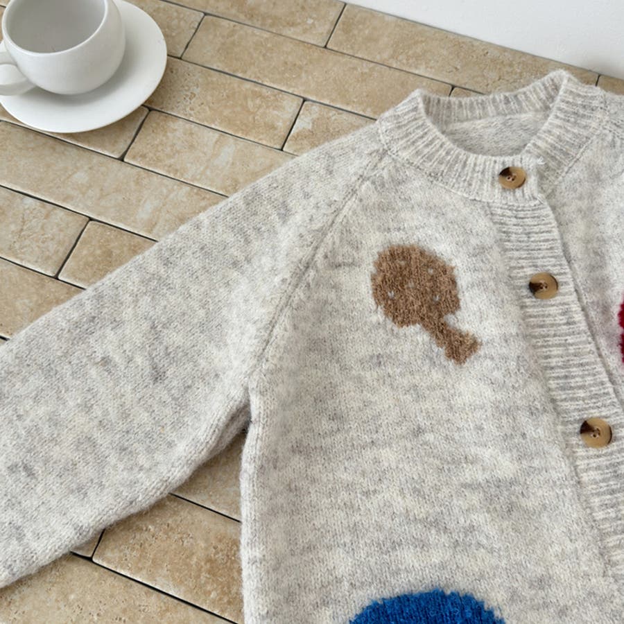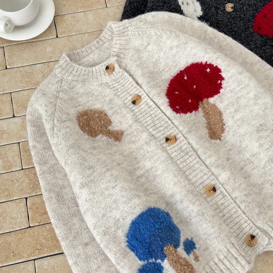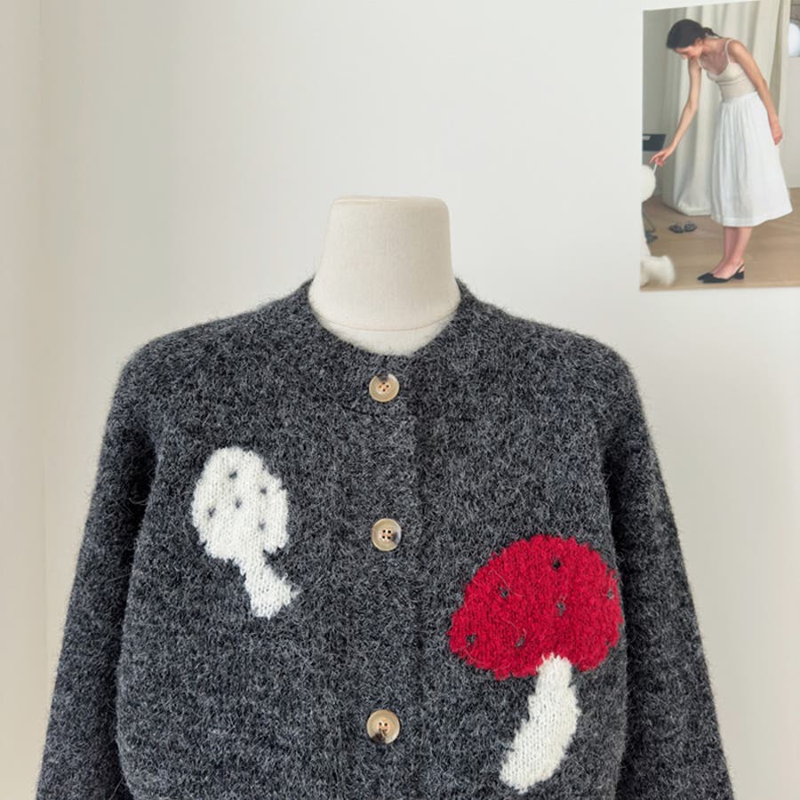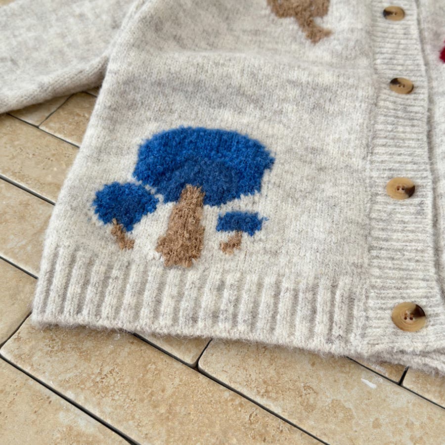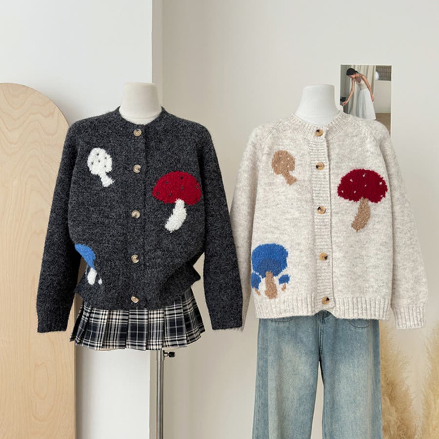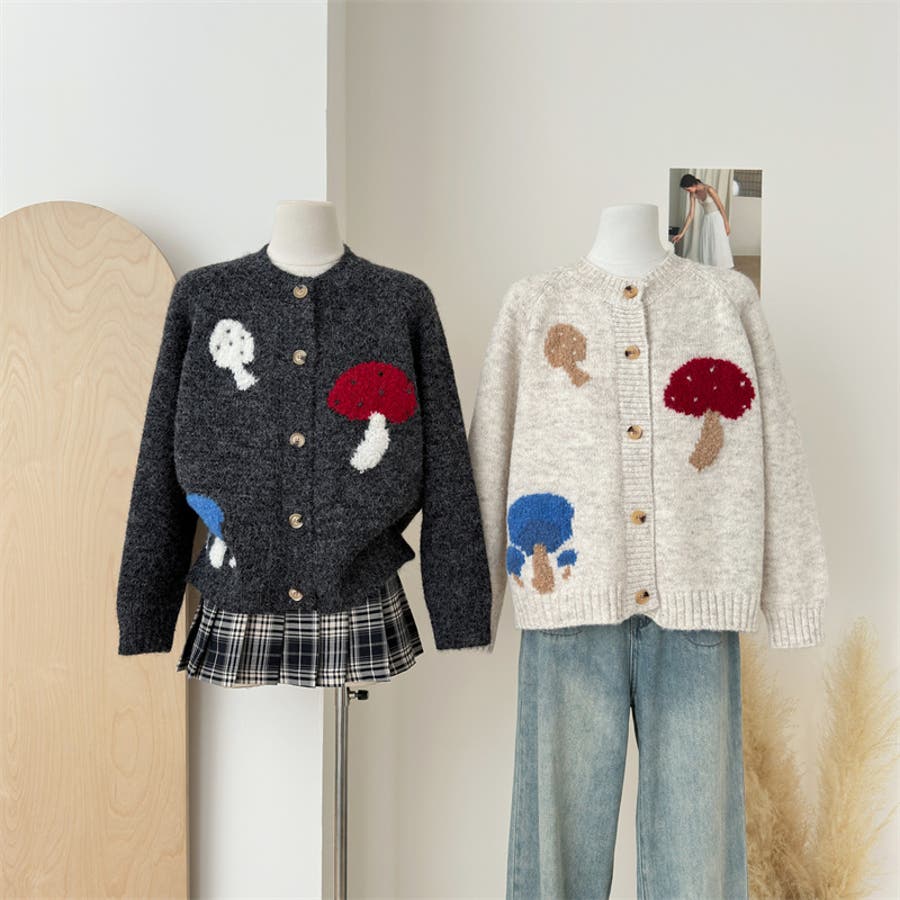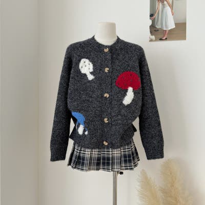 ゆるカワコーデ☆マッシュルーム柄カーディガン グレー ニットアウター