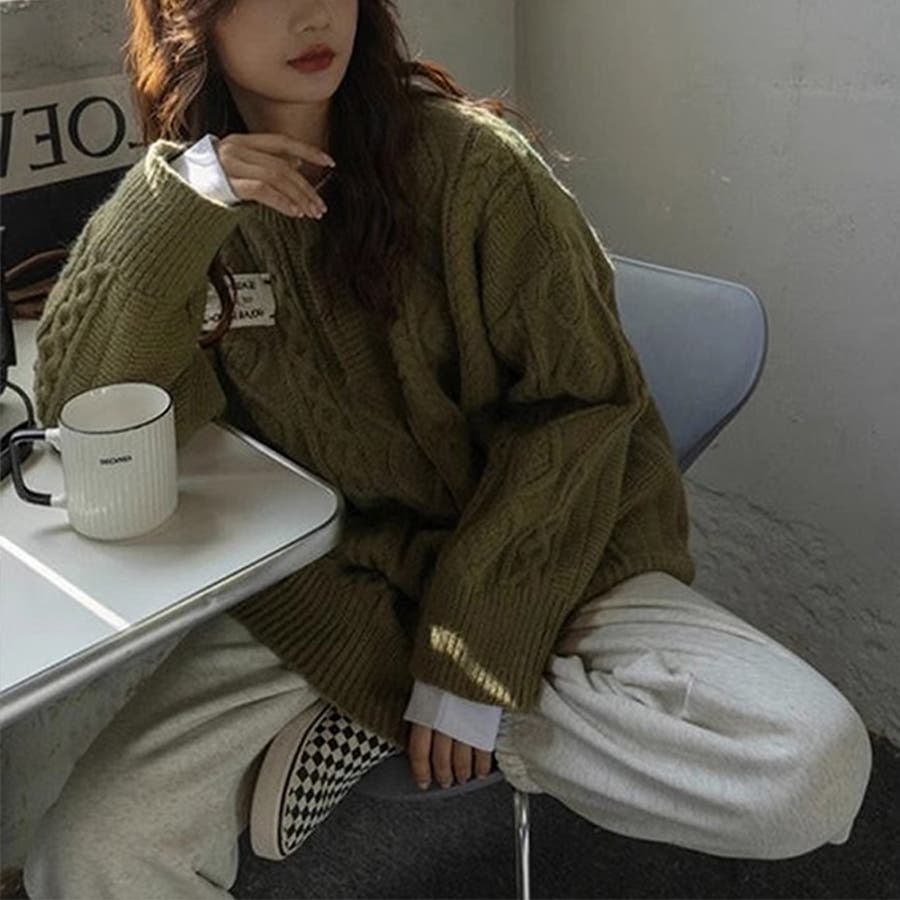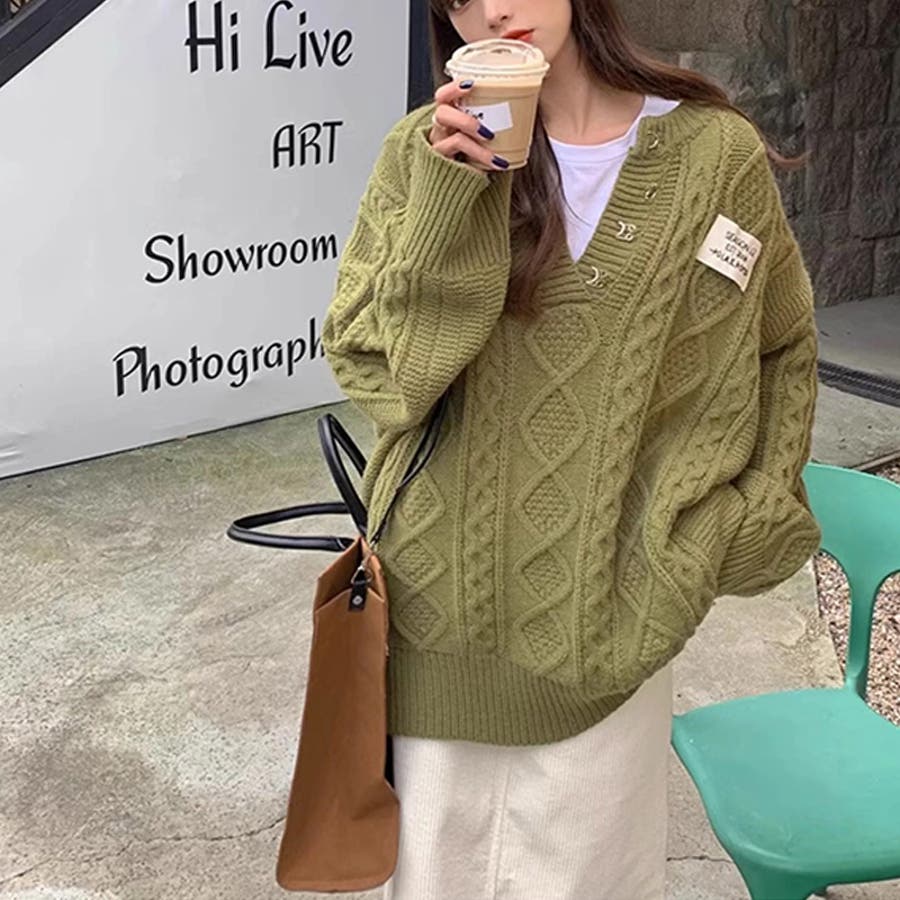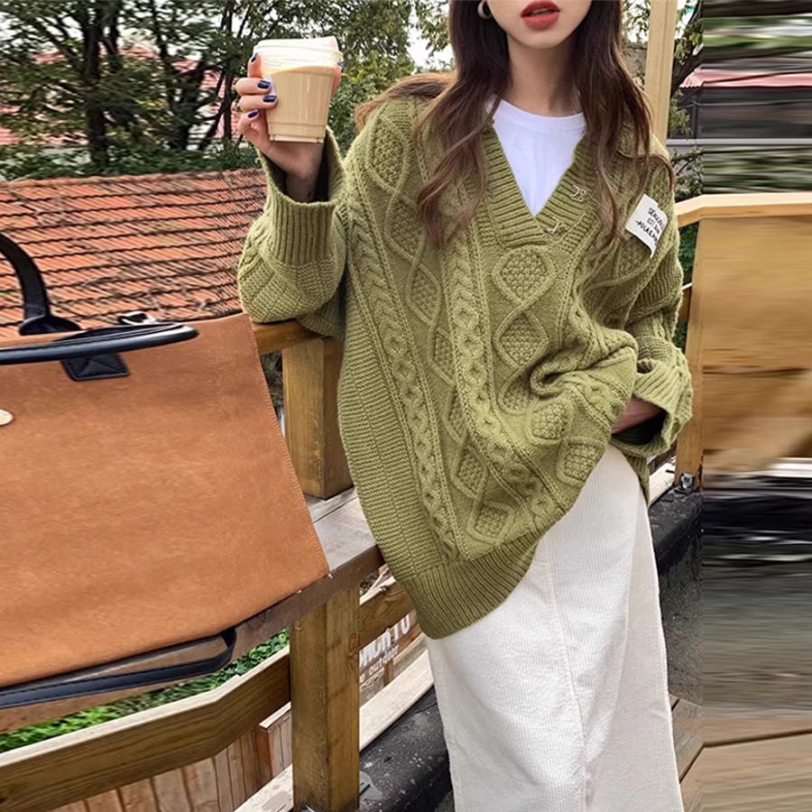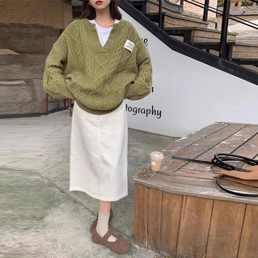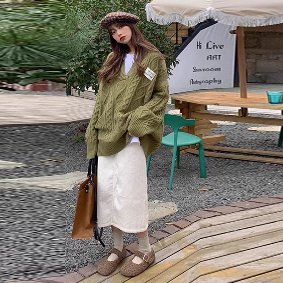 ゆるカワコーデ☆ミディ丈 レトロ編みVネックセーター