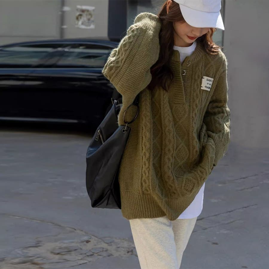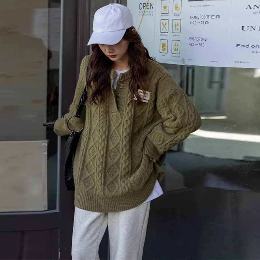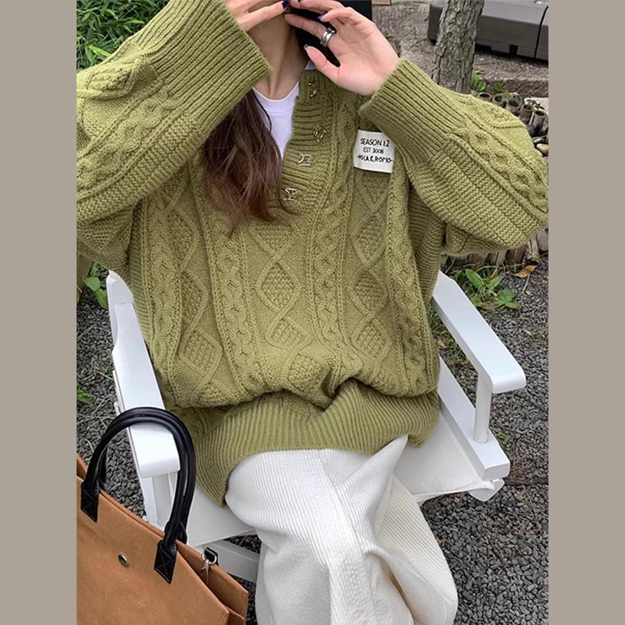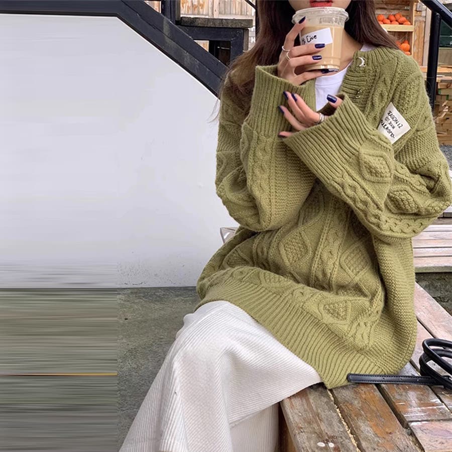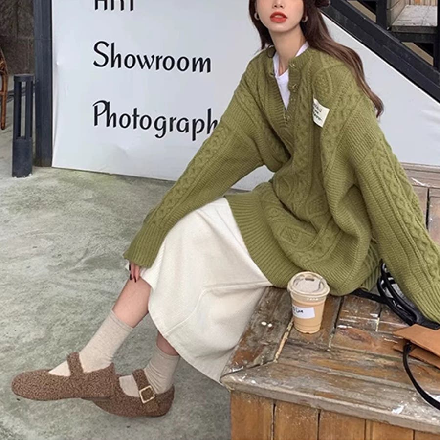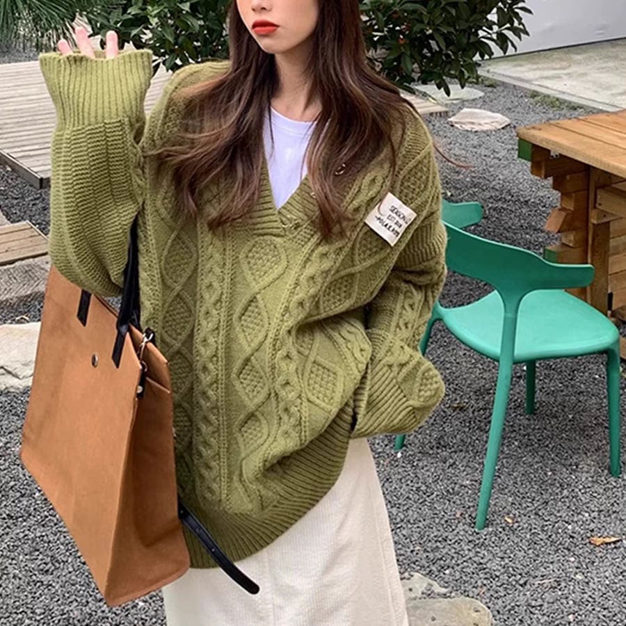 ゆるカワコーデ☆ミディ丈 レトロ編みVネックセーター