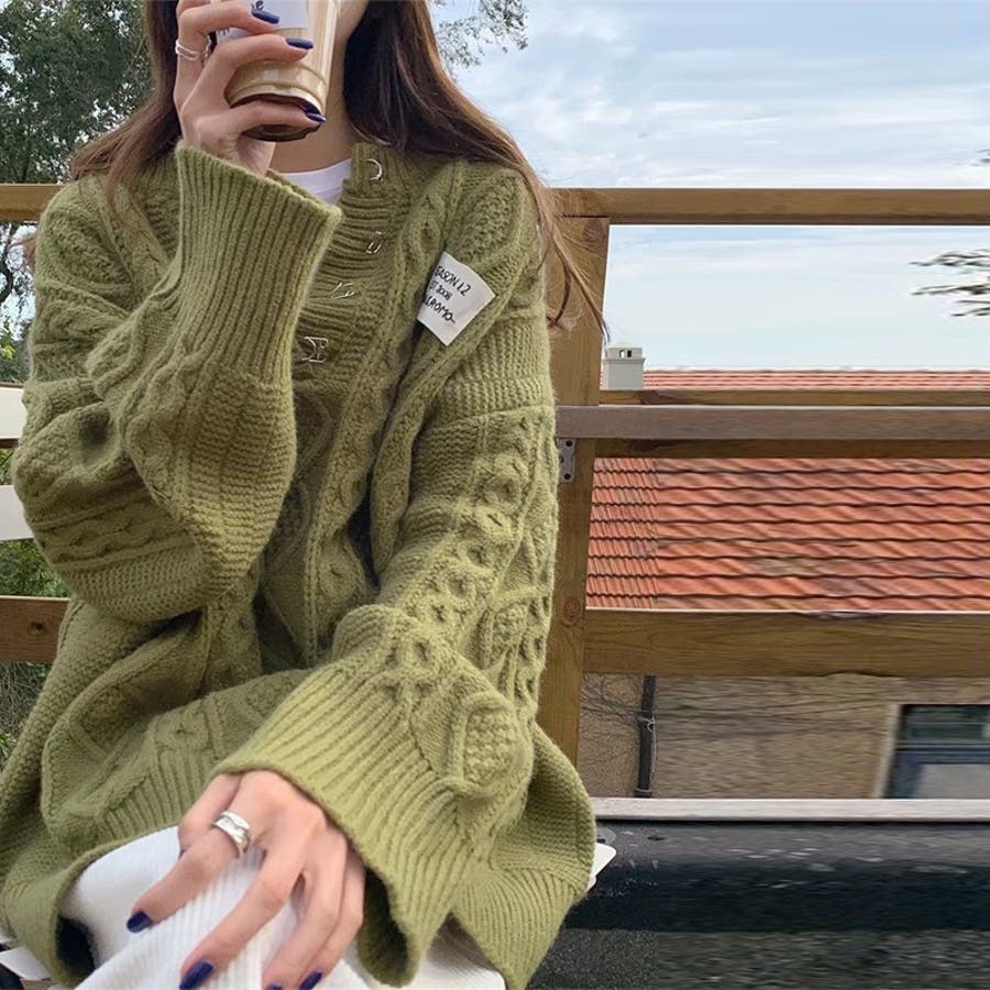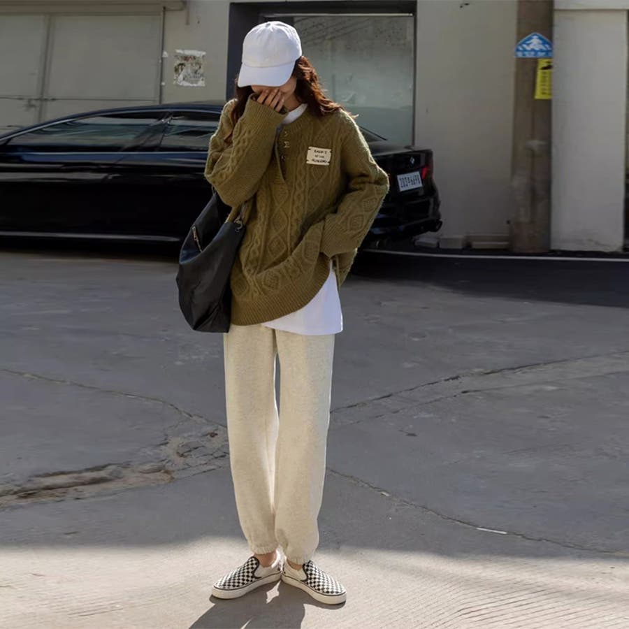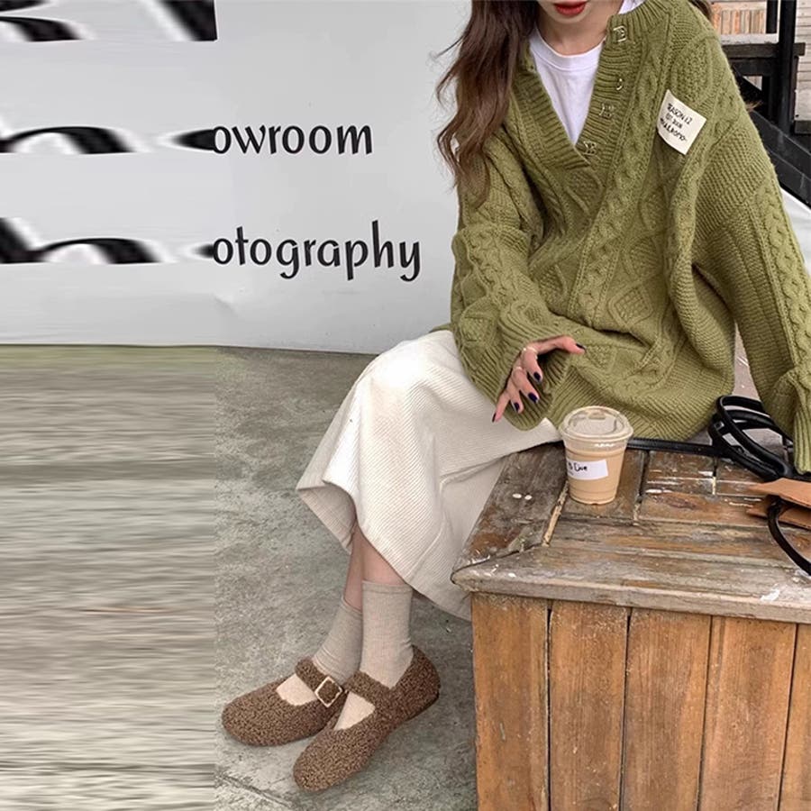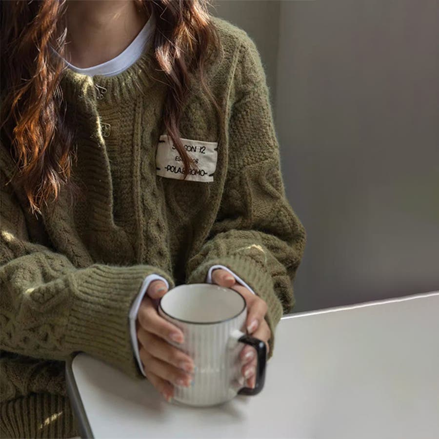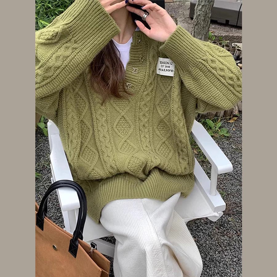 ゆるカワコーデ☆ミディ丈 レトロ編みVネックセーター
