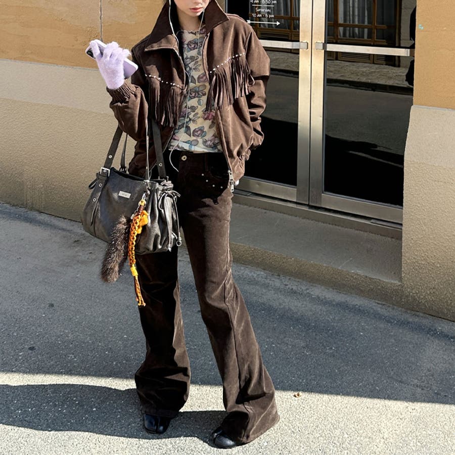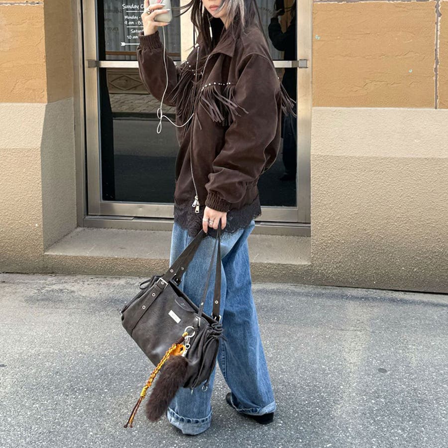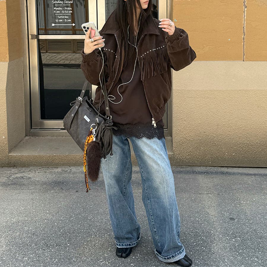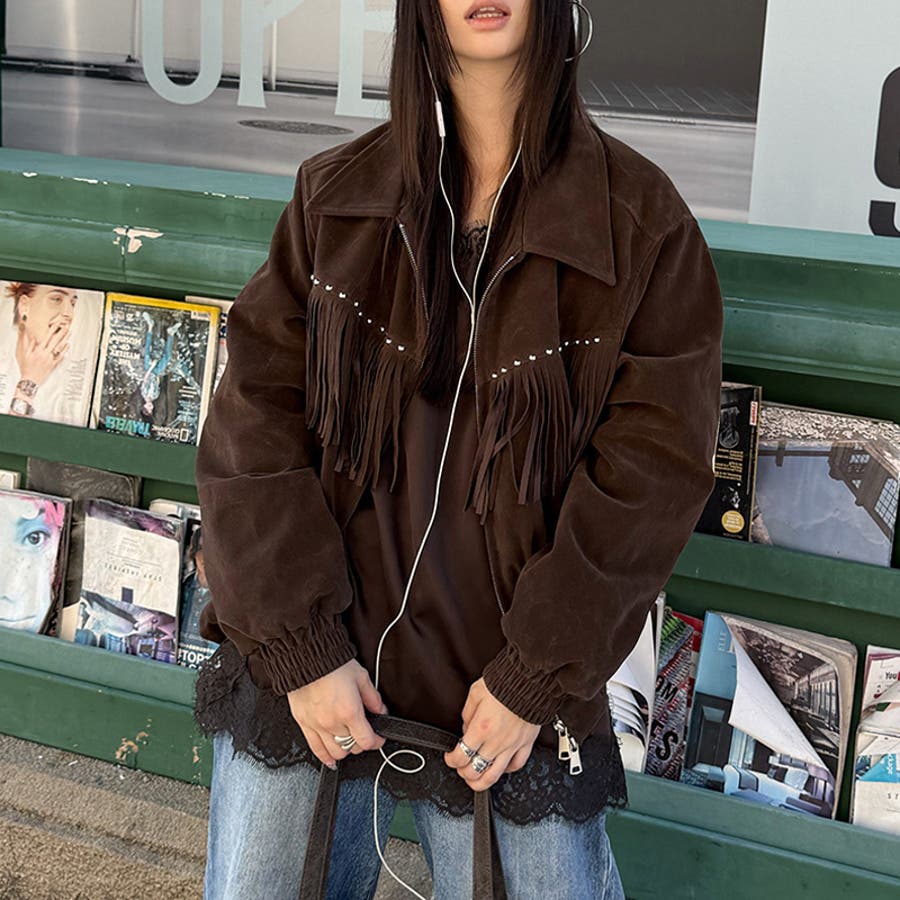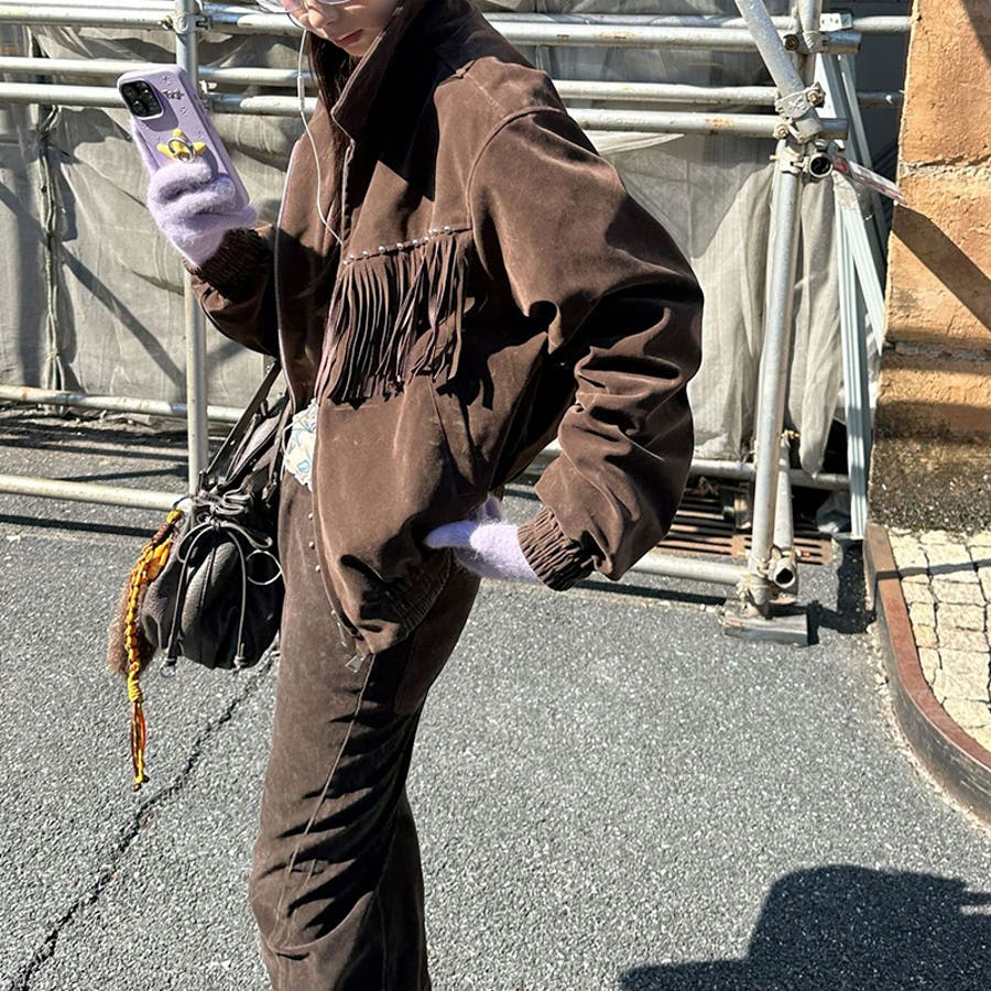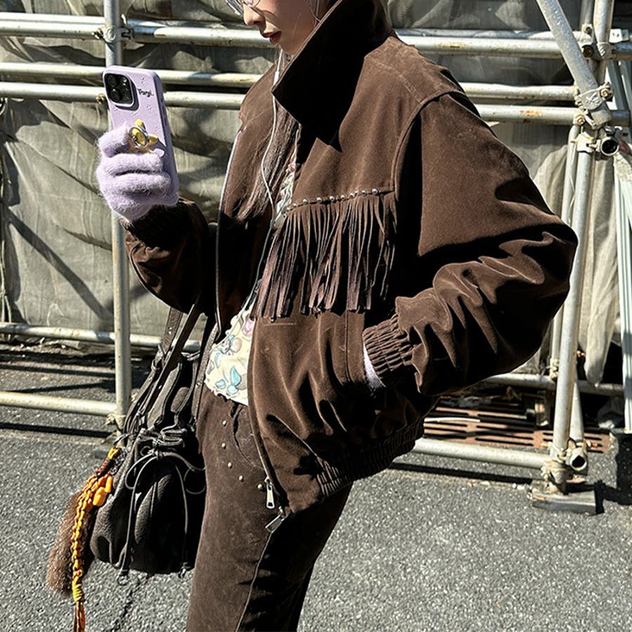 ユニセックス☆スエード中綿ジャケットフリンジスタッズ付