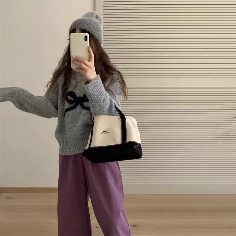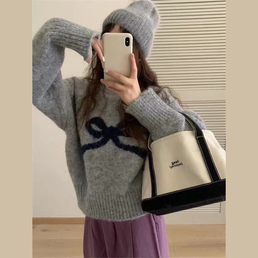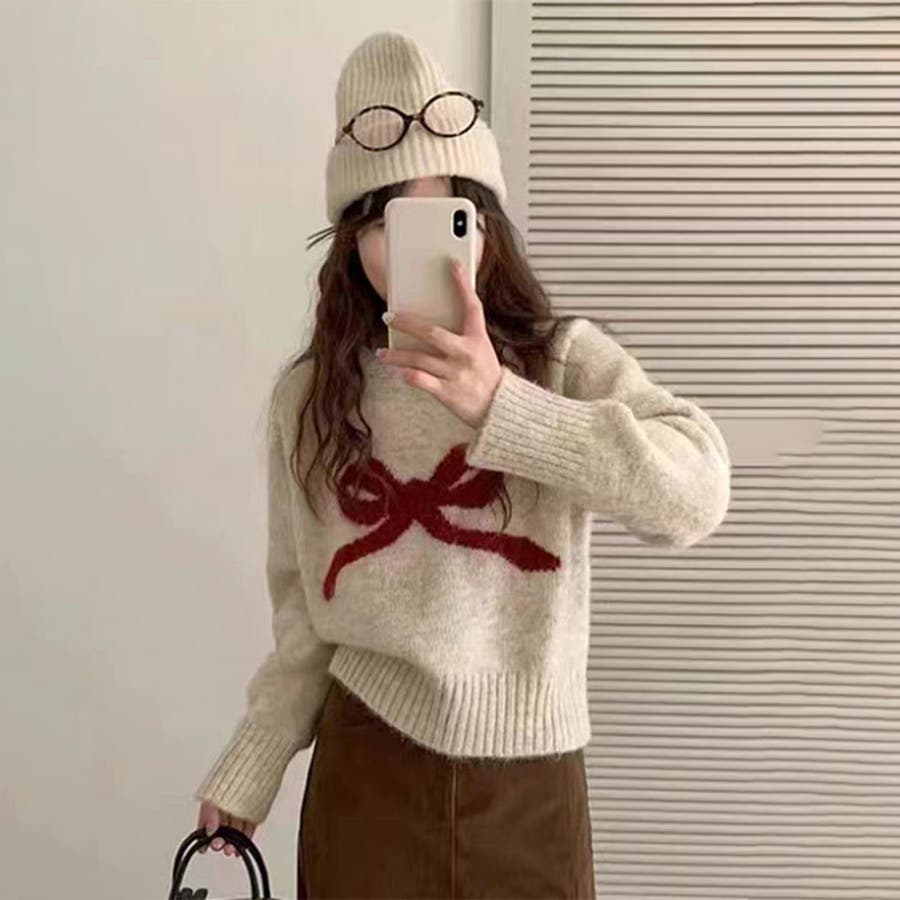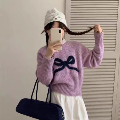 レトロな学院風柄物!カシミヤ蝶結びラウンドネックニットプルオーバー短丈