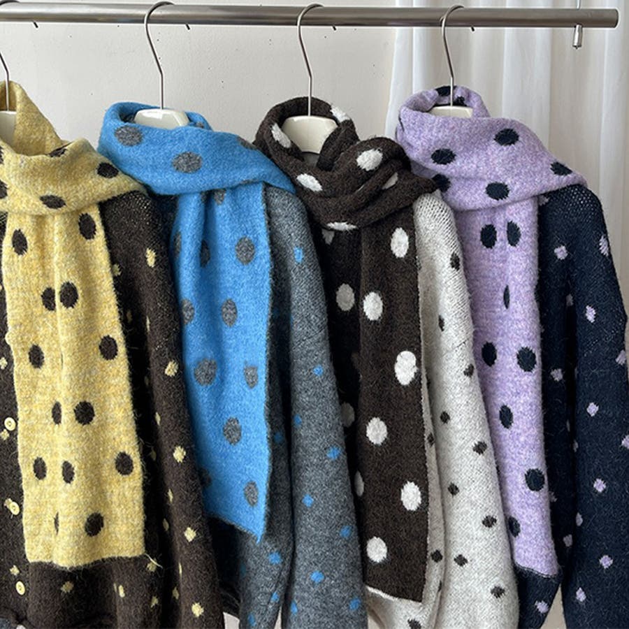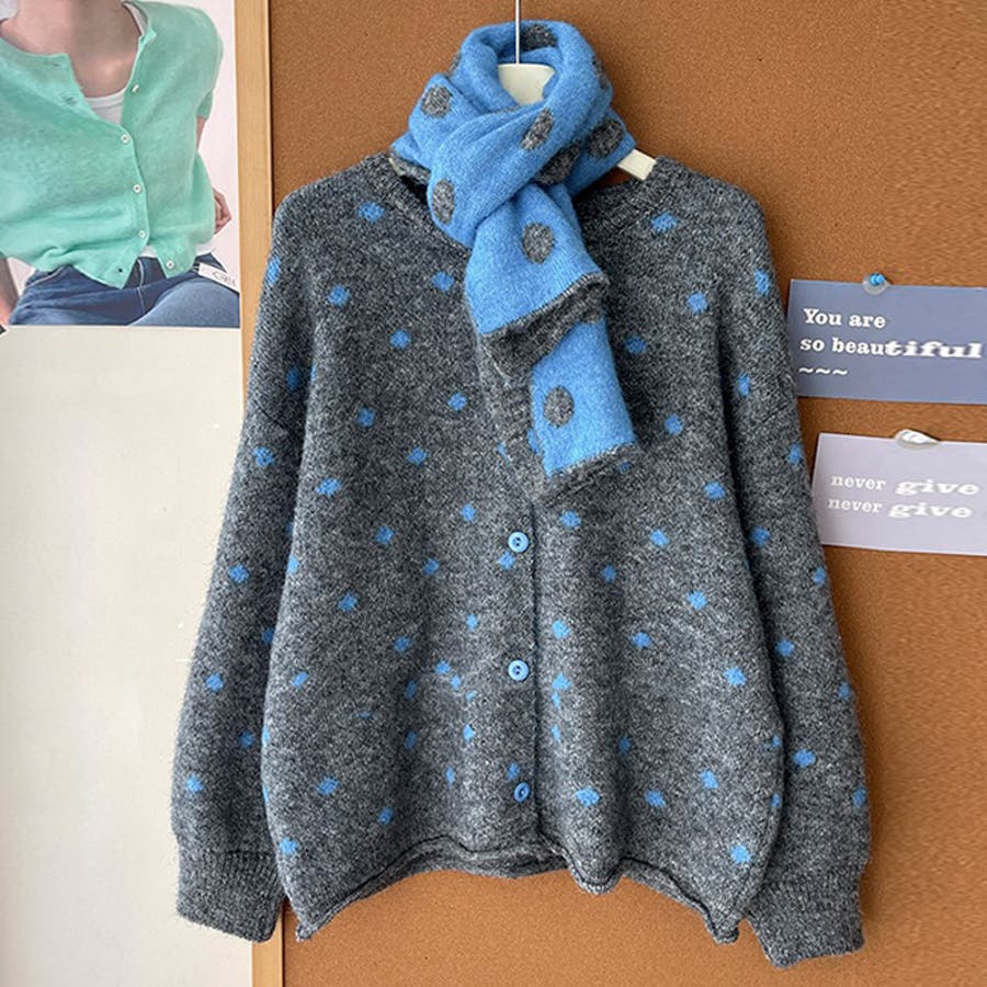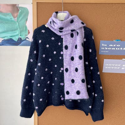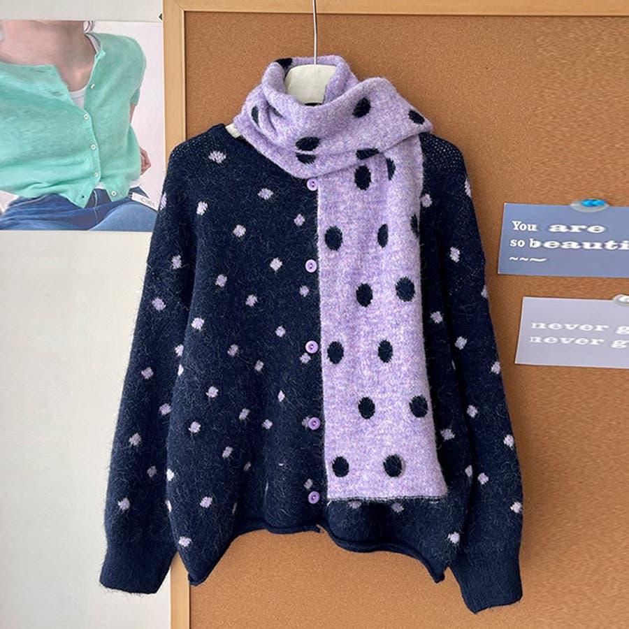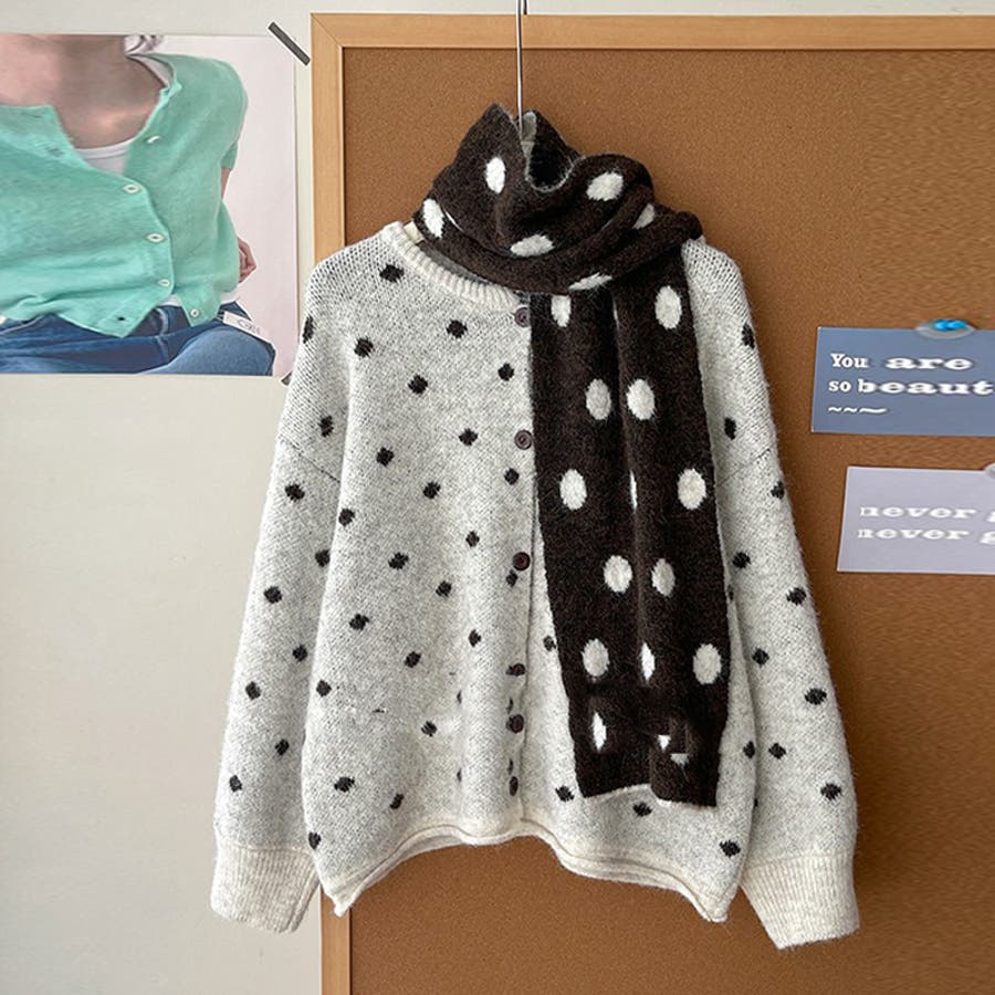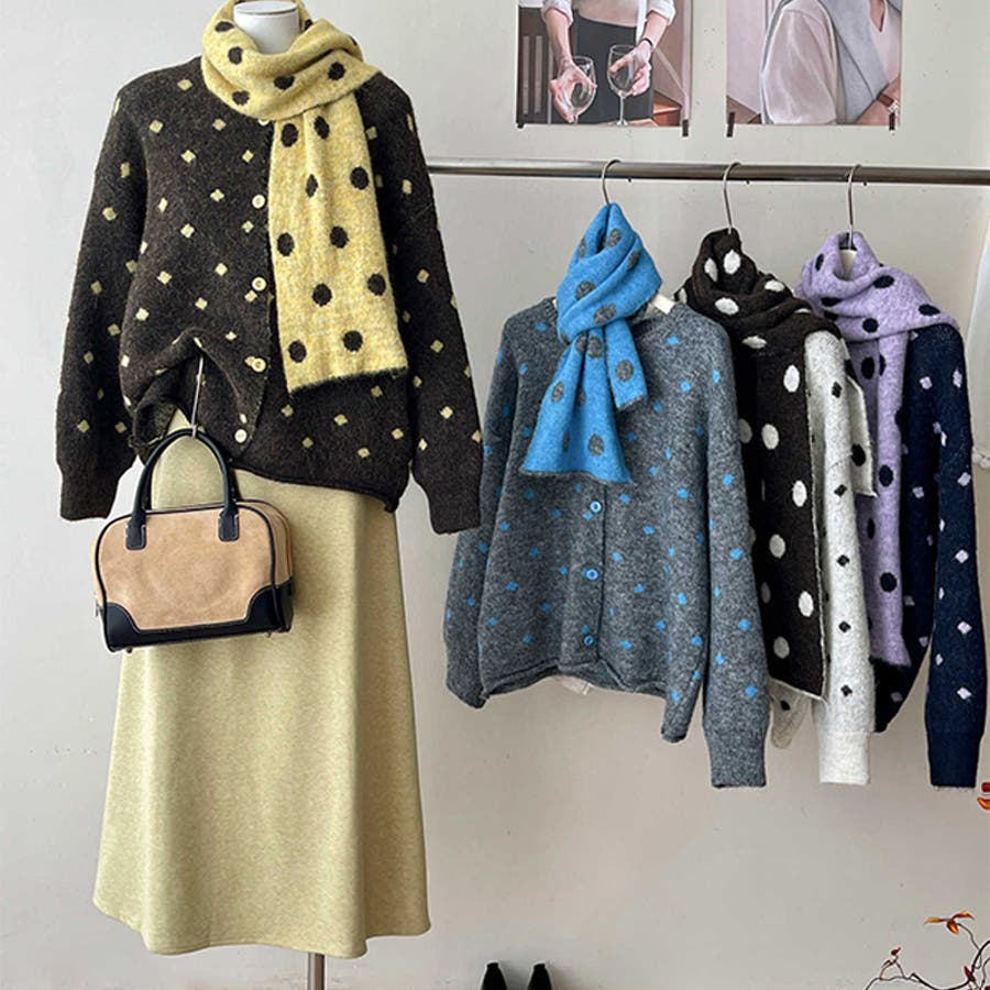 ゆるカワコーデ☆ドット柄ニットカーディガンマフラー付2点セット