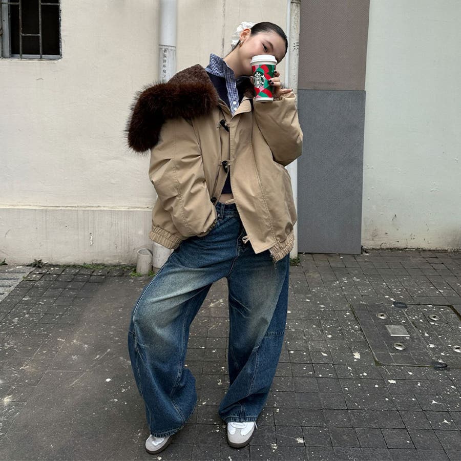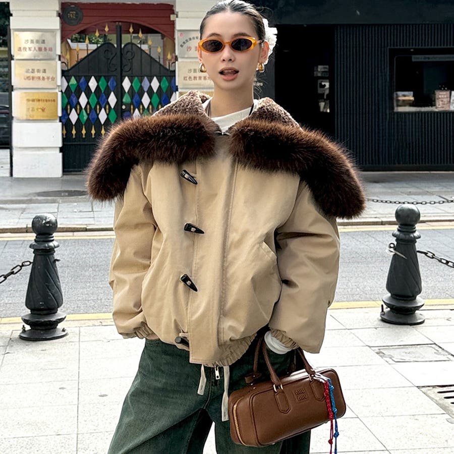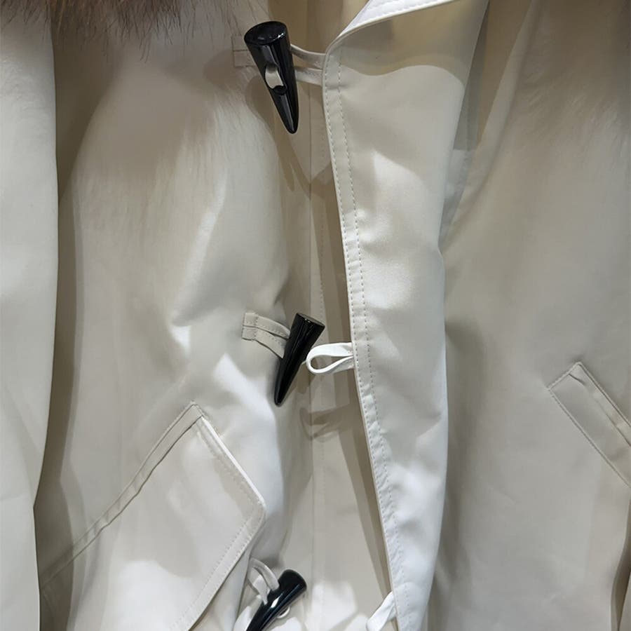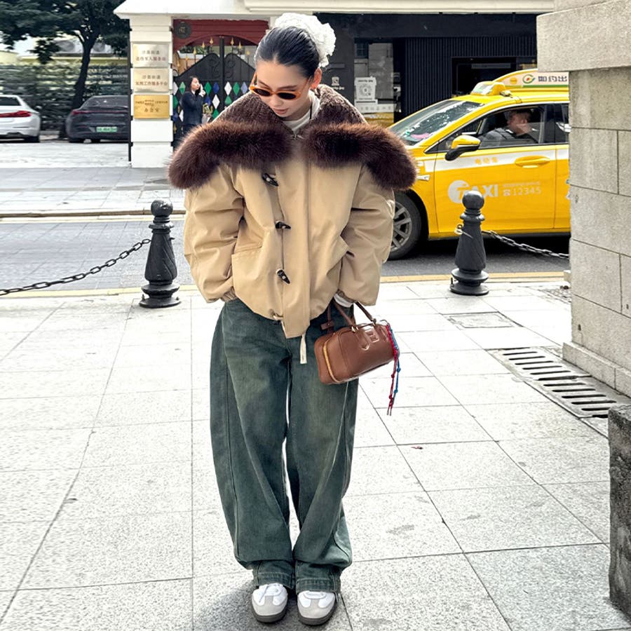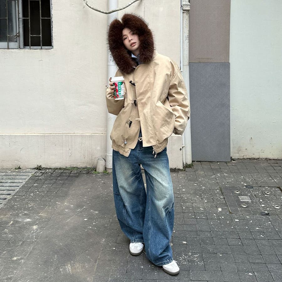 ユニセックス☆ストリート系厚手キルティング牛角ボタンファー付きパーカー
