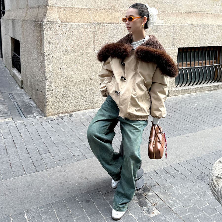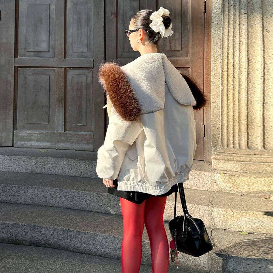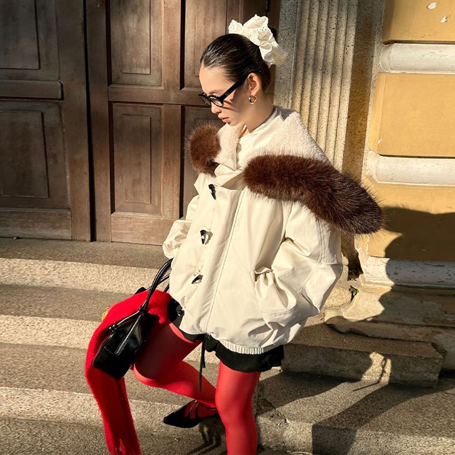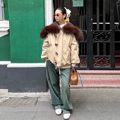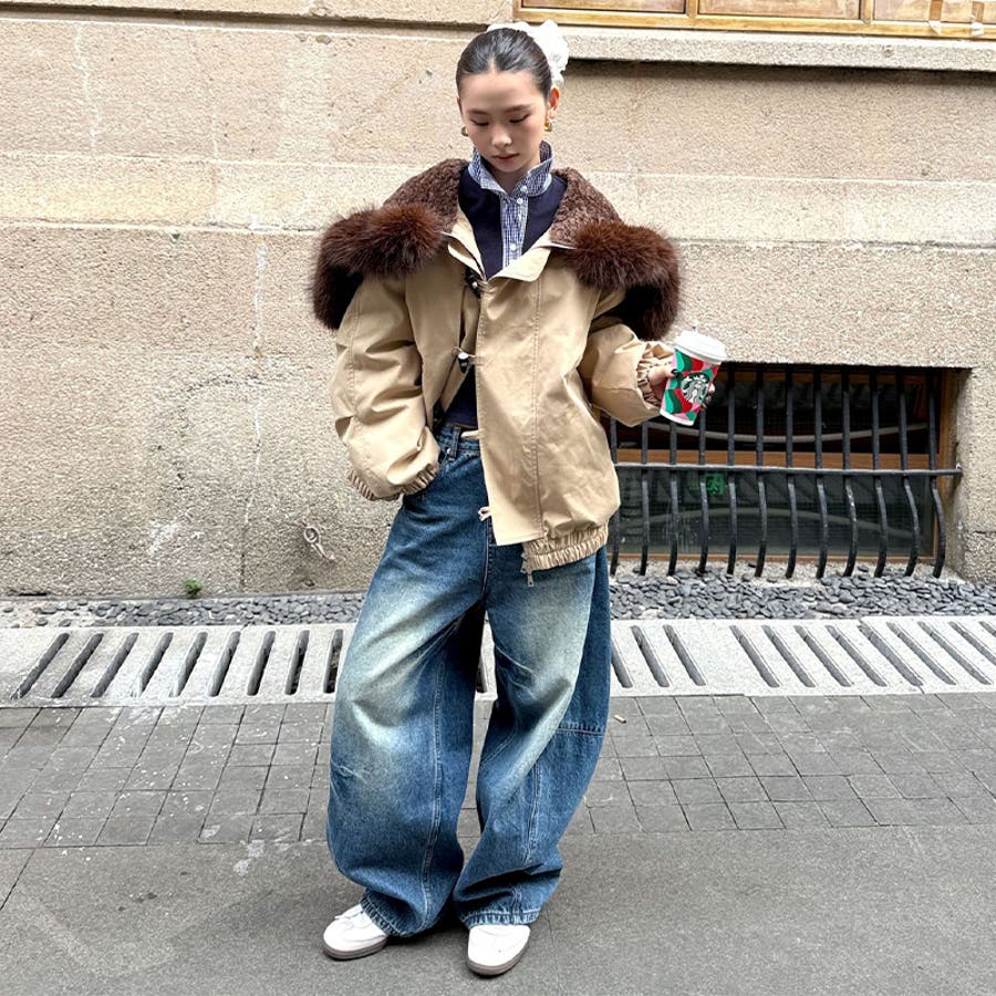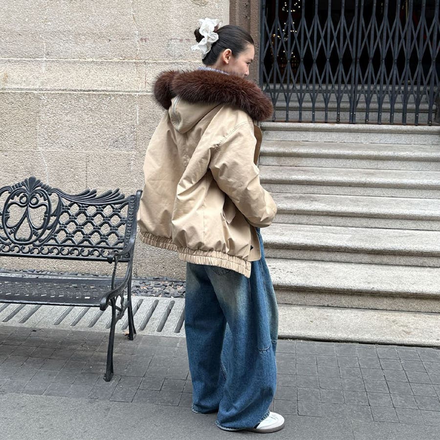ユニセックス☆ストリート系厚手キルティング牛角ボタンファー付きパーカー