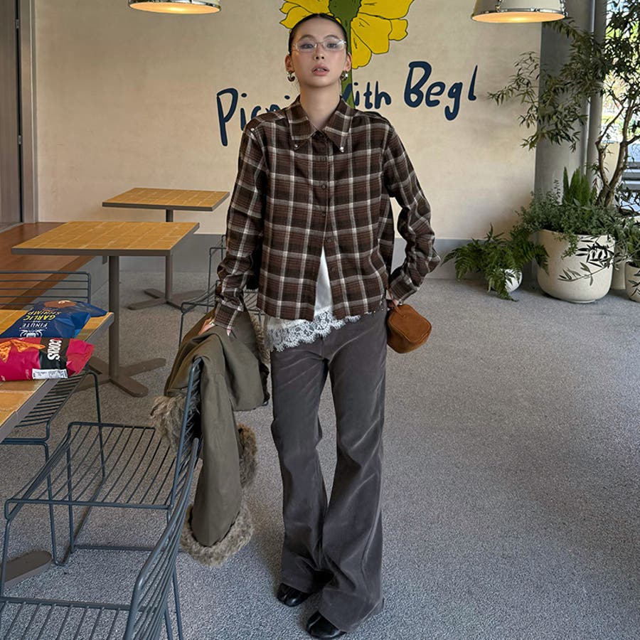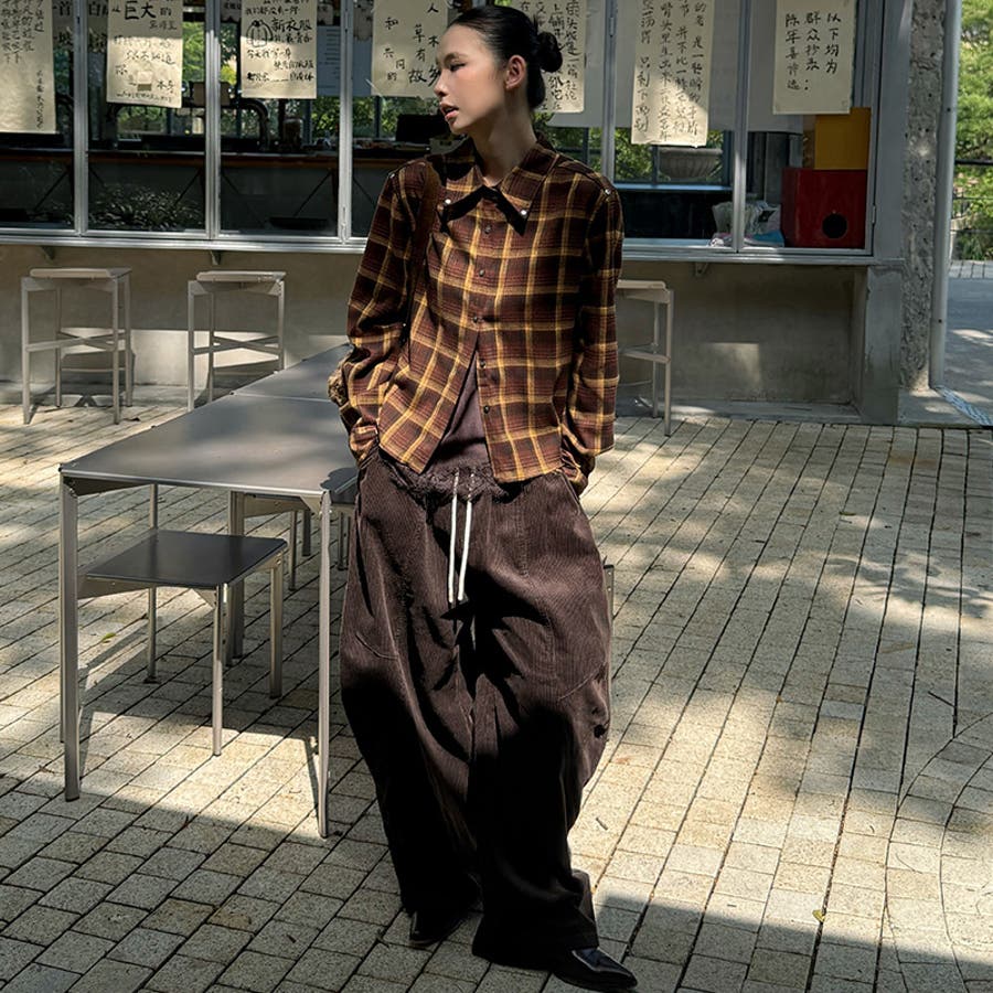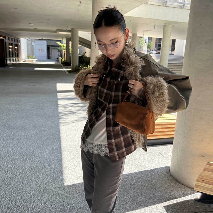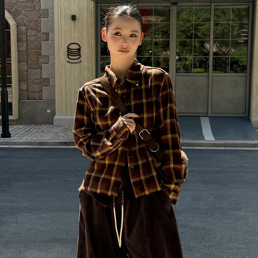 ユニセックス☆ストリート系レトロ配色ブラウン系起毛チェックシャツ