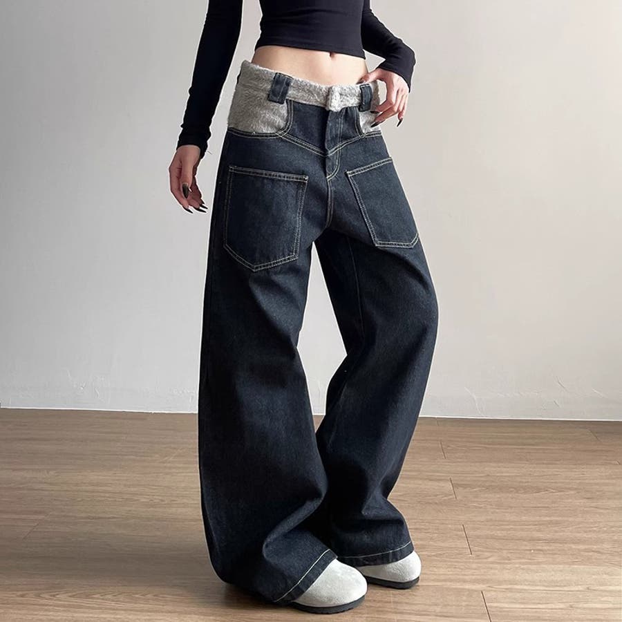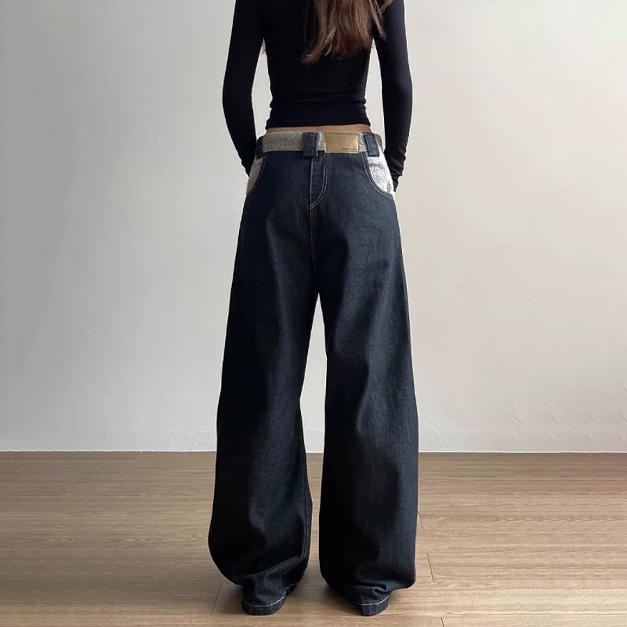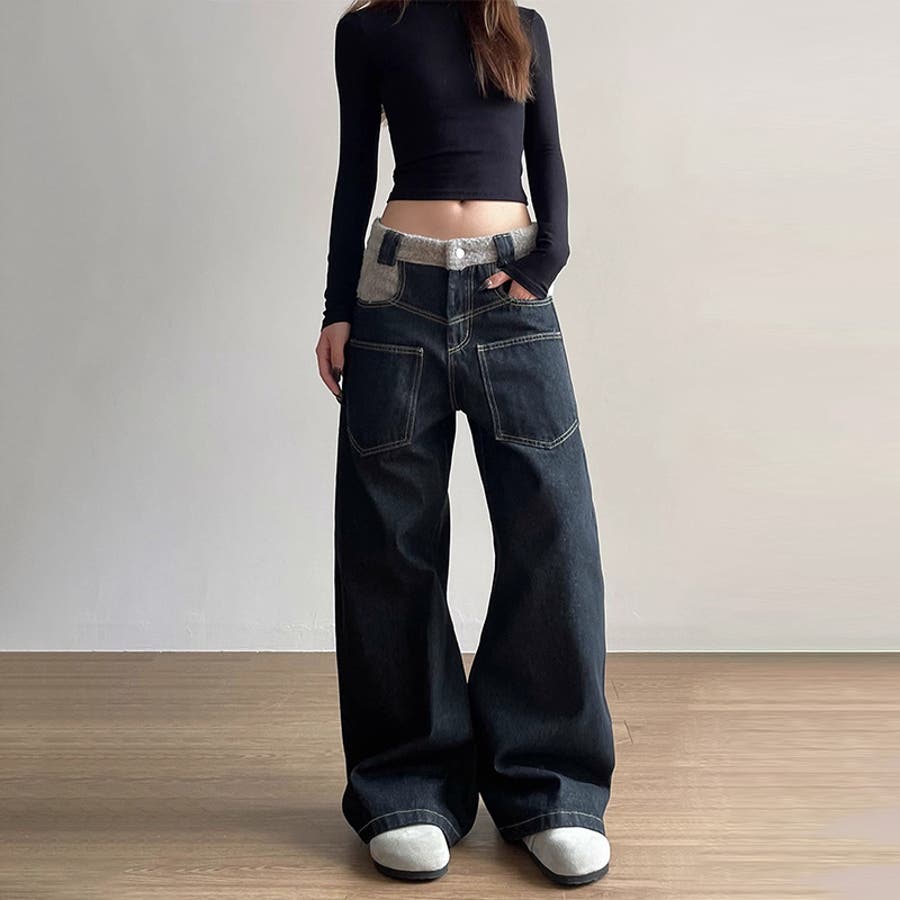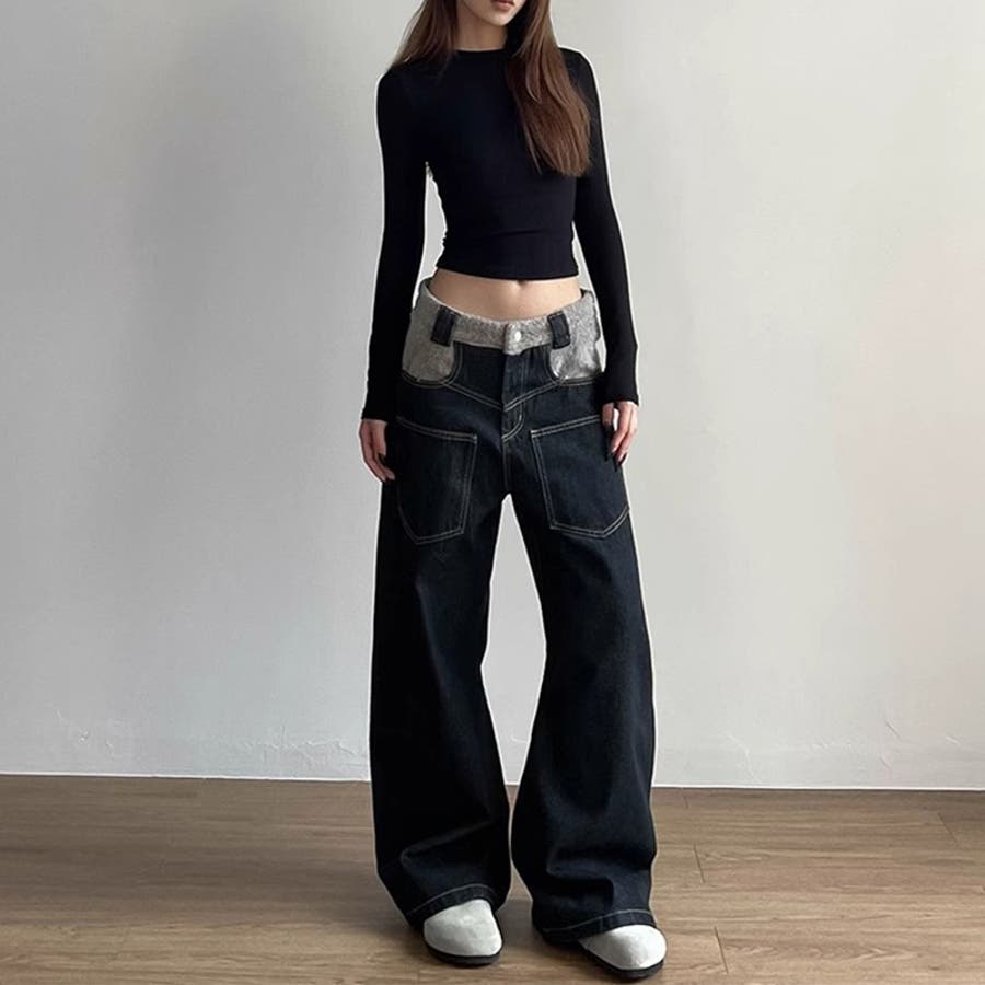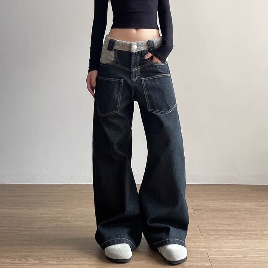 ゆるカワコーデ☆反転着用風パッチワークデニムゆったり弧形セミフレアロングパンツ