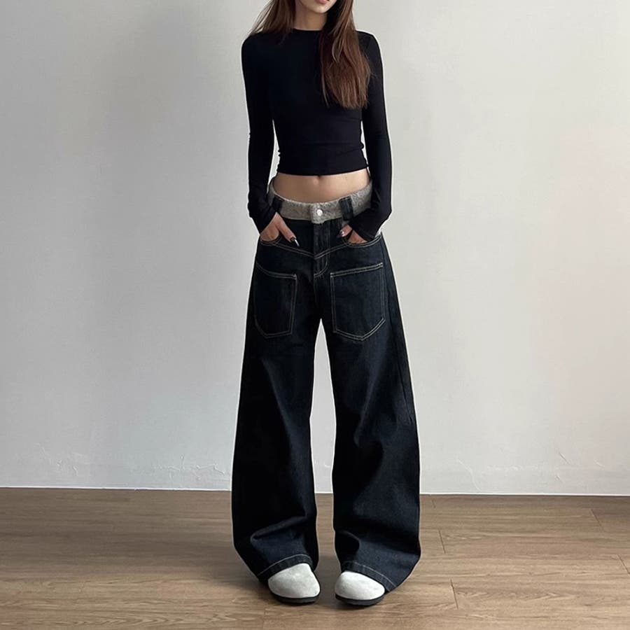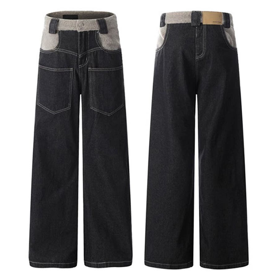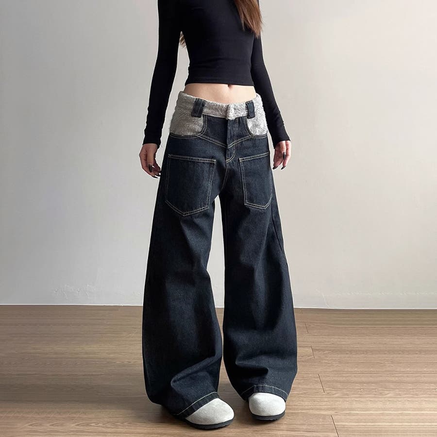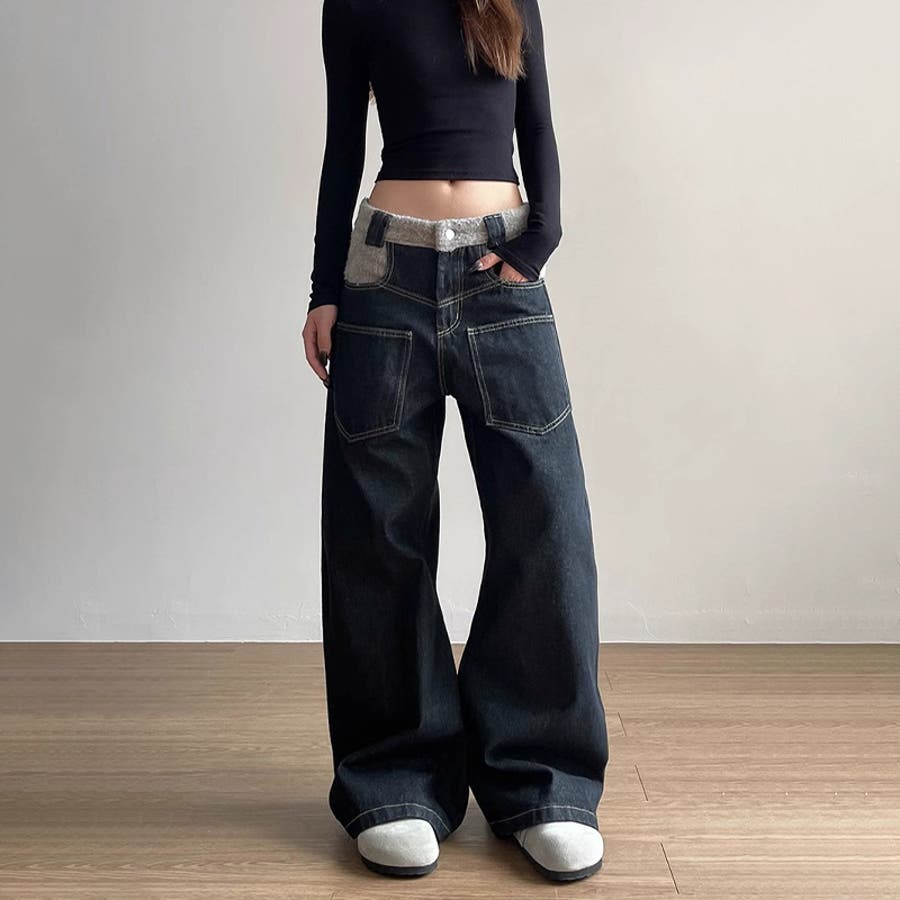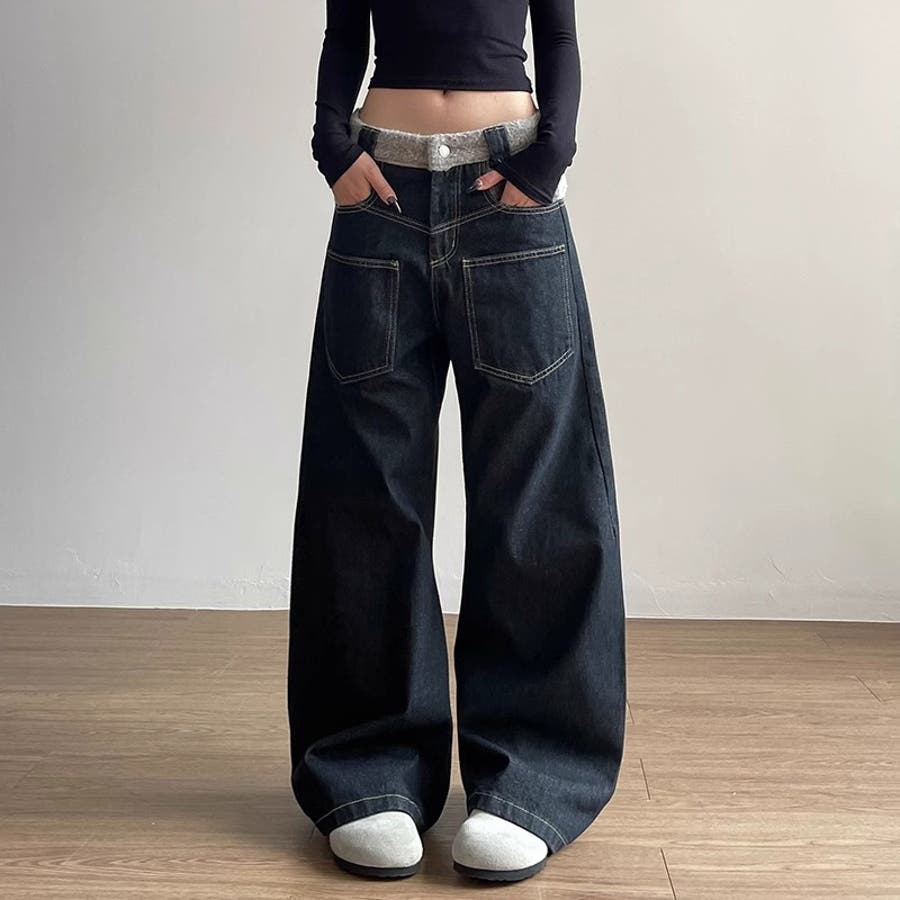 ゆるカワコーデ☆反転着用風パッチワークデニムゆったり弧形セミフレアロングパンツ