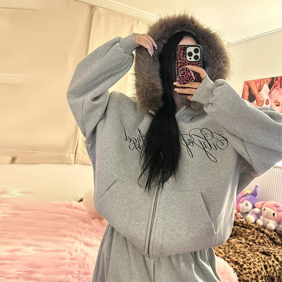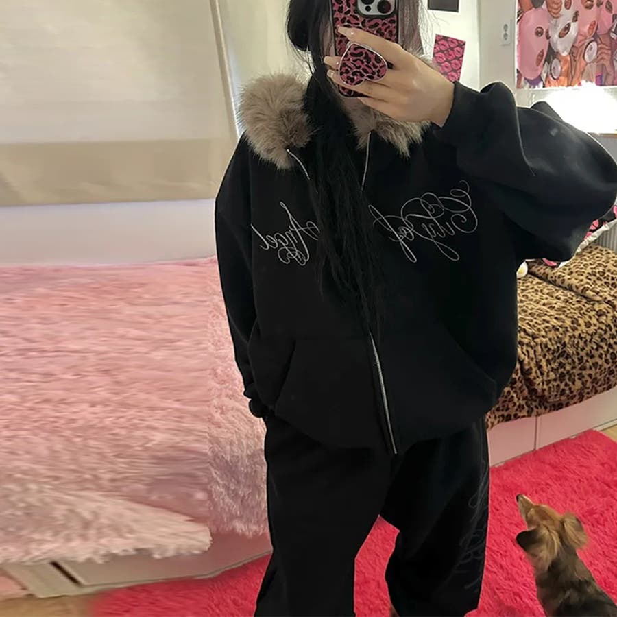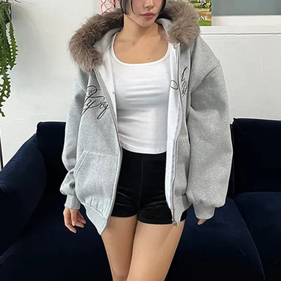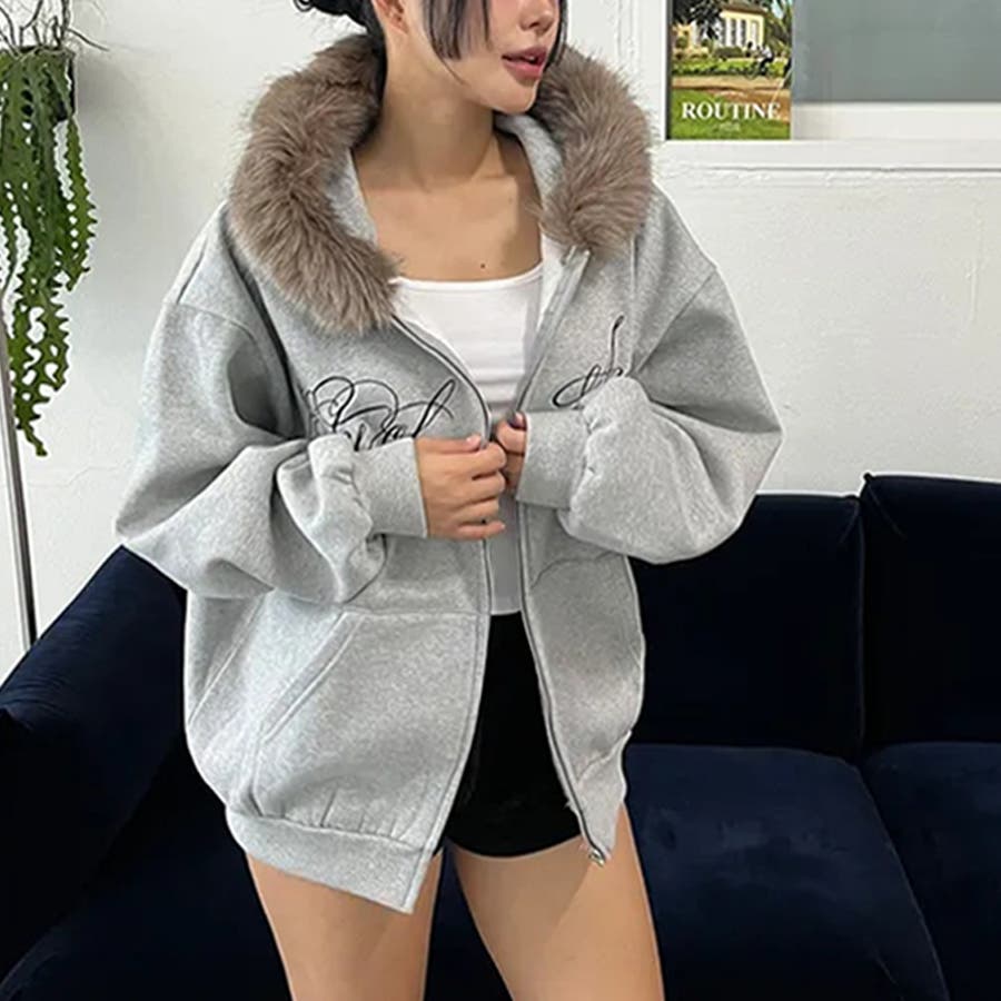甘辛系ガールズ☆保温裏起毛!大きめファー付き英字ジップパーカーアウター