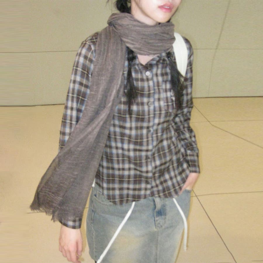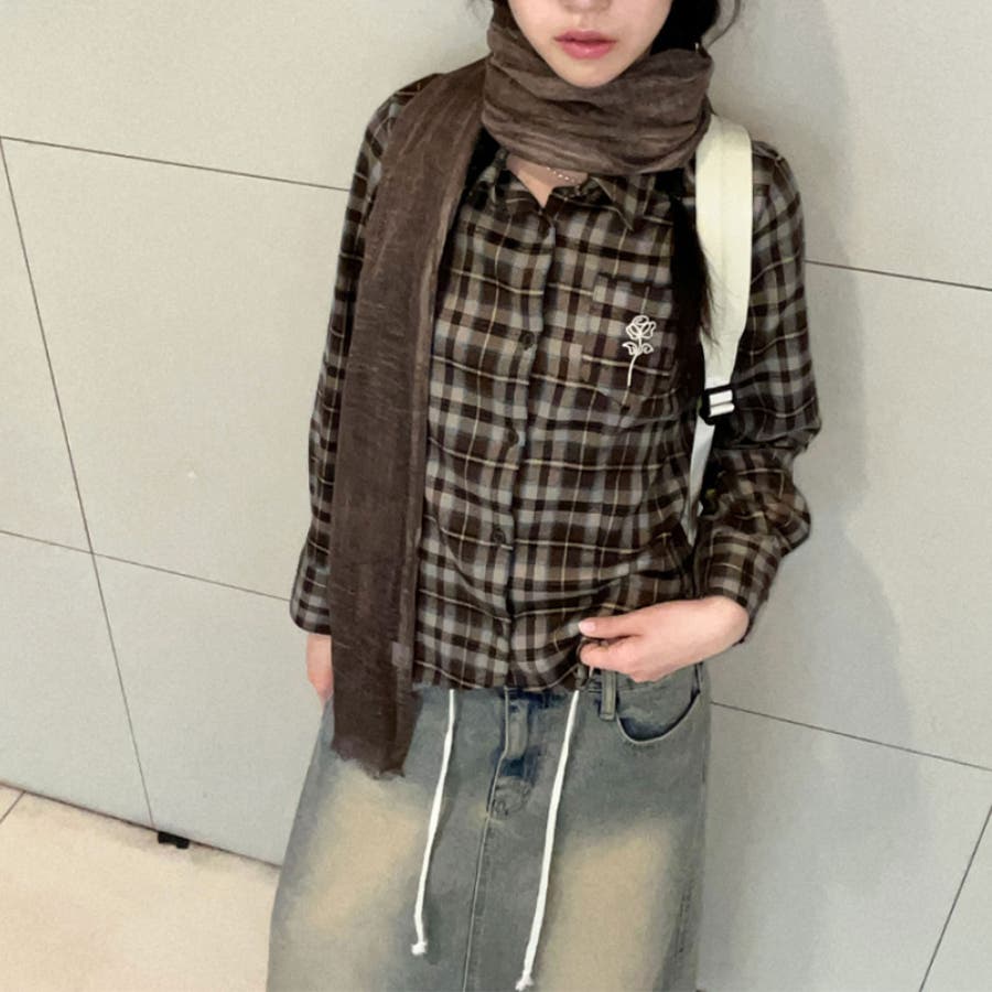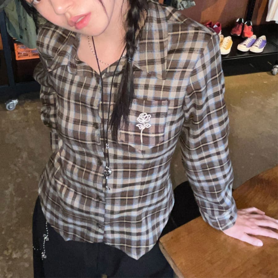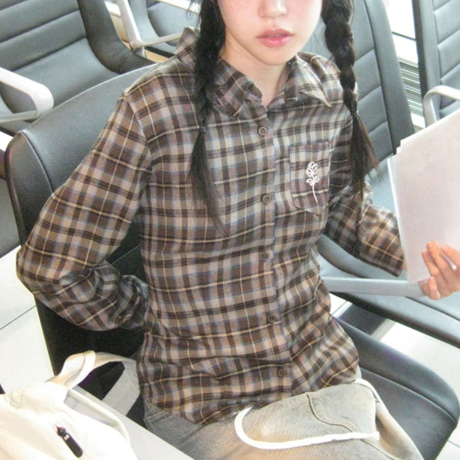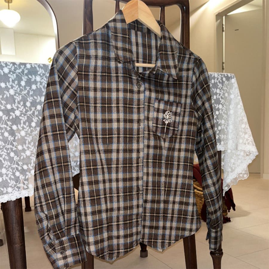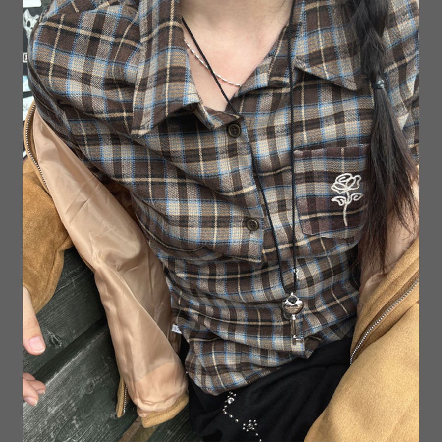甘辛系ガールズ☆起毛チェック刺繍ローズタイトシャツ長袖