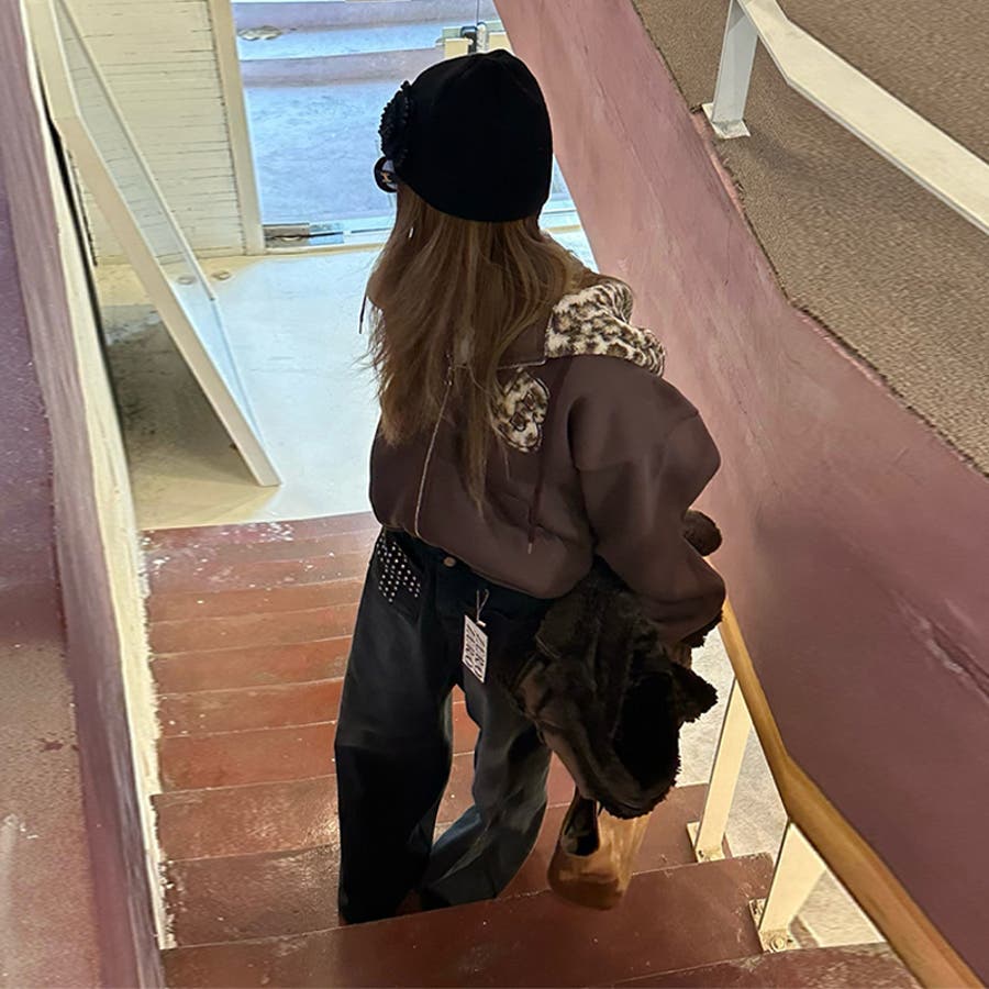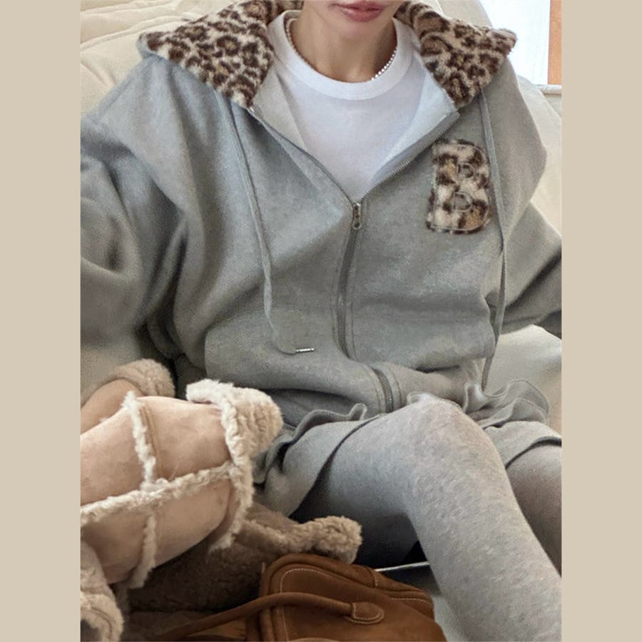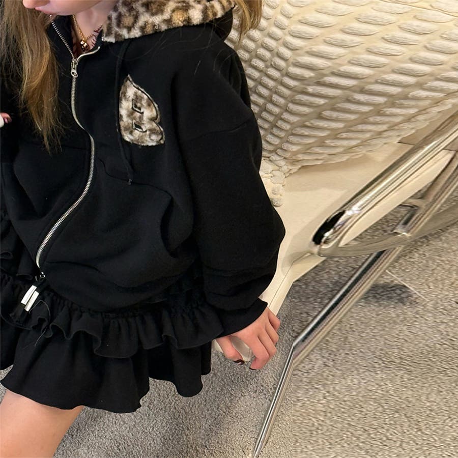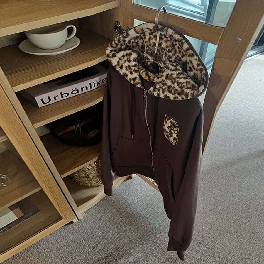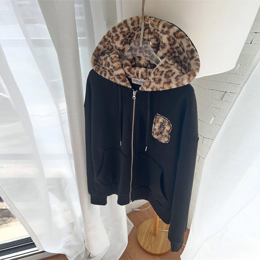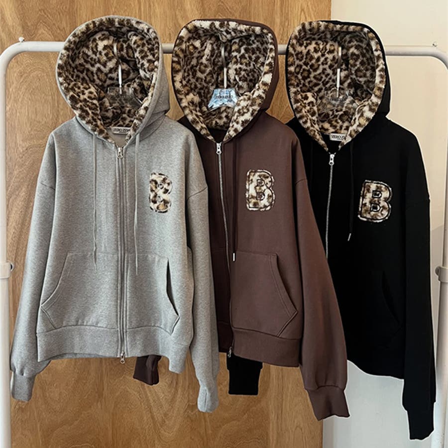 甘辛系ガールズ☆裏起毛厚手レオパード配色ワッペン英字パーカーアウター