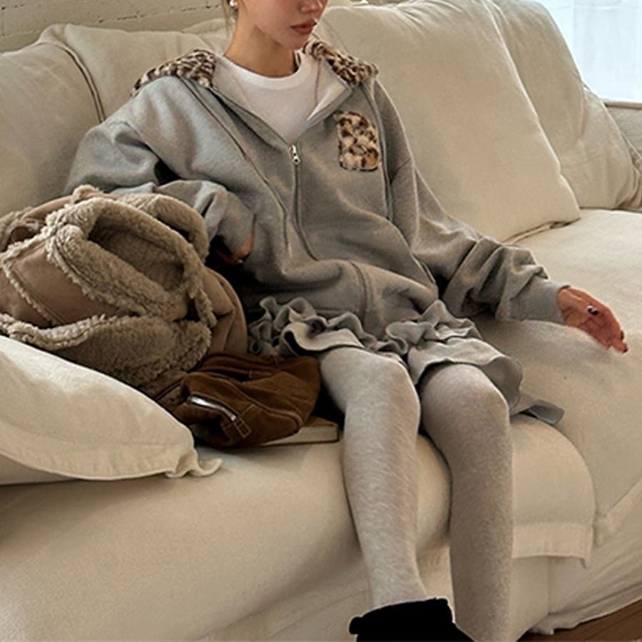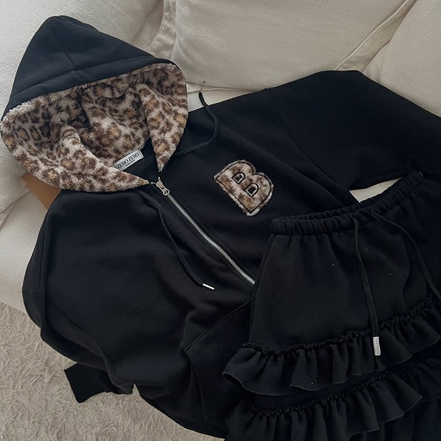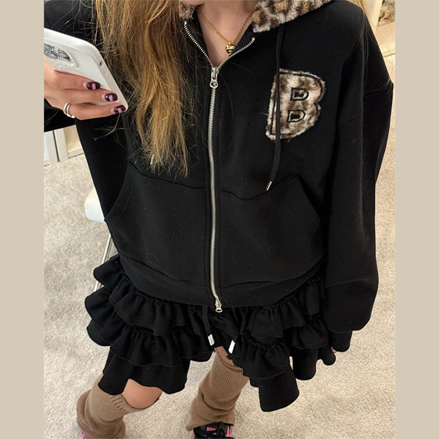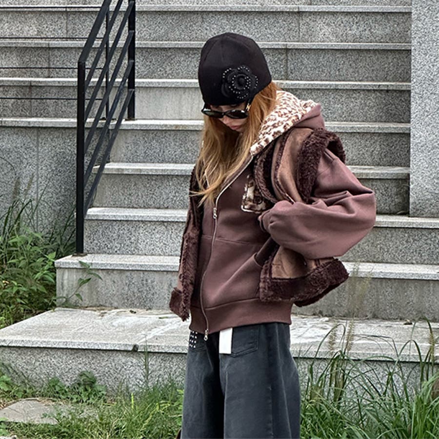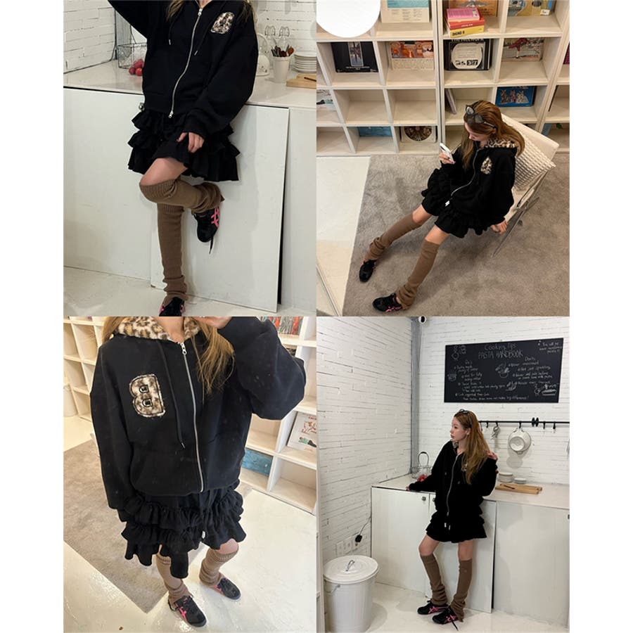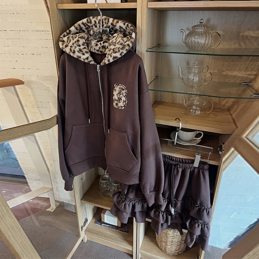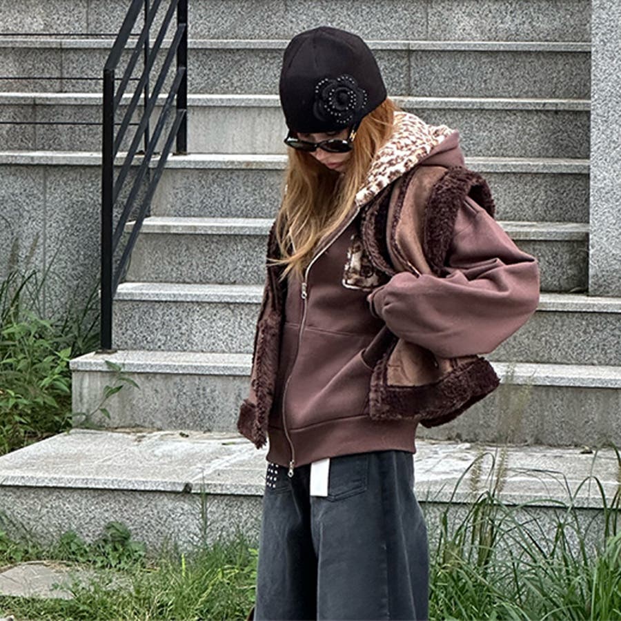甘辛系ガールズ☆裏起毛厚手レオパード配色ワッペン英字パーカーアウター