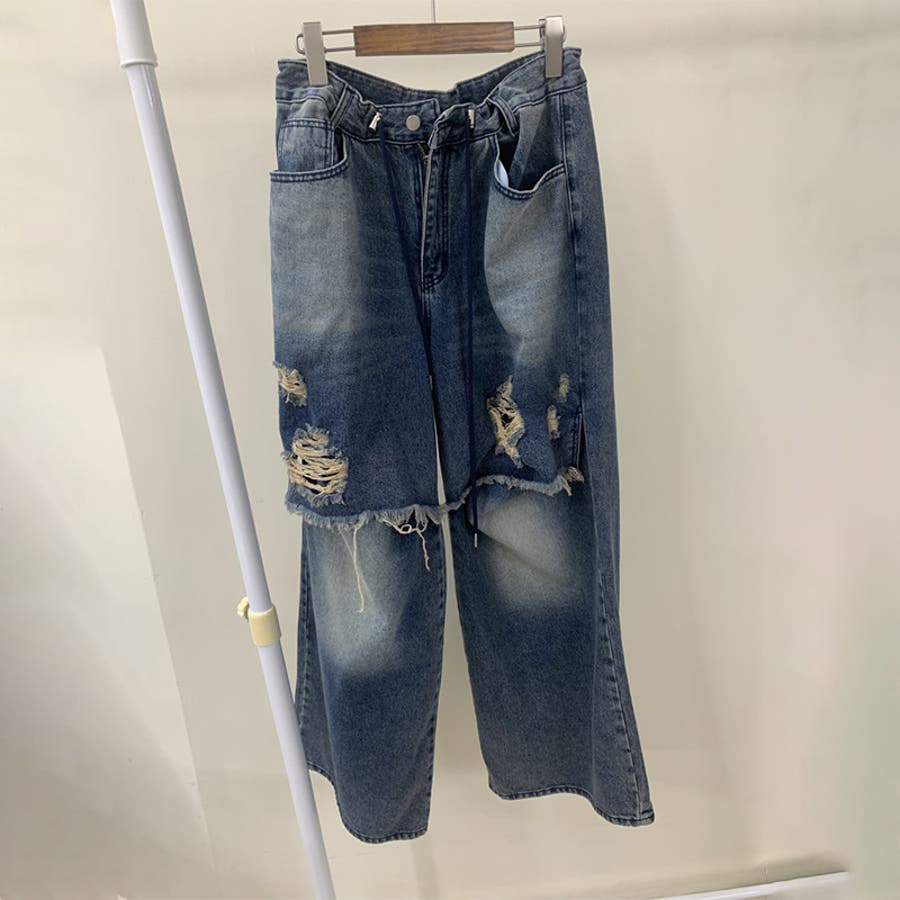 ユニセックス☆ダメージ加工フェイクレイヤード二重とろみワイドデニムパンツ