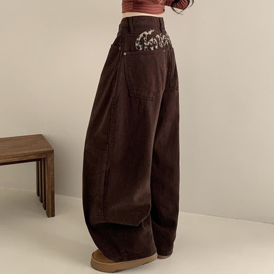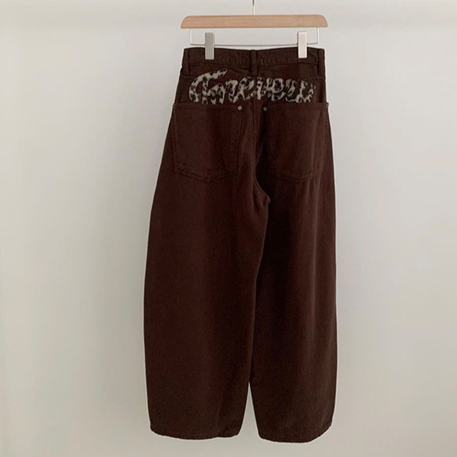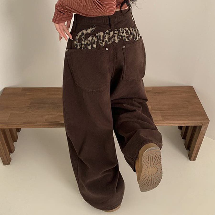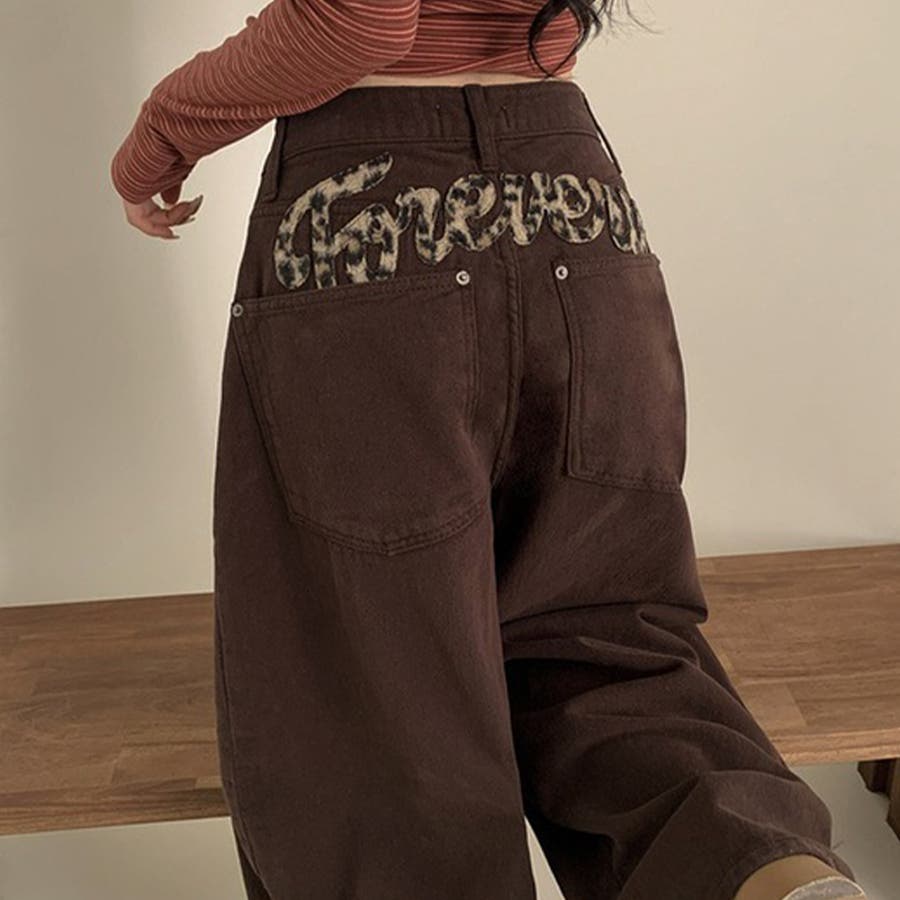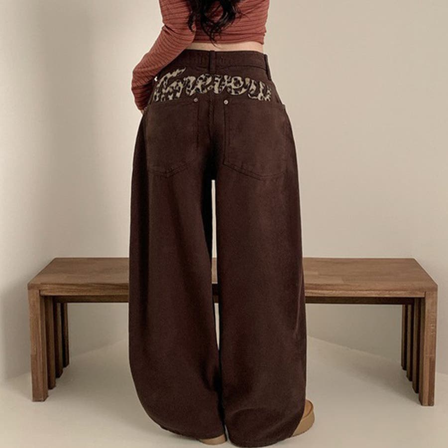 甘辛系ガールズ レトロウォッシュレオパード×文字ワッペンワイドストレートデニムパ…