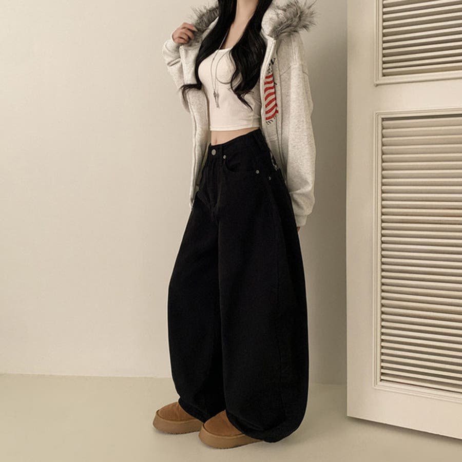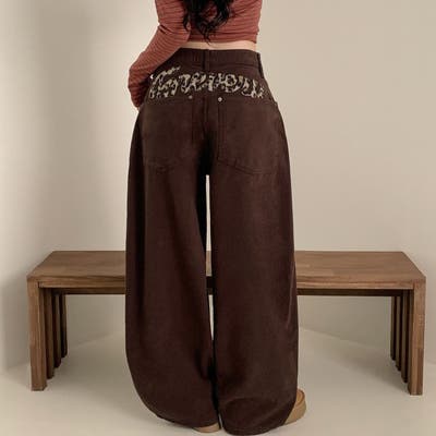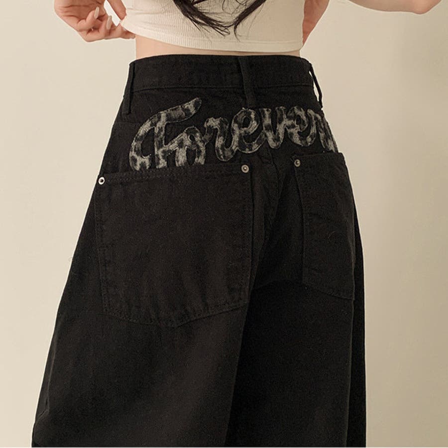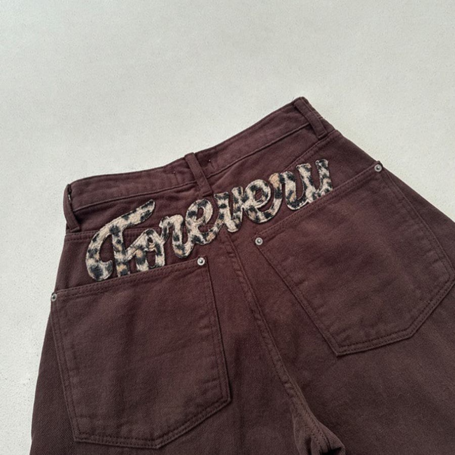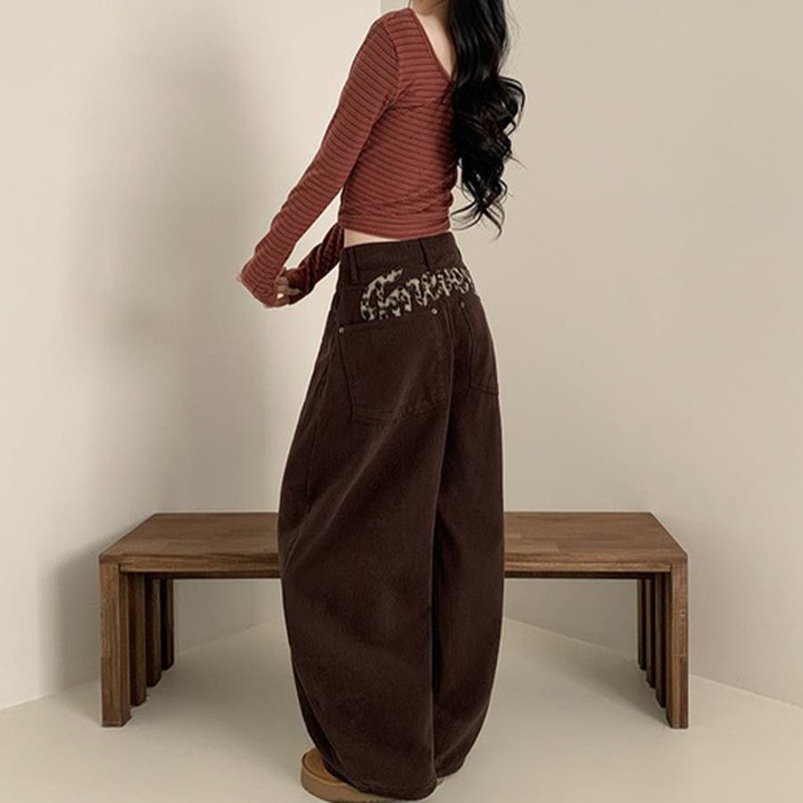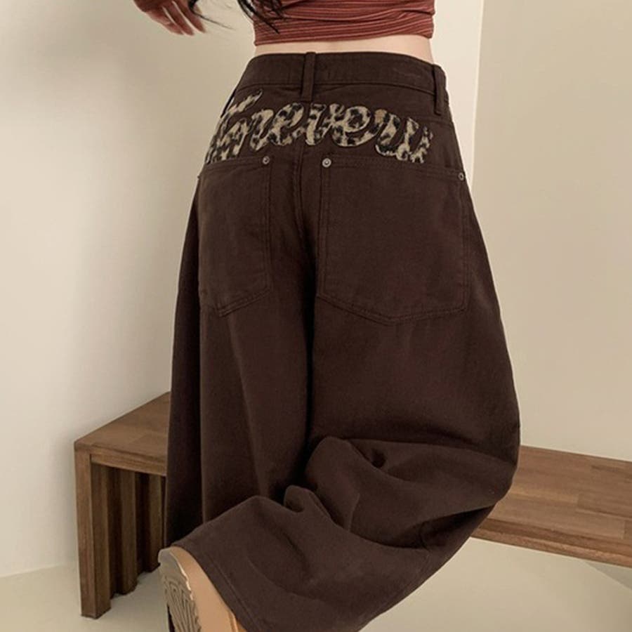 甘辛系ガールズ レトロウォッシュレオパード×文字ワッペンワイドストレートデニムパ…