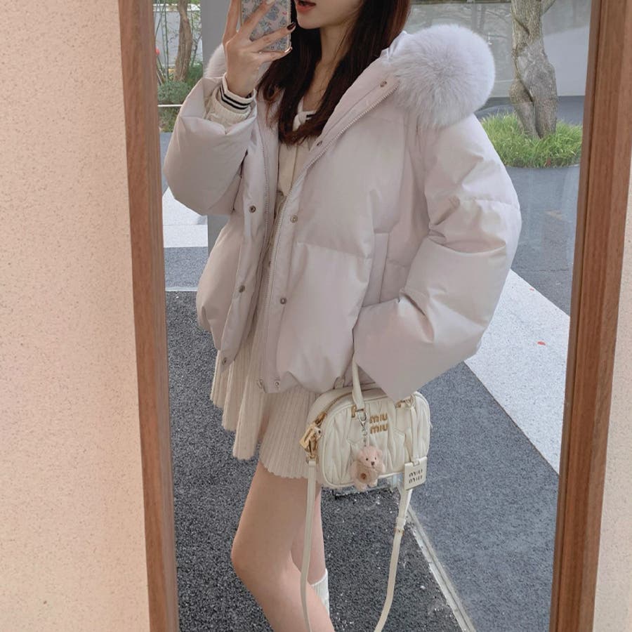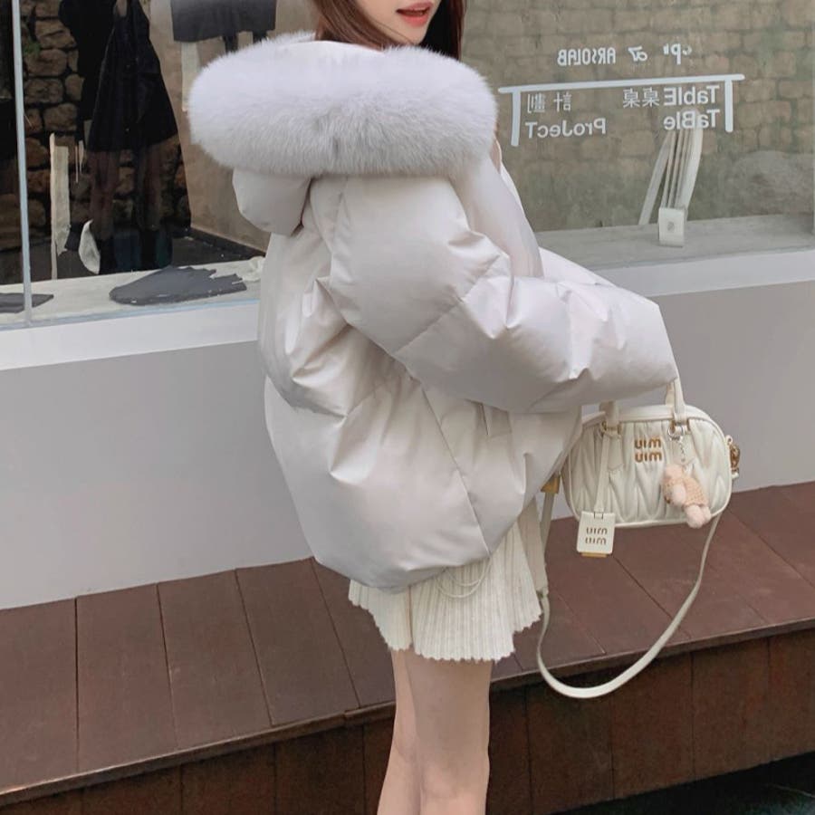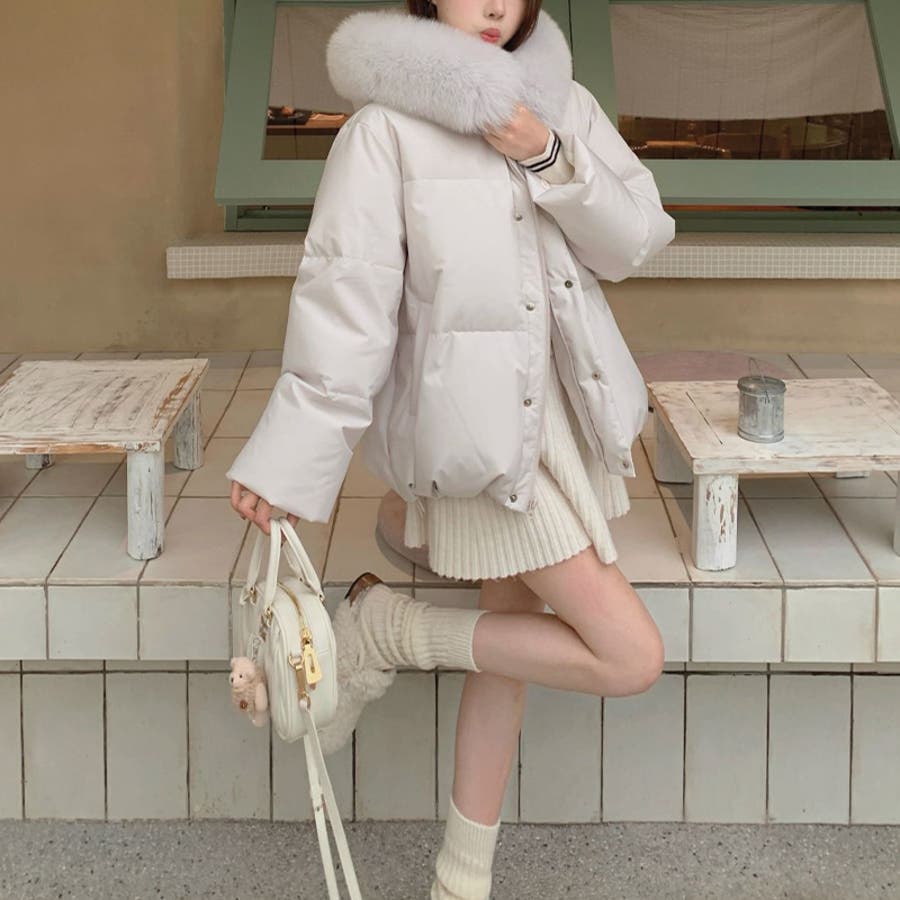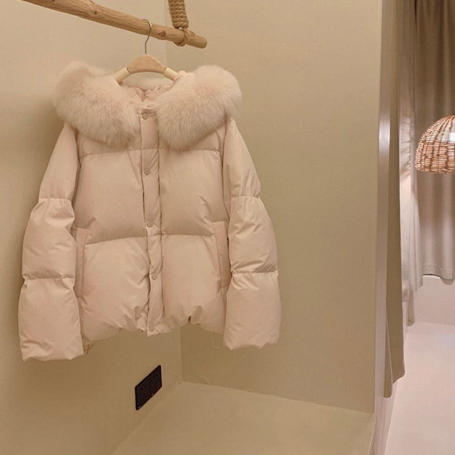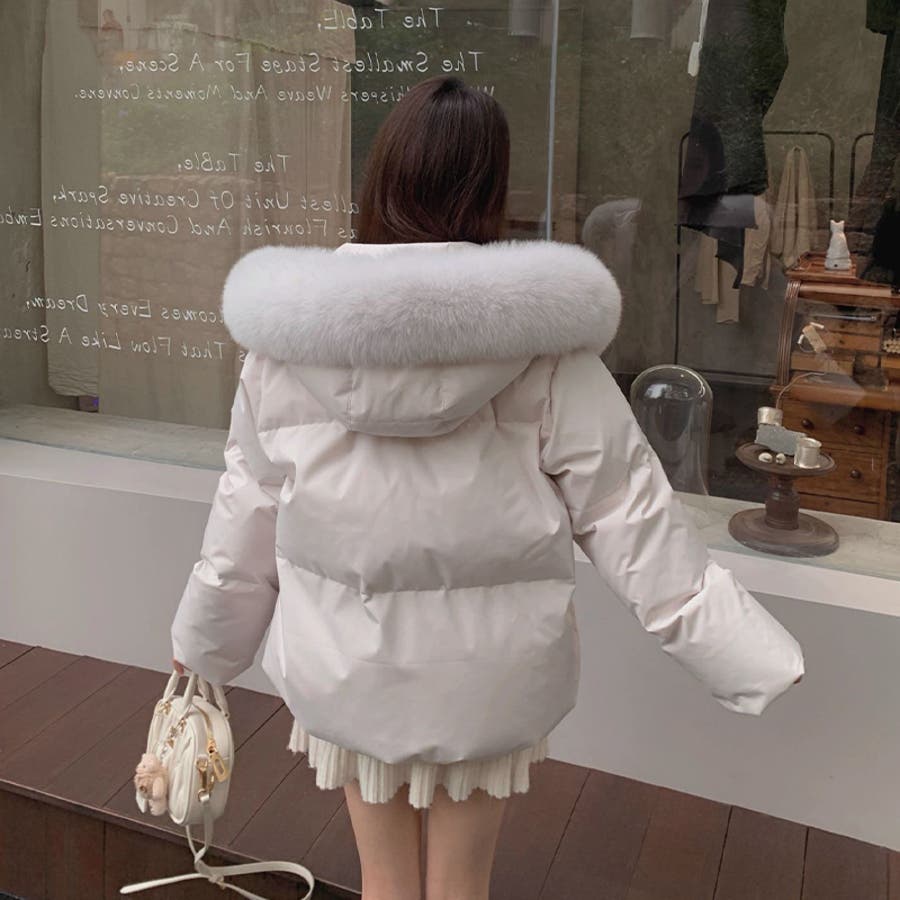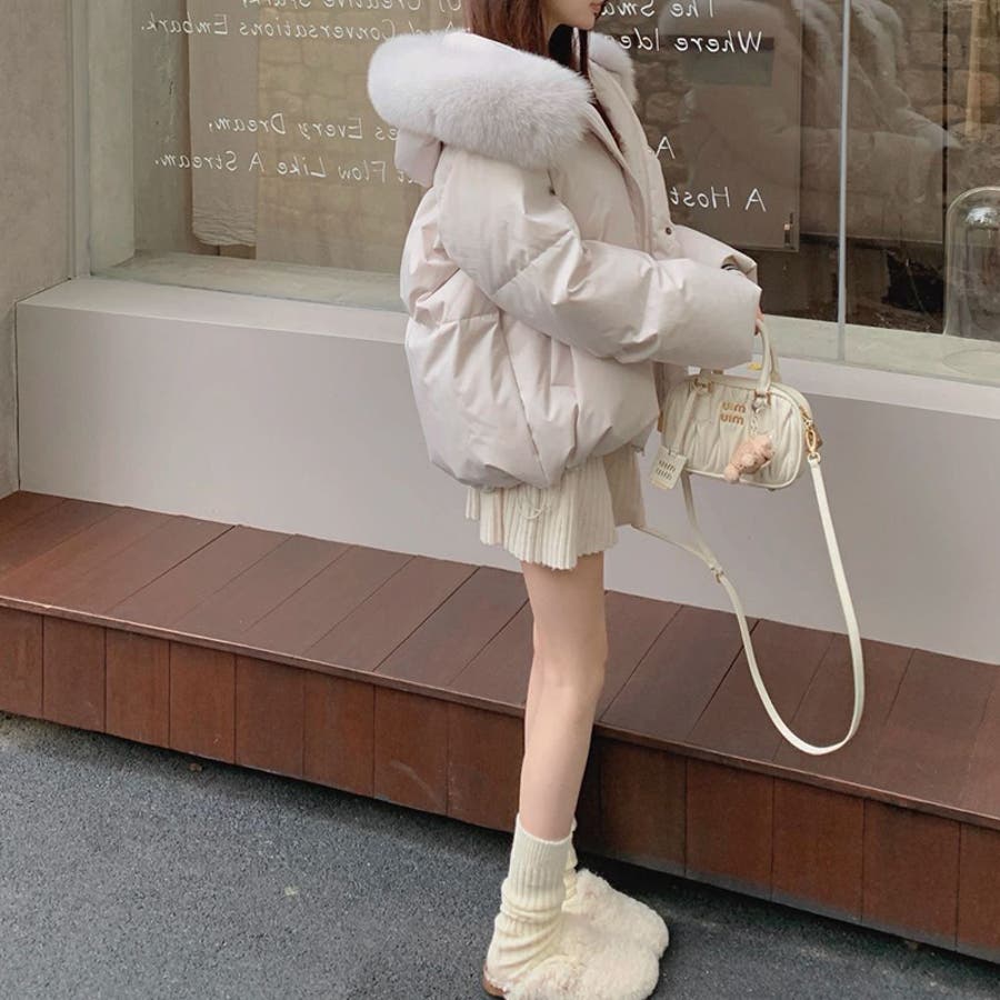 ゆるカワコーデ☆フォックス風ビッグファーフード付き ショート丈ダウンジャケット