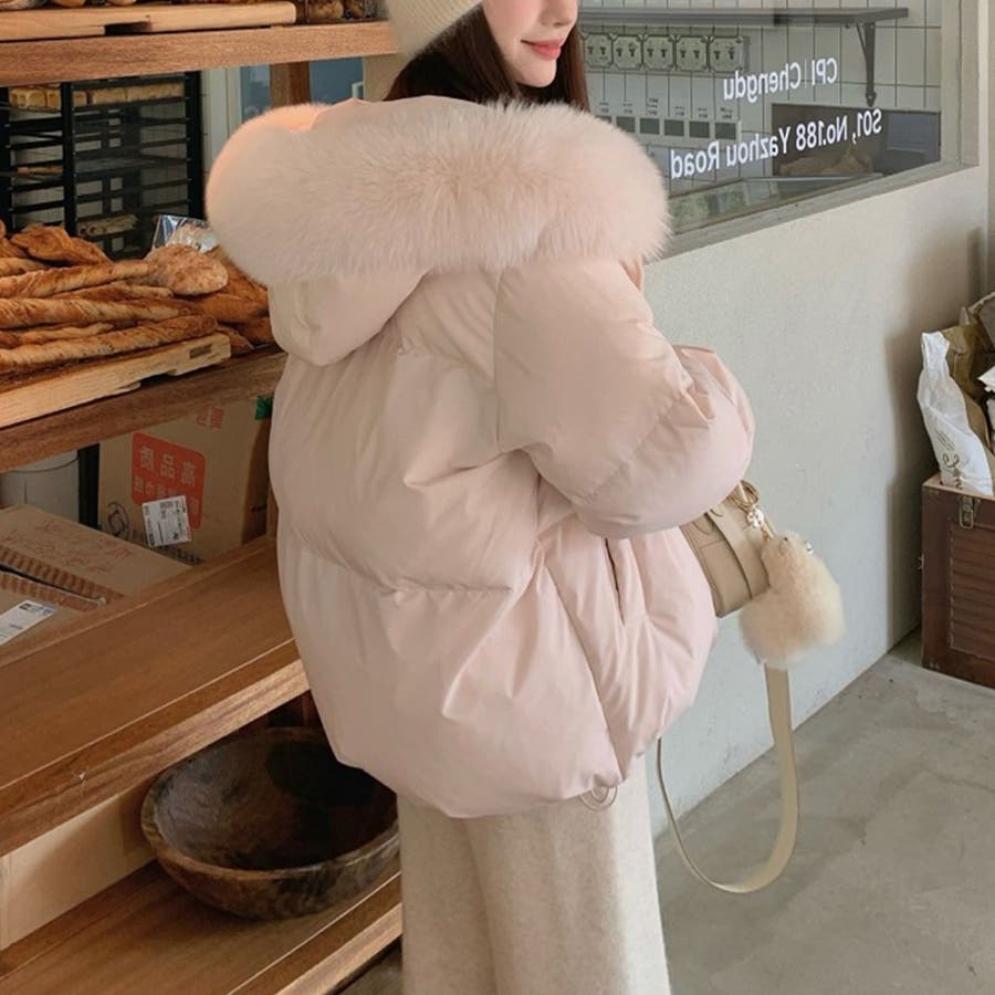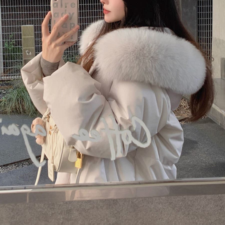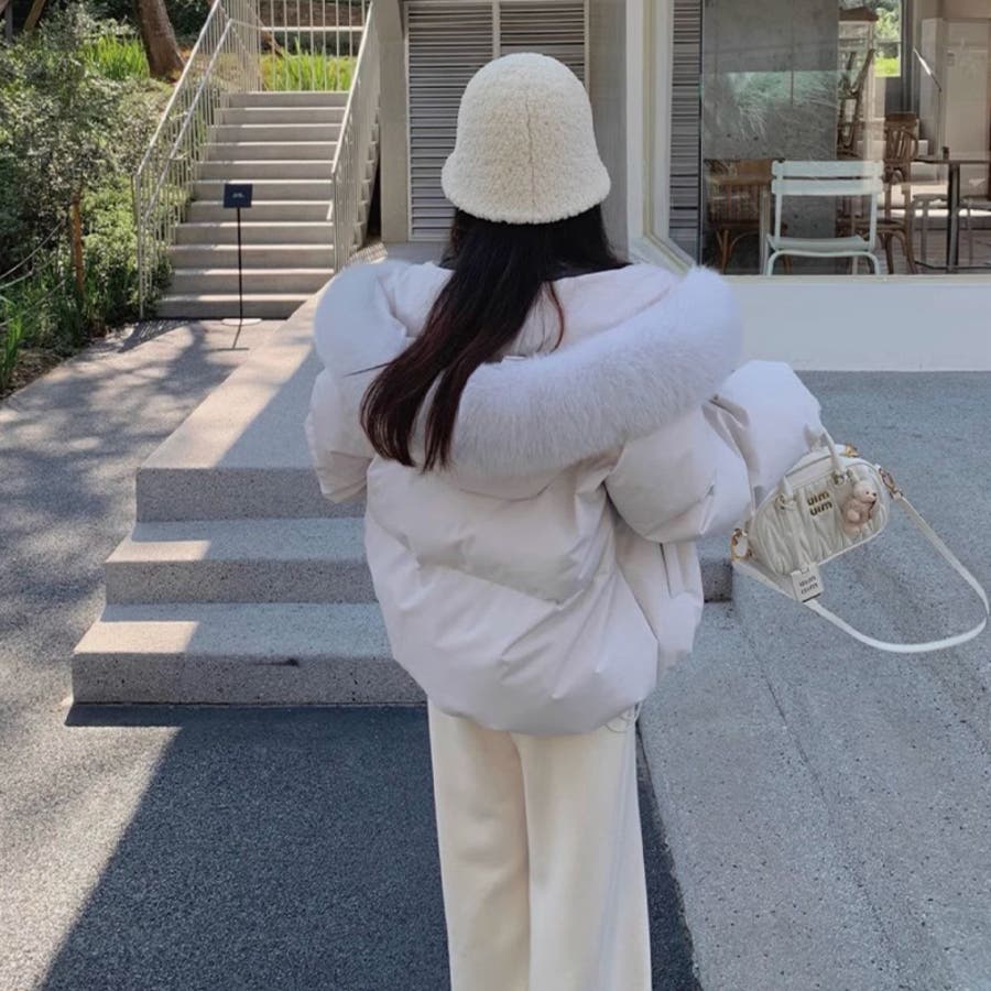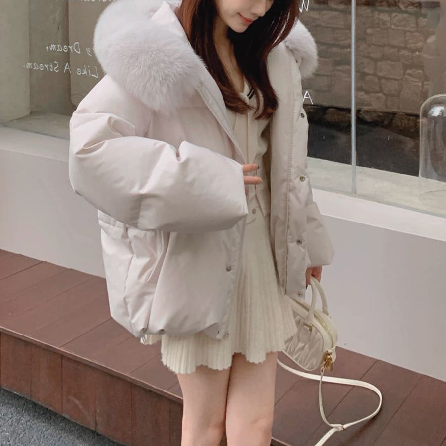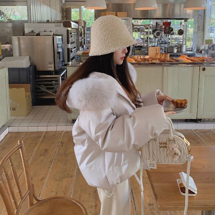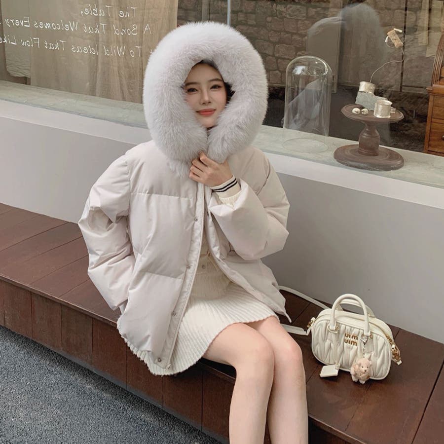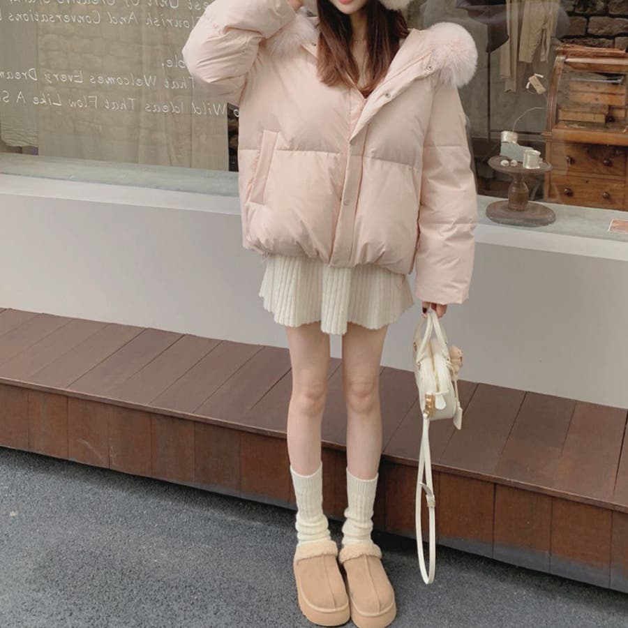 ゆるカワコーデ☆フォックス風ビッグファーフード付き ショート丈ダウンジャケット