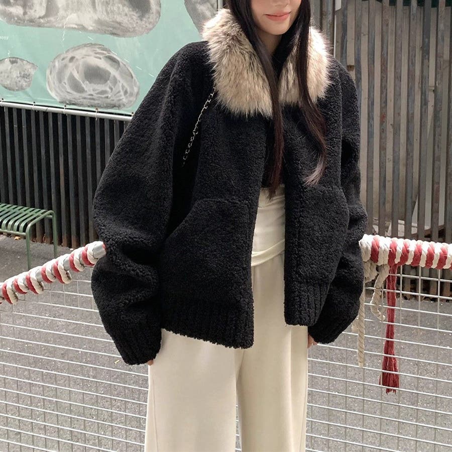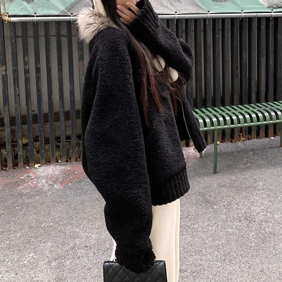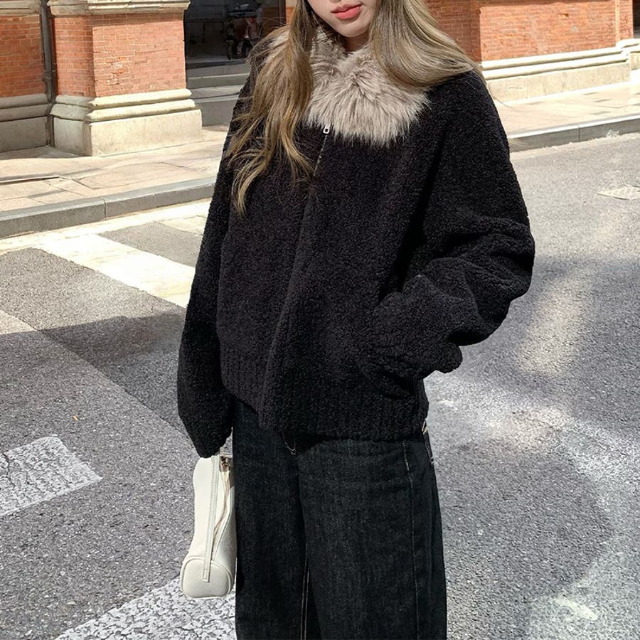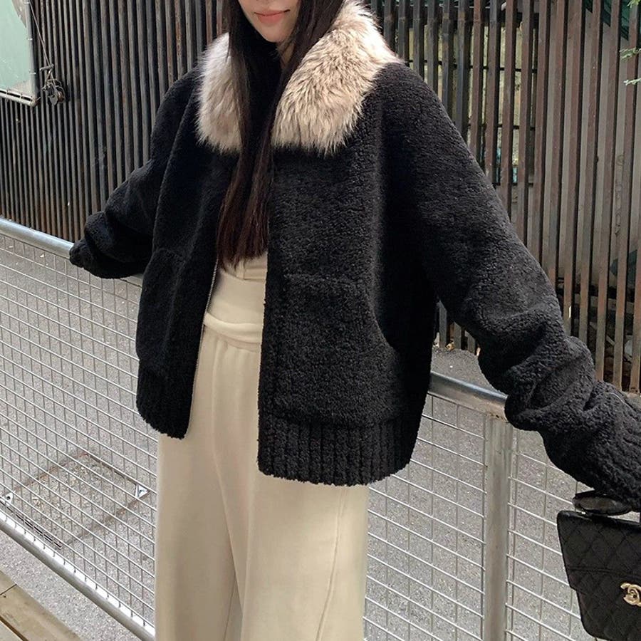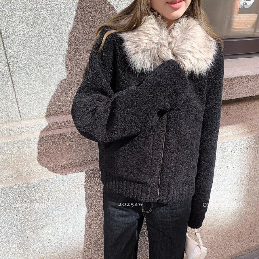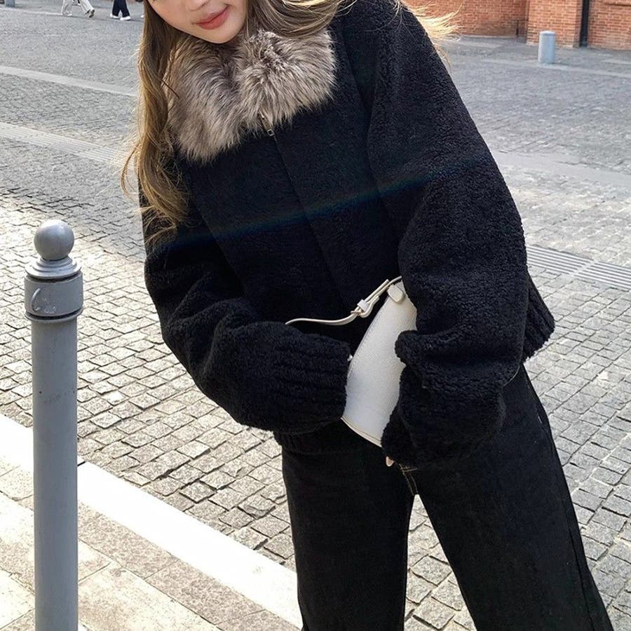 大人っぽく洗練された☆ファー付き 小粒ボア ムートン風コート