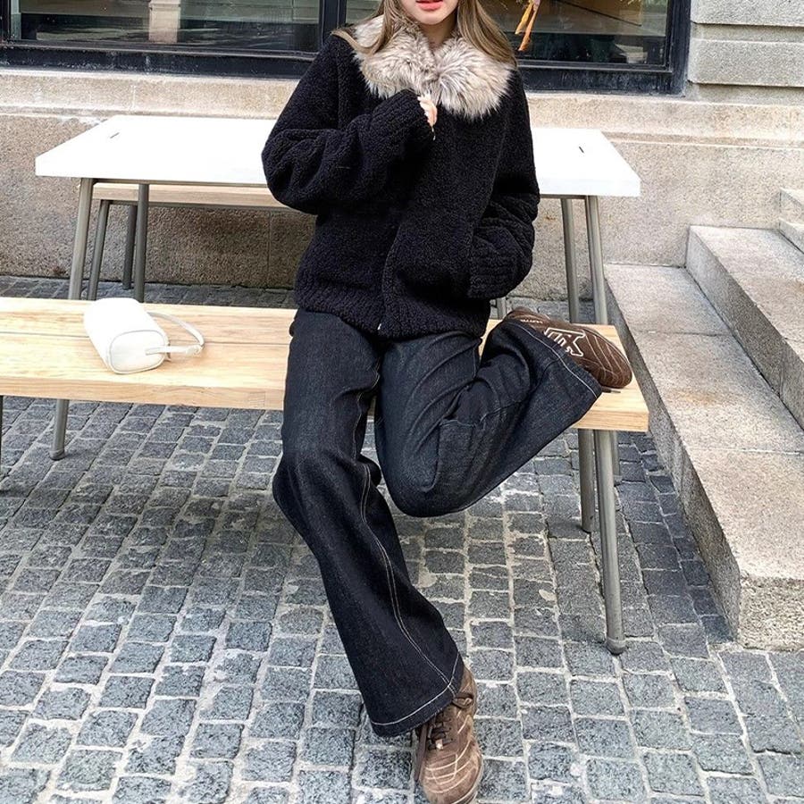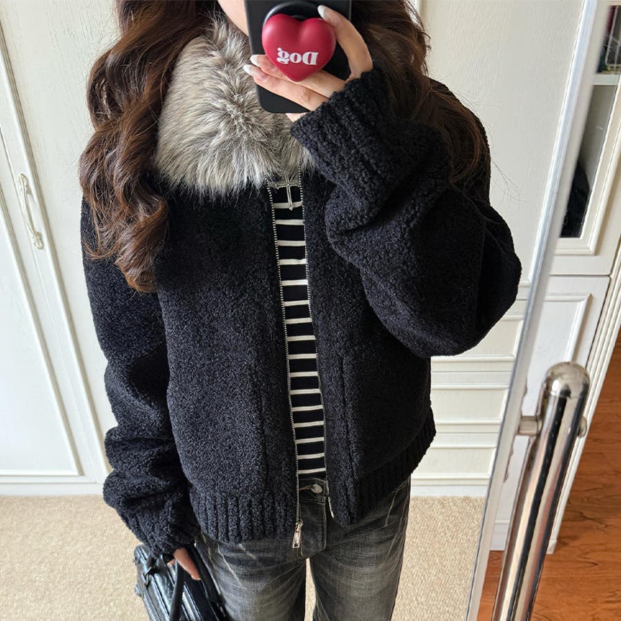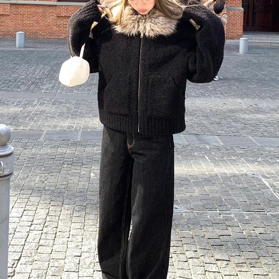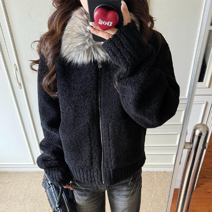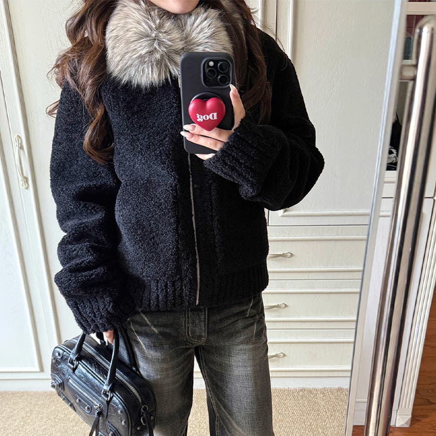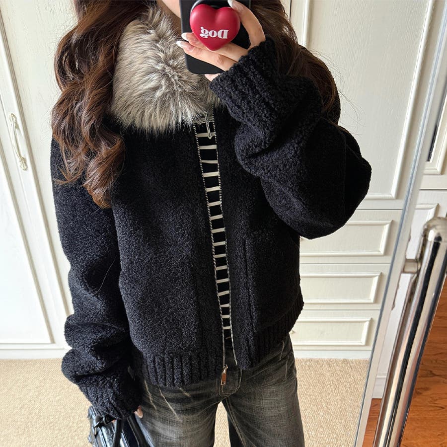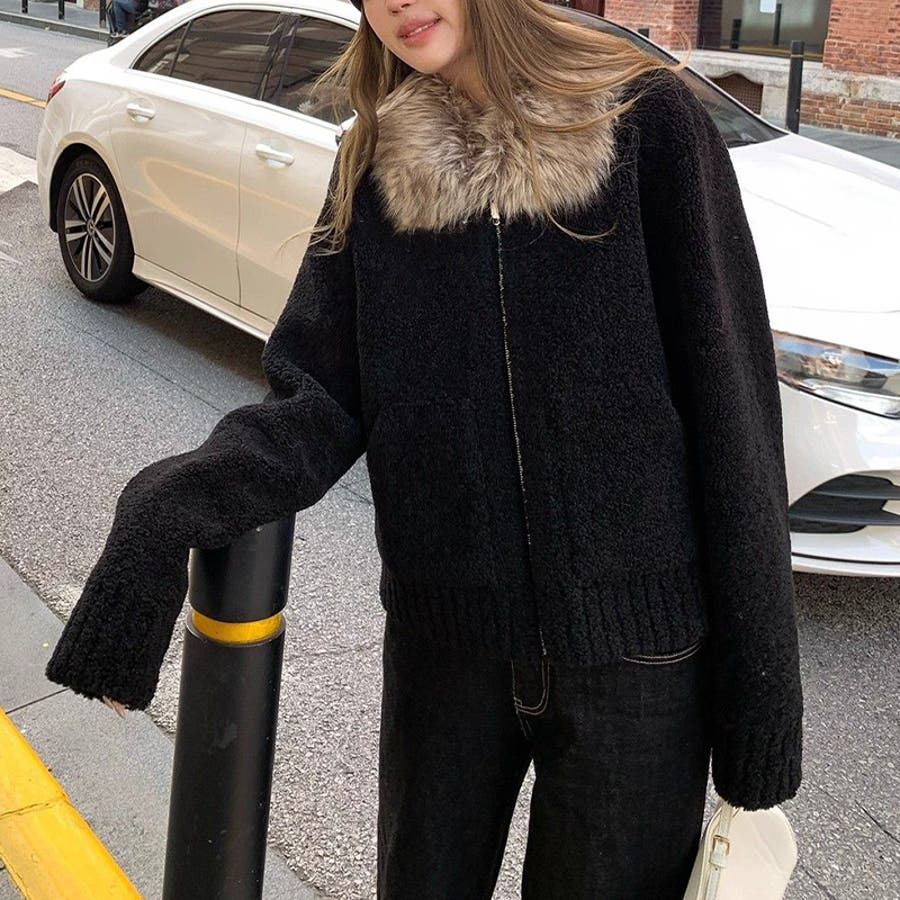 大人っぽく洗練された☆ファー付き 小粒ボア ムートン風コート
