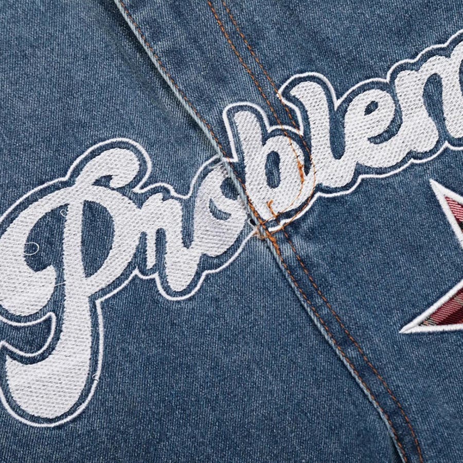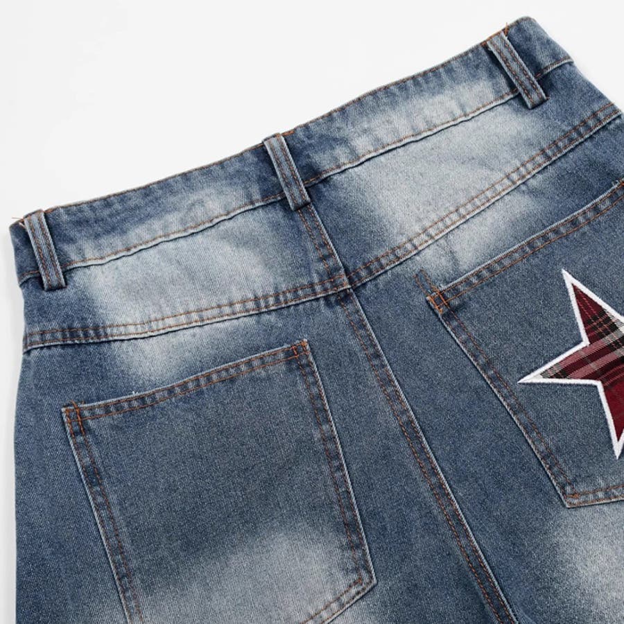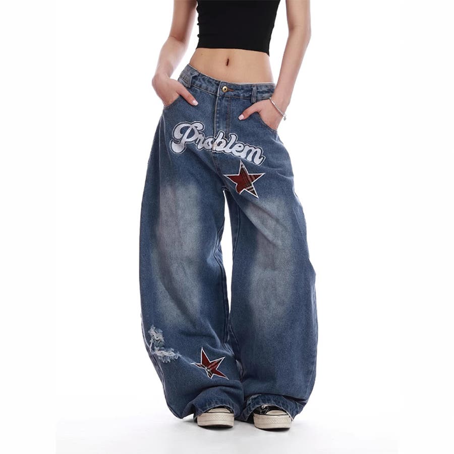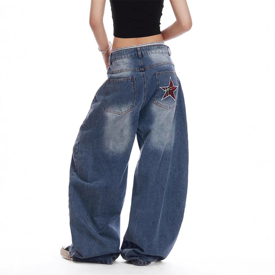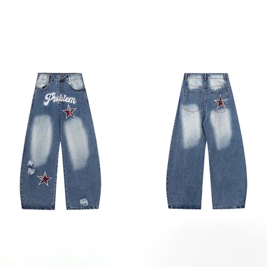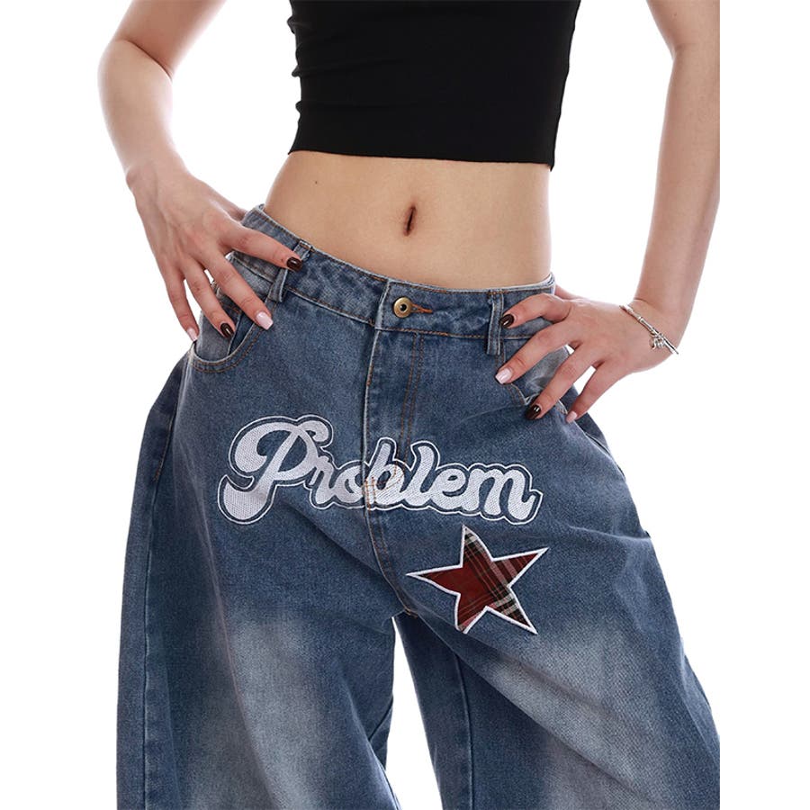 ユニセックス☆レトロ 高感度ストリート 星刺繍 デニムパンツカーブシルエット