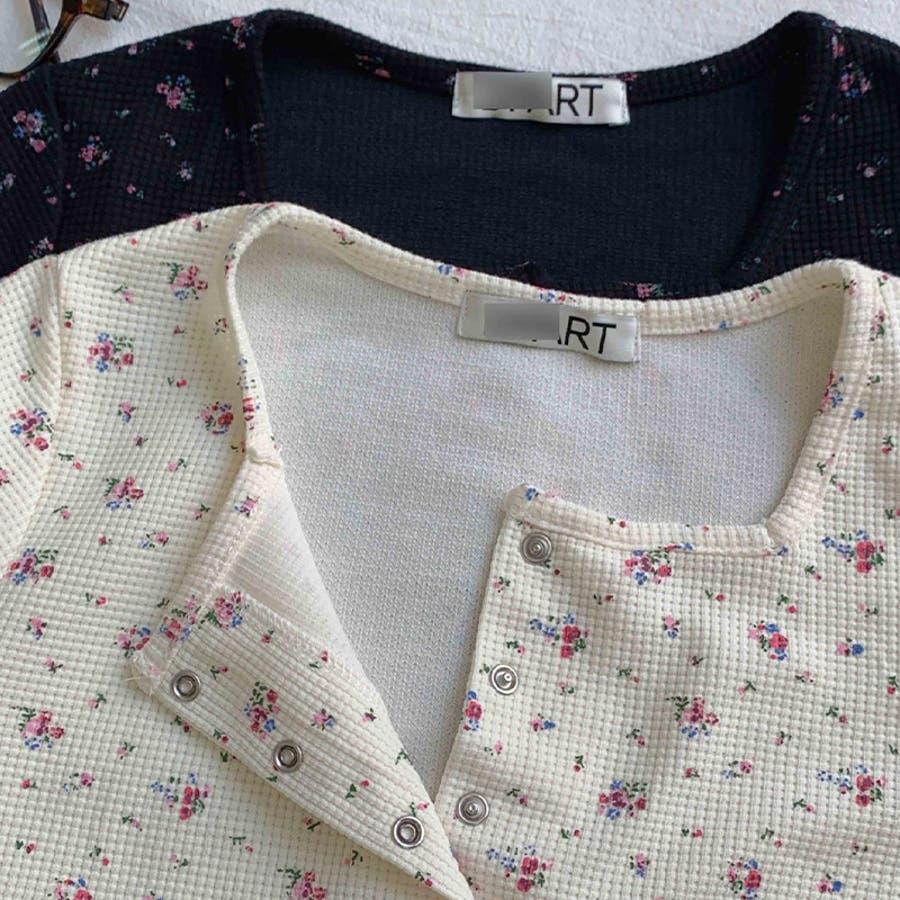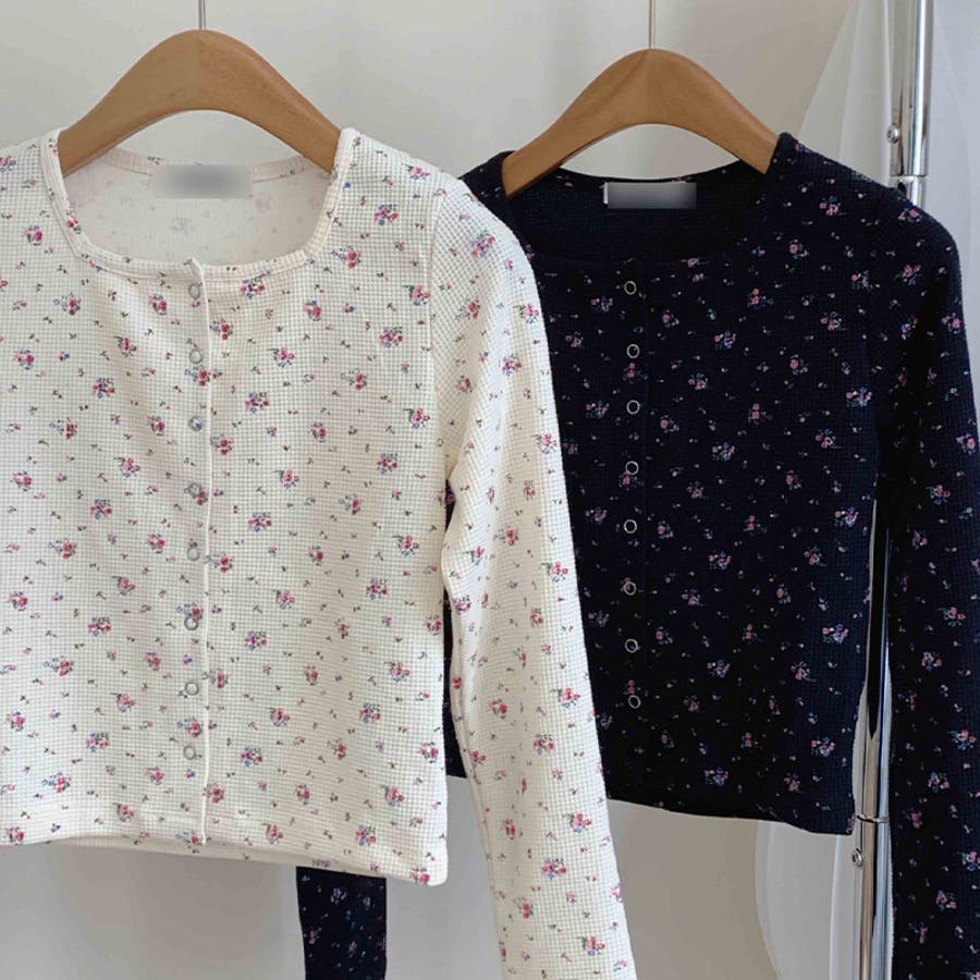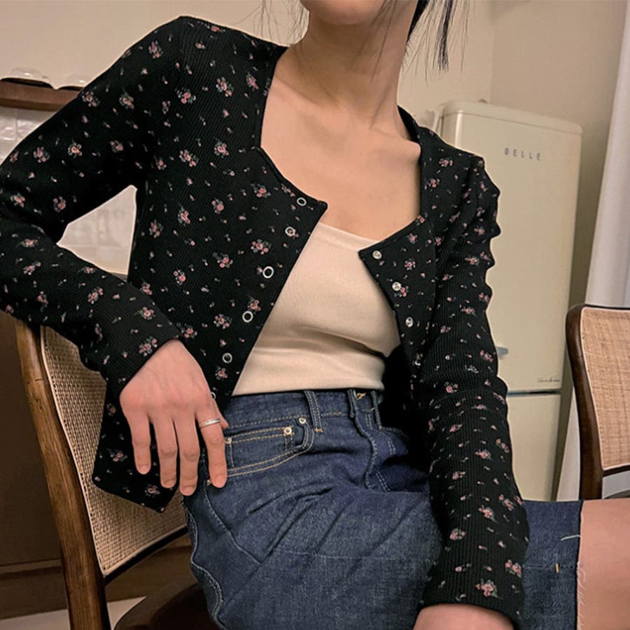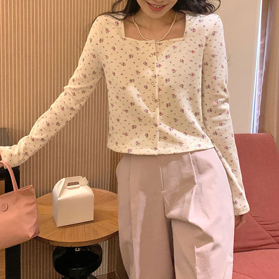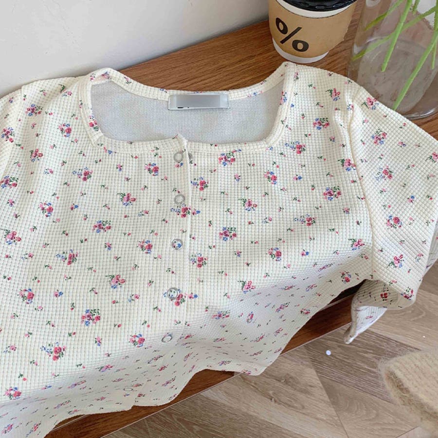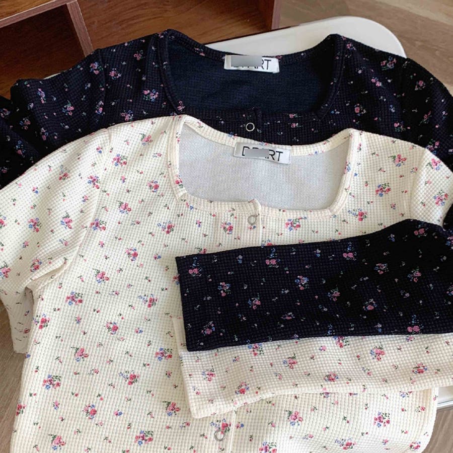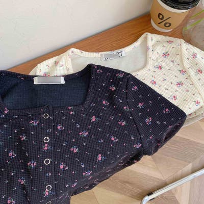 ゆるカワコーデ☆フラワープリント スクエアネック ショート丈 ニットトップス
